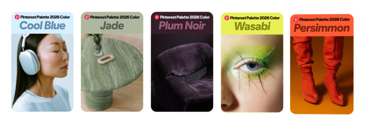 Цвета сезона 2026 по версии Pinterest — Cool Blue, Jade, Plum Noir, Wasabi и Persimmon.