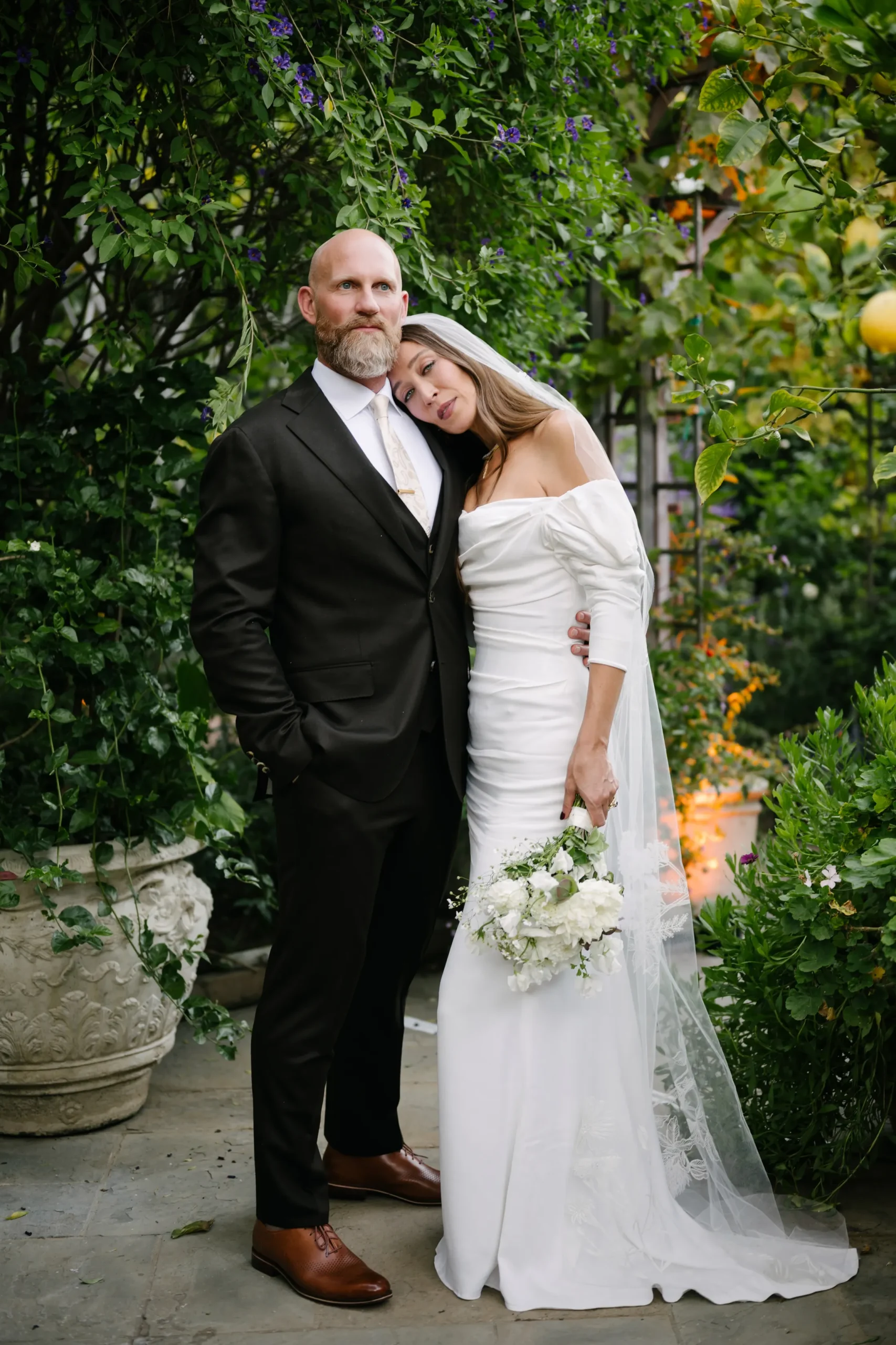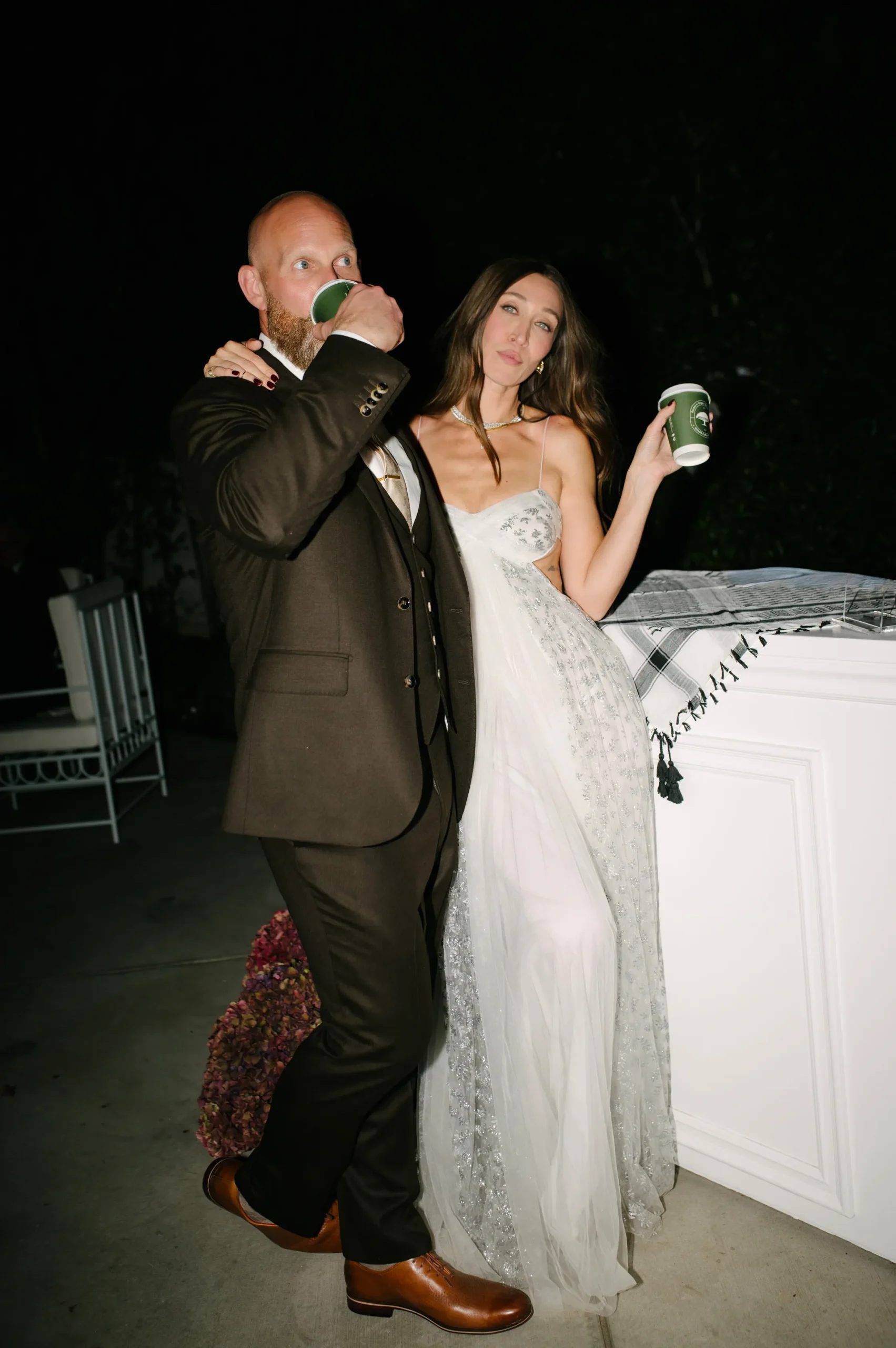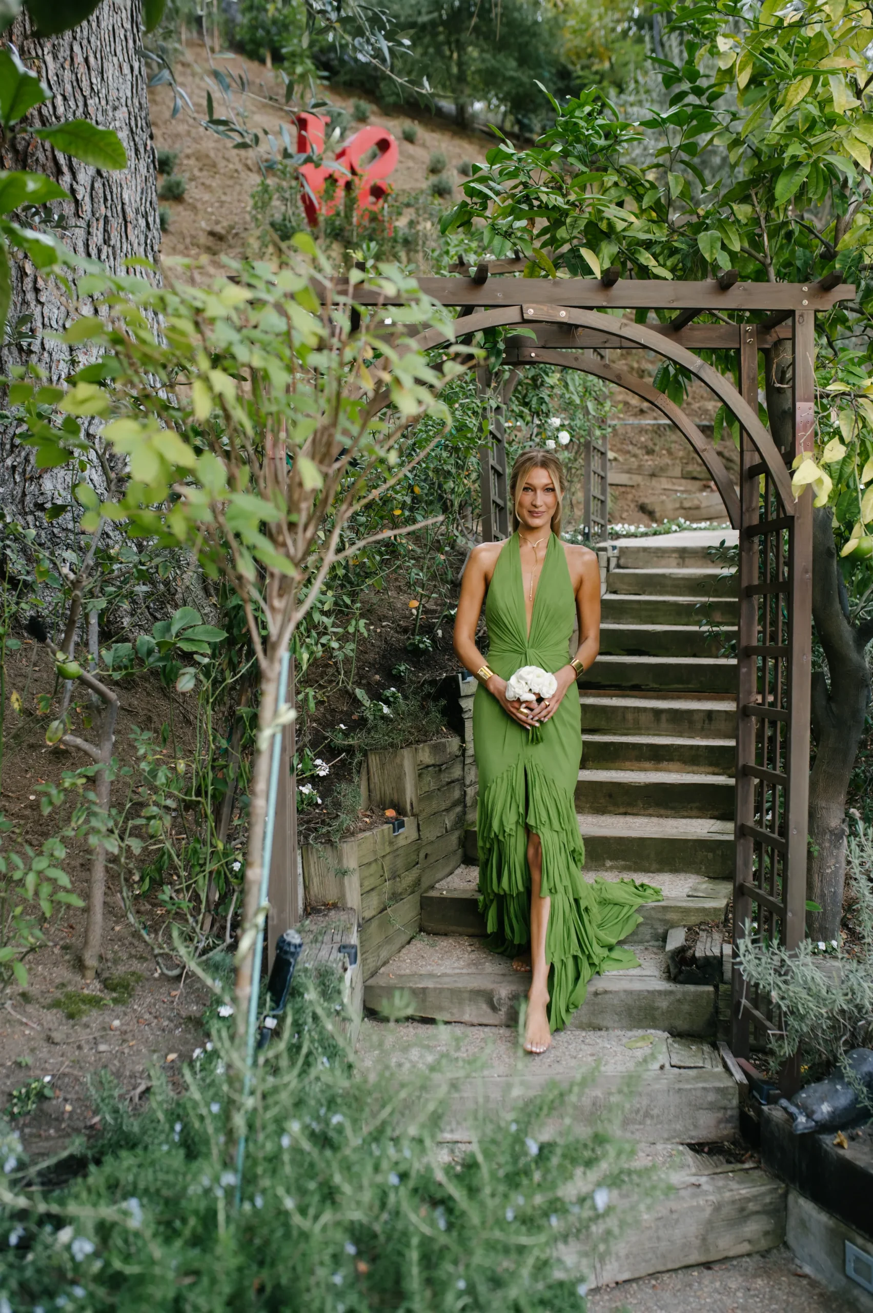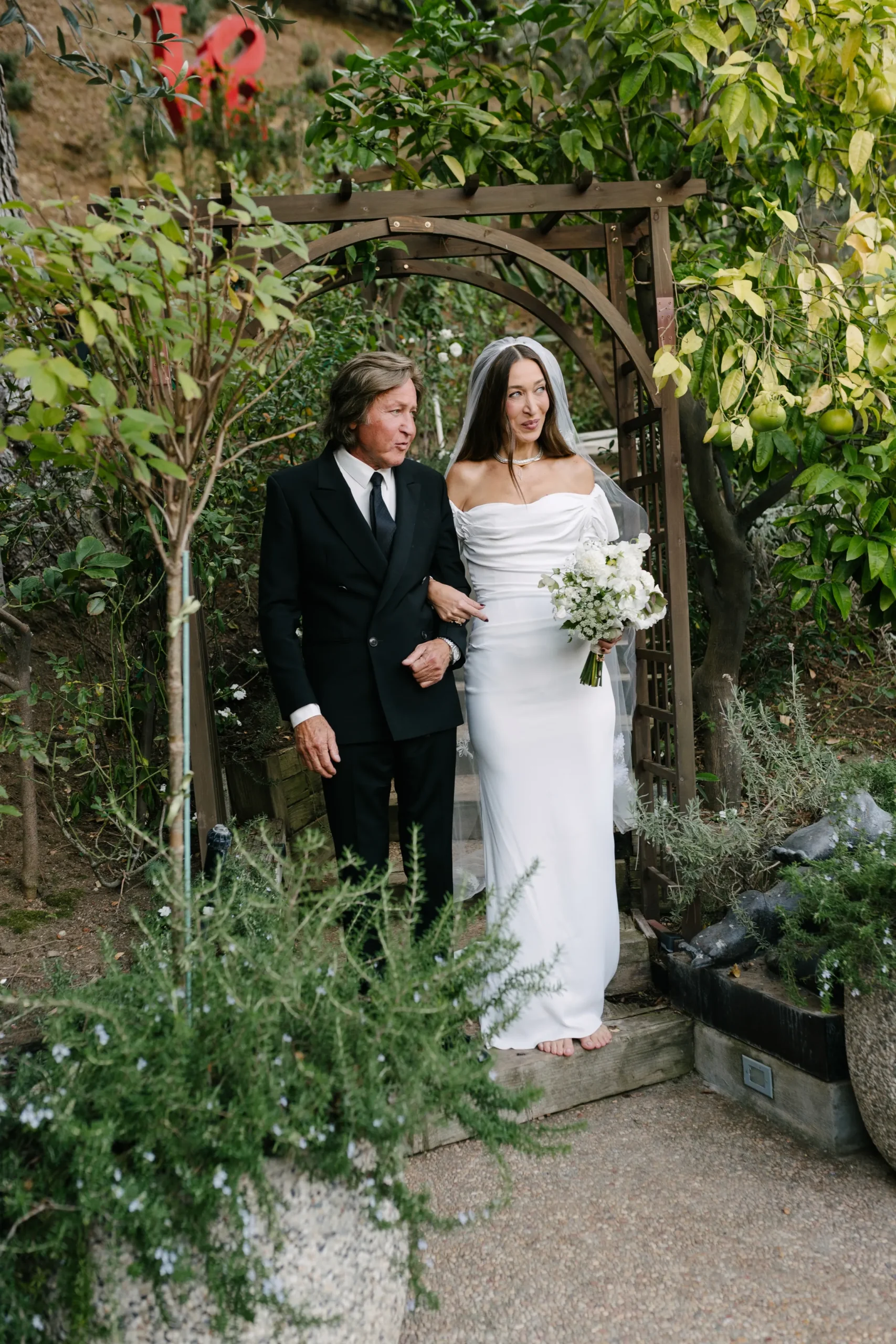 Свадебное платье невеста мечтала найти в винтажном стиле, хотя сомневалась, что подберёт фасон по росту. К счастью, она нашла архивное платье от Vivienne Westwood. Образ дополнили аметистовые серьги её матери Мэри, несколько ожерелий от Dorsey и изготовленное на заказ обручальное кольцо с бриллиантами от Sofia Kaman.