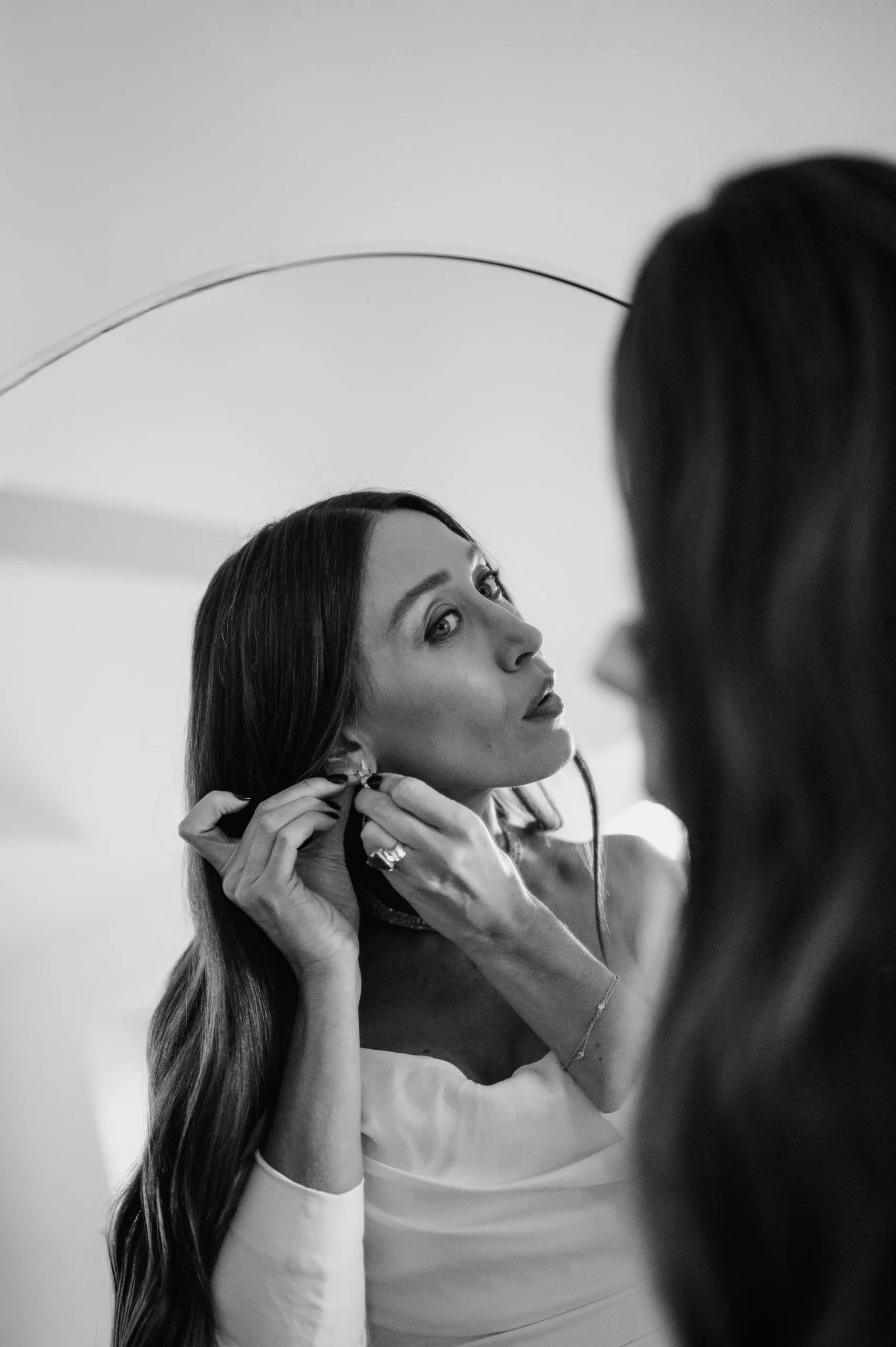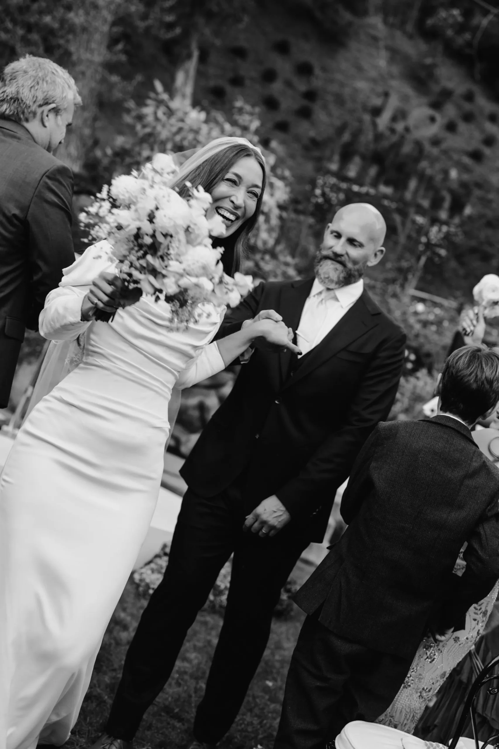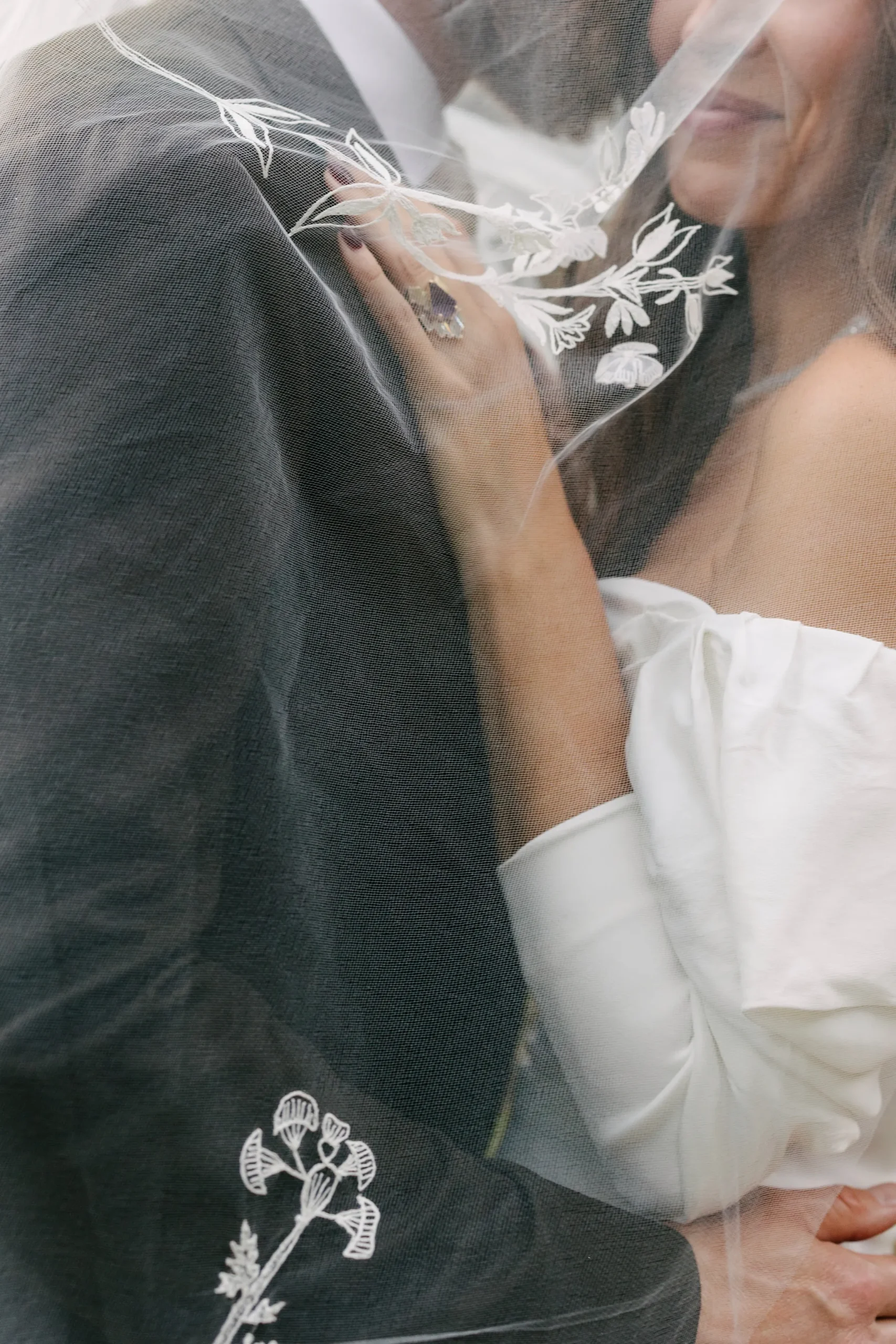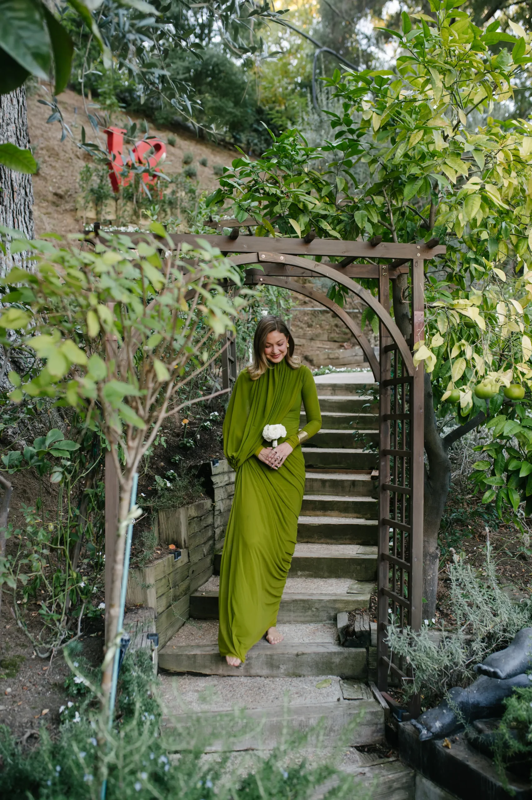 Свадебное платье невеста мечтала найти в винтажном стиле, хотя сомневалась, что подберёт фасон по росту. К счастью, она нашла архивное платье от Vivienne Westwood. Образ дополнили аметистовые серьги её матери Мэри, несколько ожерелий от Dorsey и изготовленное на заказ обручальное кольцо с бриллиантами от Sofia Kaman.