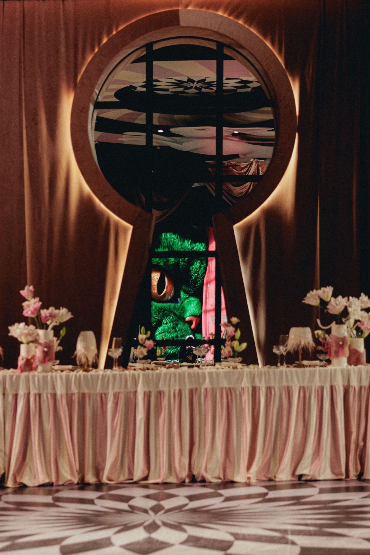 Розовые фламинго, стилизованный Чеширский кот на экране, чёрно-белый пол в ромб, кролики, — каждая деталь создавала ощущение Страны чудес вокруг. Больше всего меня впечатлила меховая розовая отделка элементов декора — именно на чём-то таком мохнатом, по моему мнению, и лежала гусеница, которая курила кальян и спрашивала у Алисы: «Whoooo areee youuu?». Эта фраза отложилась у меня где-то на подкорке мозга, так как я училась на переводчика, и на фонетическом зачёте мы наизусть «сдавали» отрывок с верными интонациями из «Алисы». И правда, оказалось, что эта тематика во всех аспектах про меня.