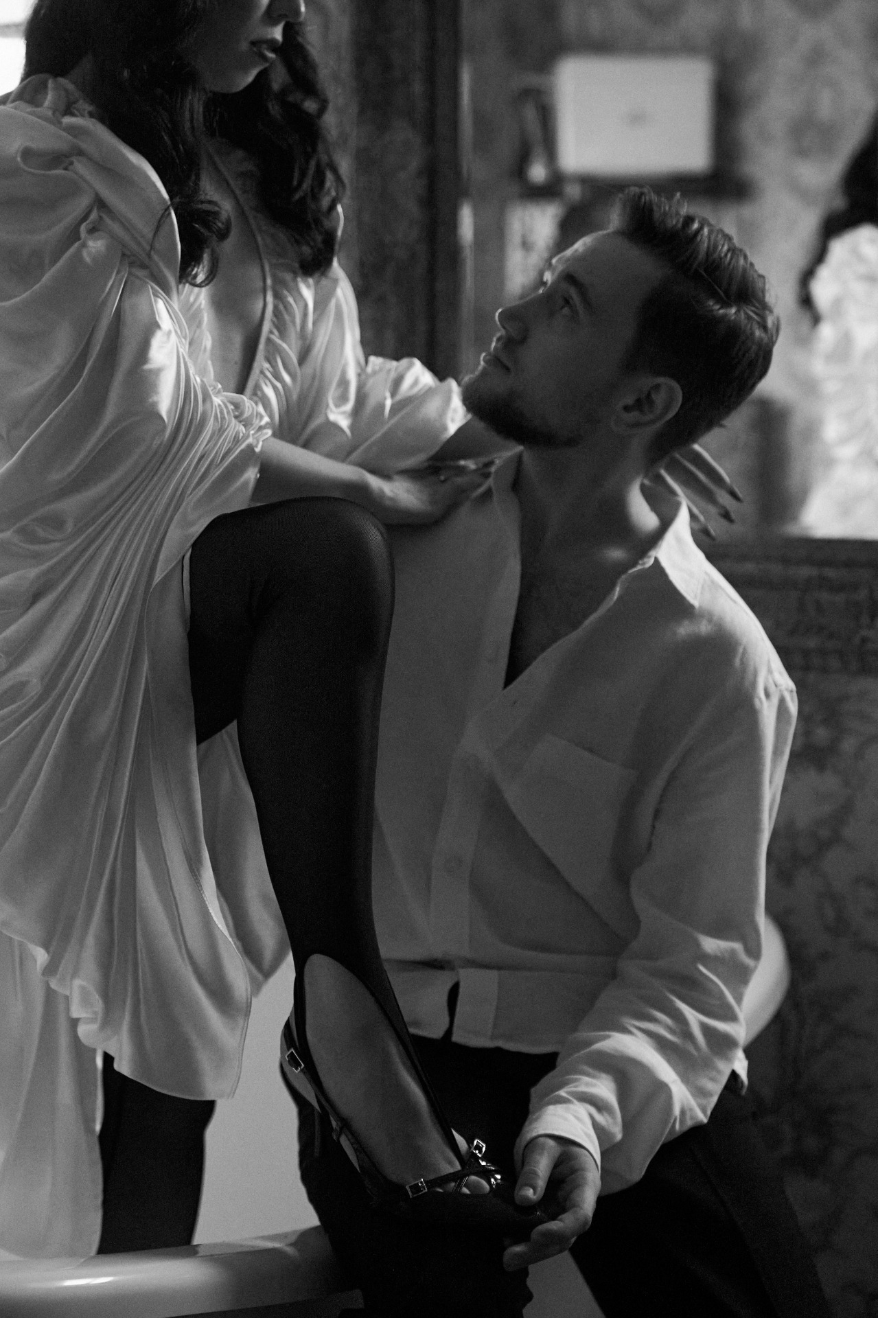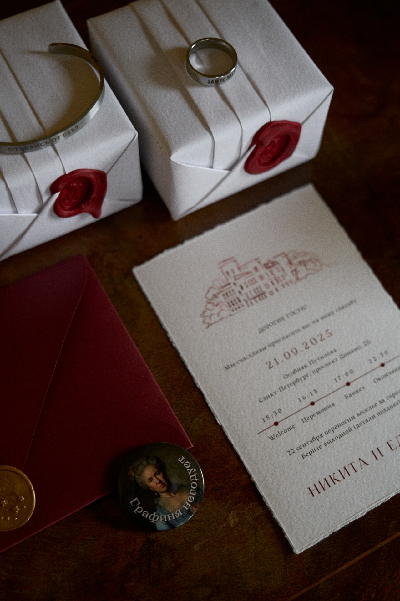 Финальным и самым личным штрихом стала брошь, которую с любовью и вниманием к деталям подобрала Лена. Каждый элемент гардероба был частью нашей общей истории.