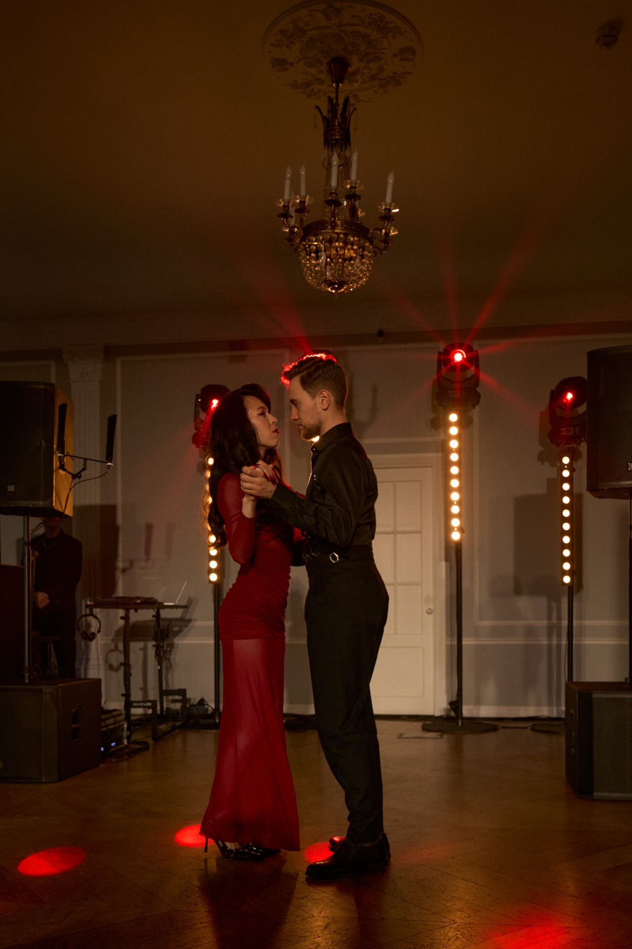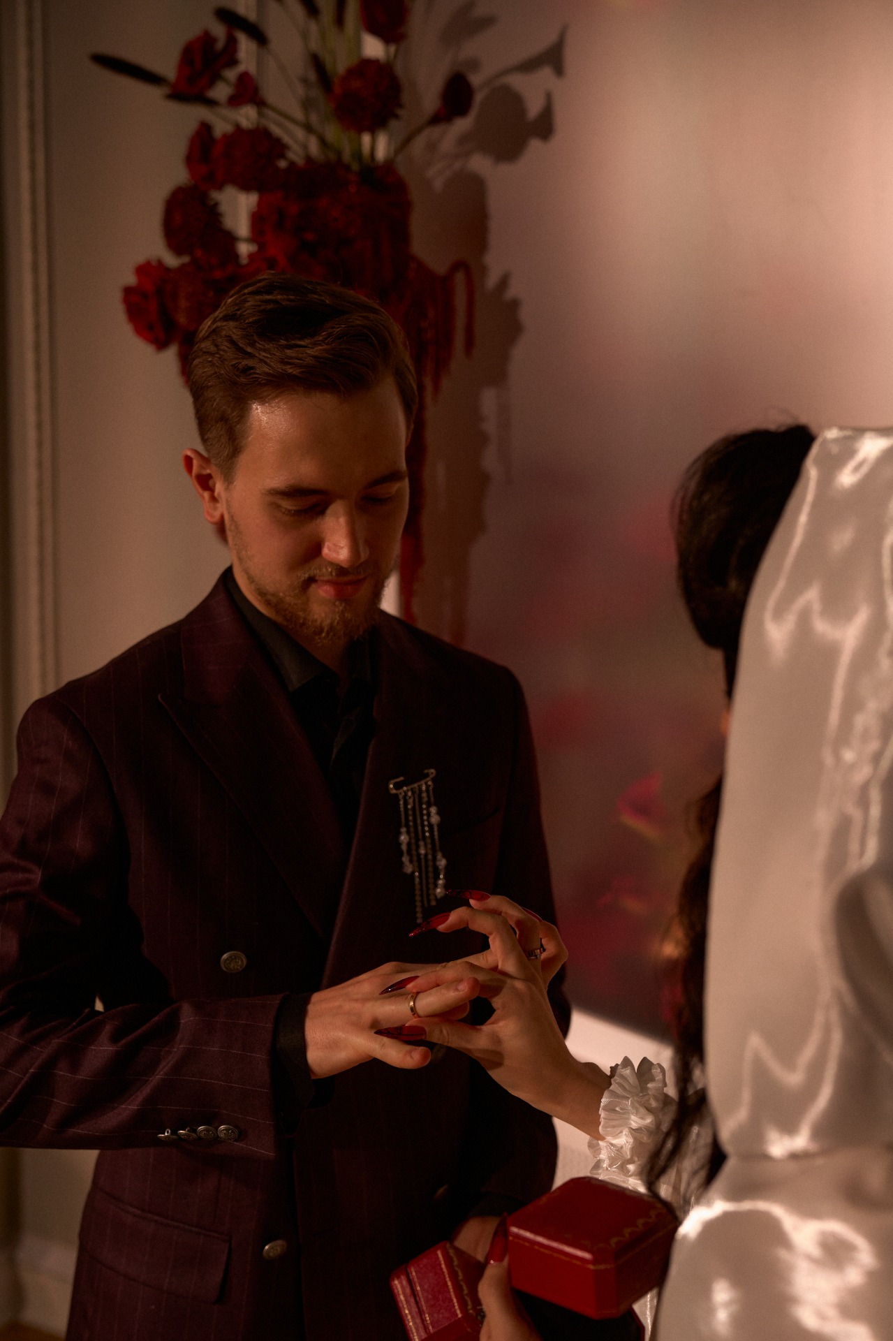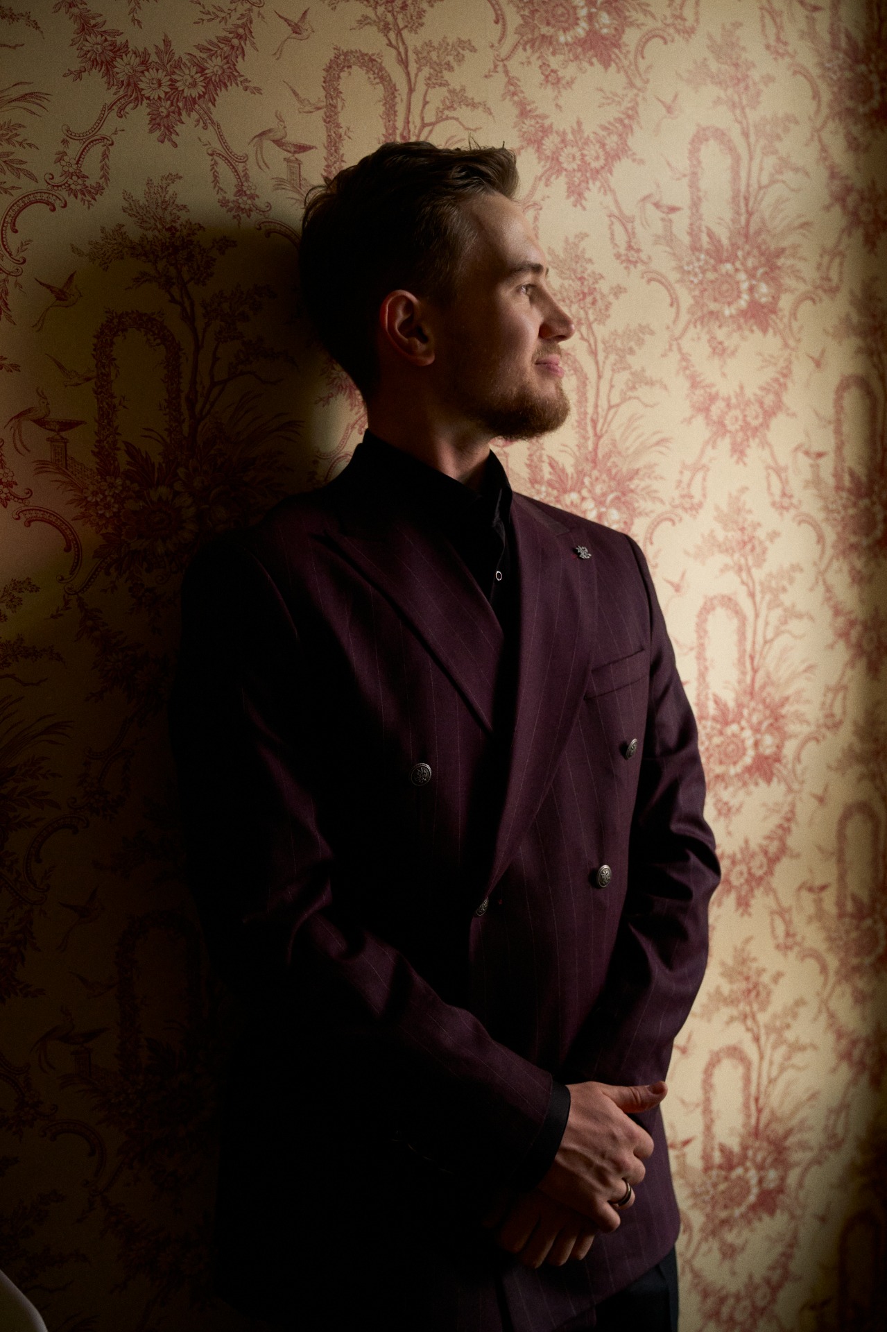 Я изначально хотел избежать классического чёрного костюма, чтобы выделяться на фоне гостей в дресс-коде total black. Поиски привели меня к элегантному двубортному пиджаку в бордовую полоску, который сразу задал тон всему образу. К нему мы подобрали идеально сидящие чёрные брюки, рубашку и туфли. Для особенного акцента во время первого танца мы добавили чёрные подтяжки.
