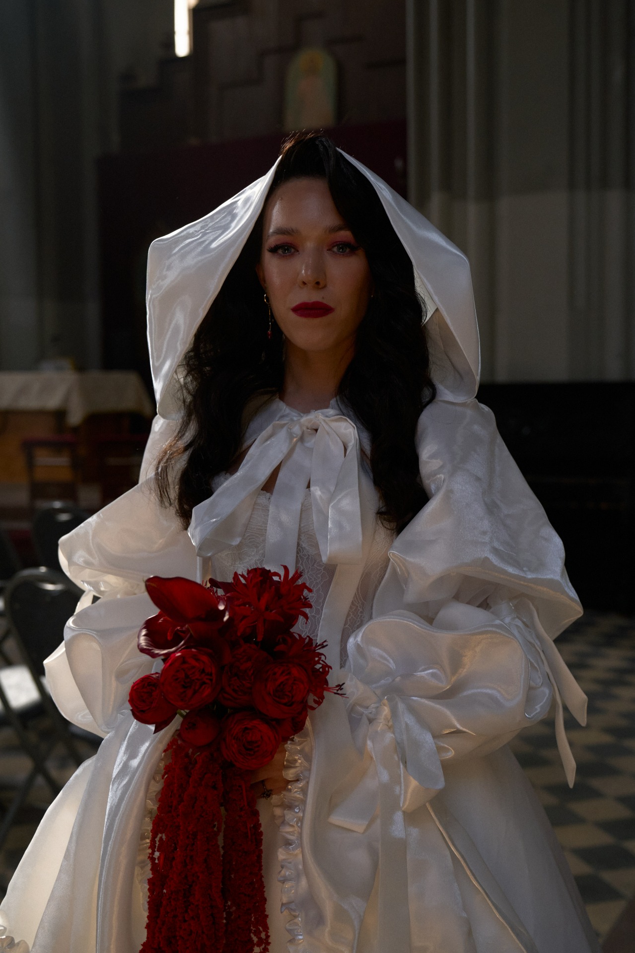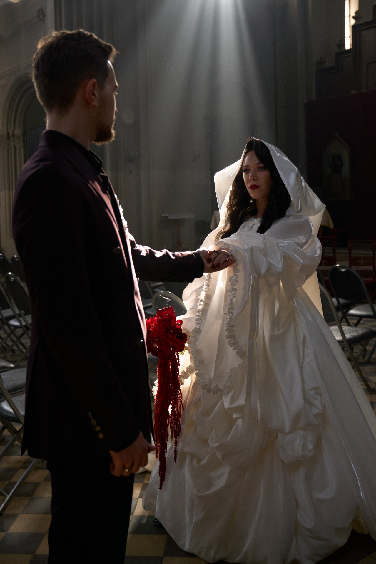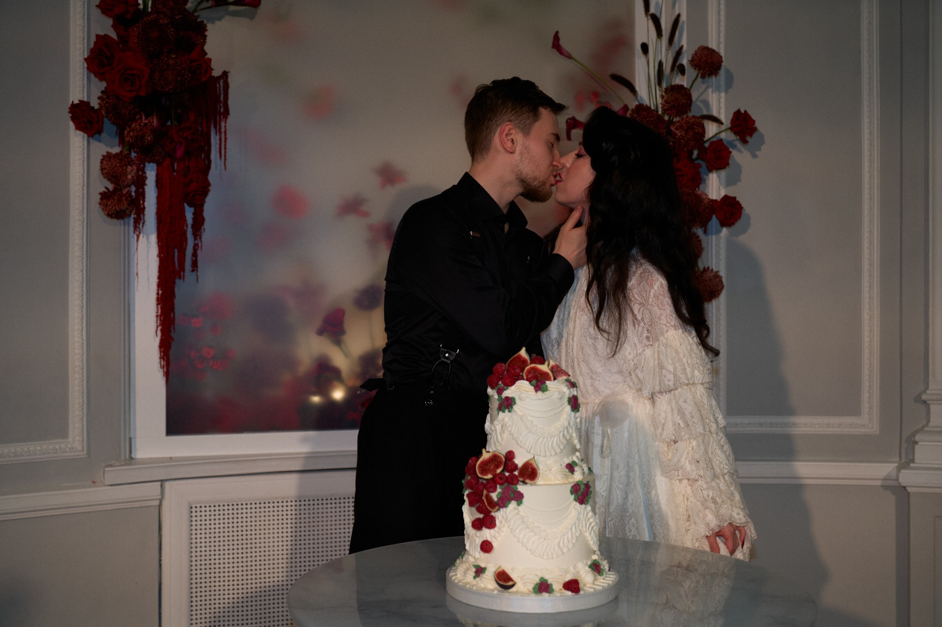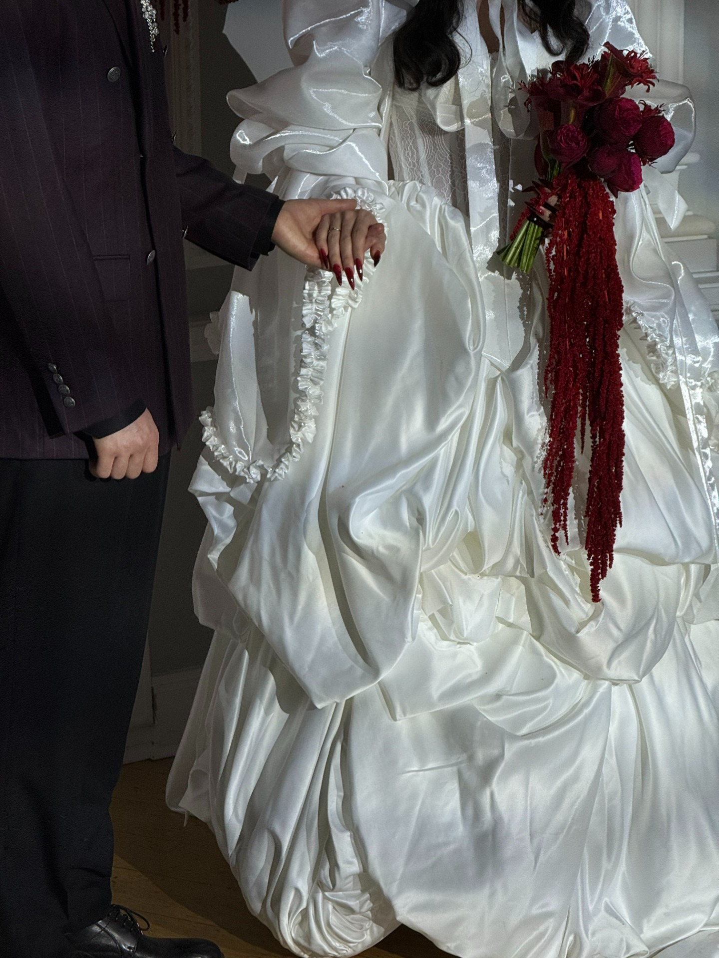 Макияж с бордовыми глазами, ретро-укладка, вдохновлённая образом Настасьи Самбурской, и украшения в винном оттенке завершали картину. Даже обувь стала квестом — я до последнего искала идеальные ботинки с квадратным мыском, и свою идеальную пару я нашла у бренда Lalou. Специально к свадьбе я рассталась с цветными волосами, вернувшись к натуральному оттенку для целостности образа. Получился образ Белоснежки, но в духе клипа Rammstein — сильной, элегантной и с характером.