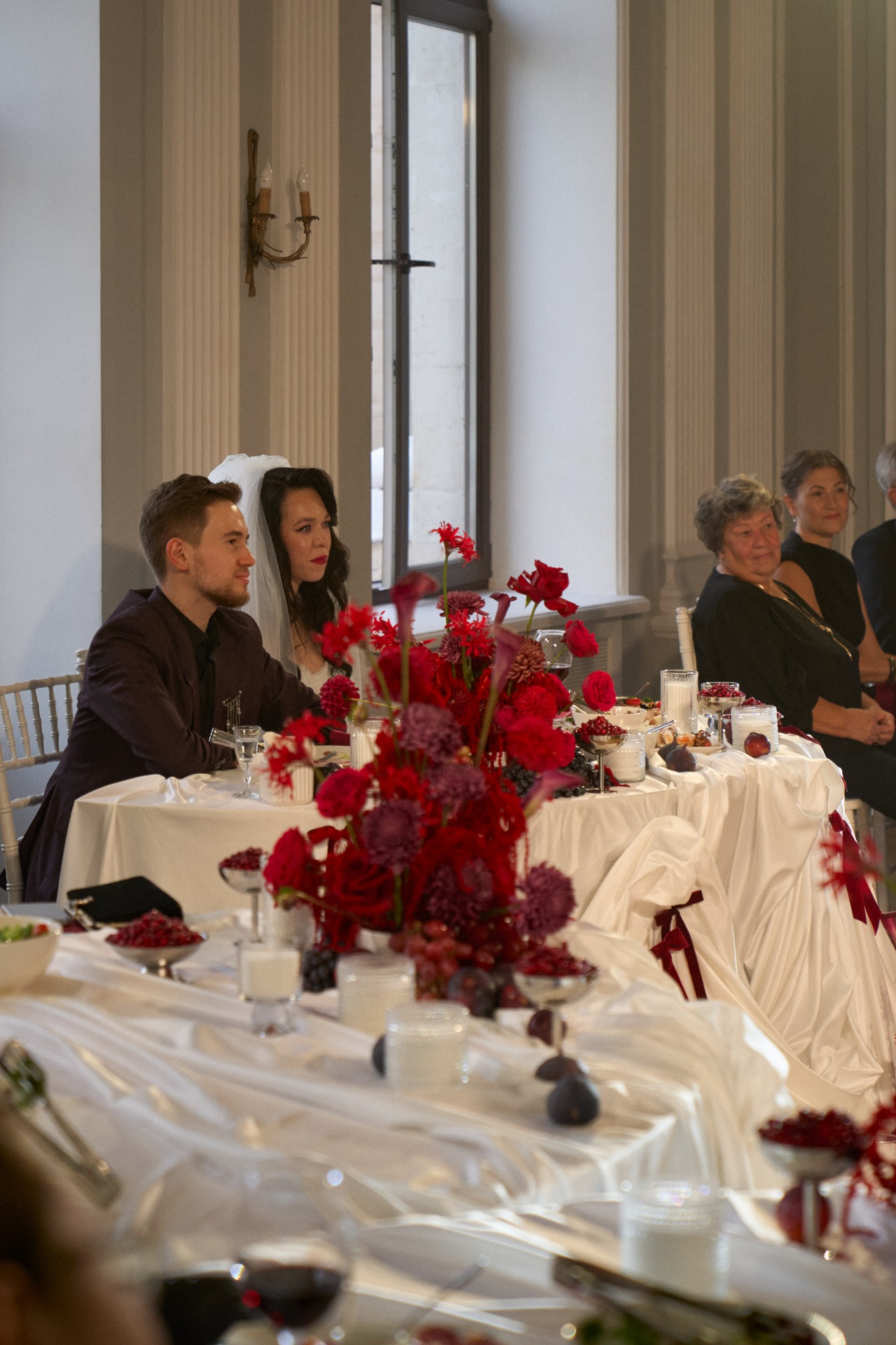 Обязательными элементами стали фуд-декор с северными ягодами в изящных креманках, сливами и инжиром, множество свечей и наша слабость — роскошные драпированные скатерти, от которых мы просто не смогли отказаться.