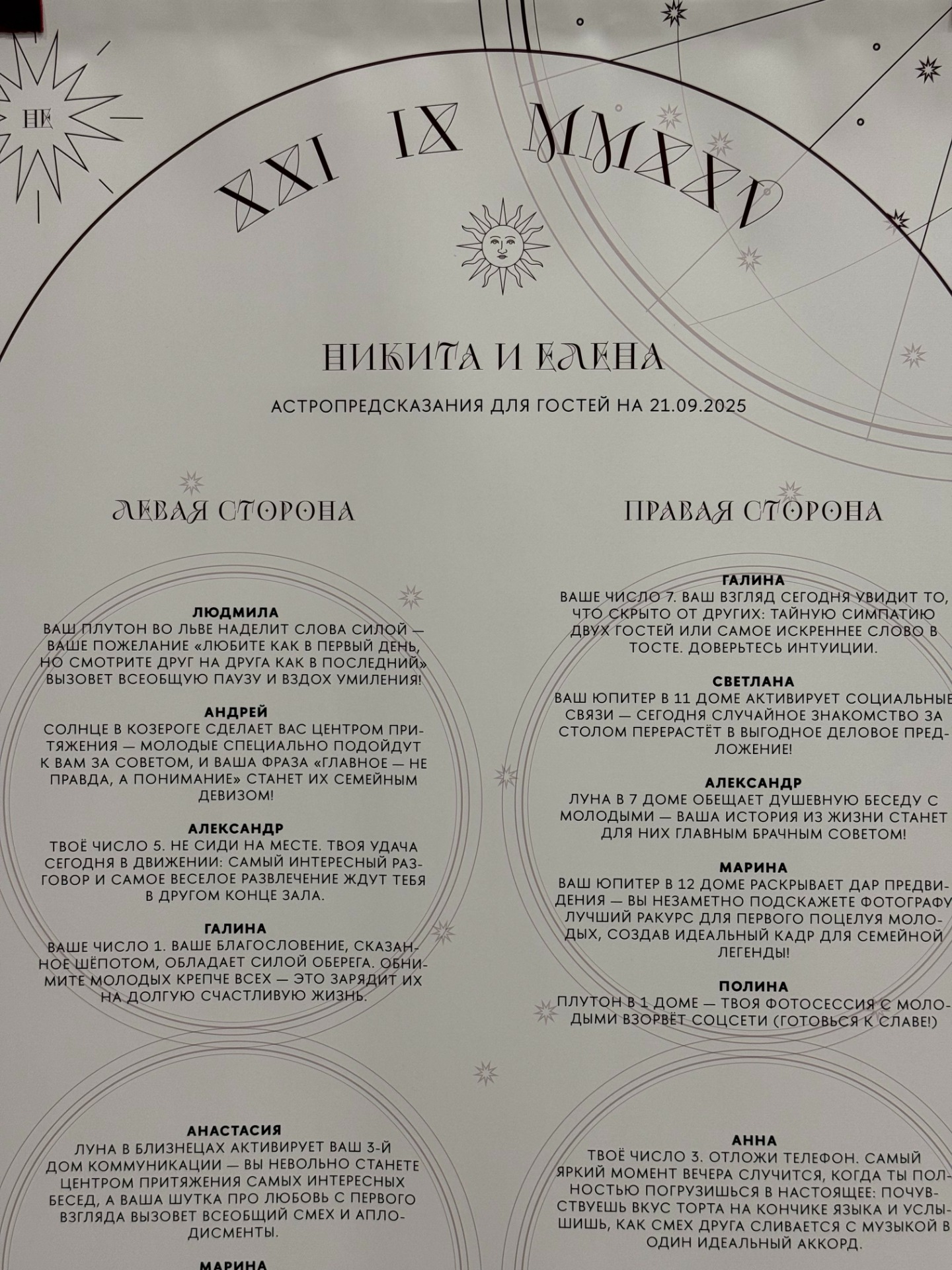 Мы вложили душу в организацию праздника для гостей: придумали забавные вопросы о нас для викторины, составили персональные предсказания по датам рождения, для каждого написали от руки тёплые письма, для упаковки которых заказали в типографии собственные наклейки. А завершился вечер настолько трогательными словами ведущего, что даже я не смог сдержать слёз.