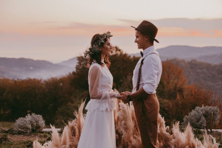 Стиль бохо покоряет сердца большинства невест своей неповторимостью и разнообразием. Главный акцент декора — пампасная трава и высушенные цветы в пудрово-бежевых тонах. Палитра образов пары: натуральные оттенки коричневого, зеленого и белого, которые здорово сочетаются с осенней гаммой природы.