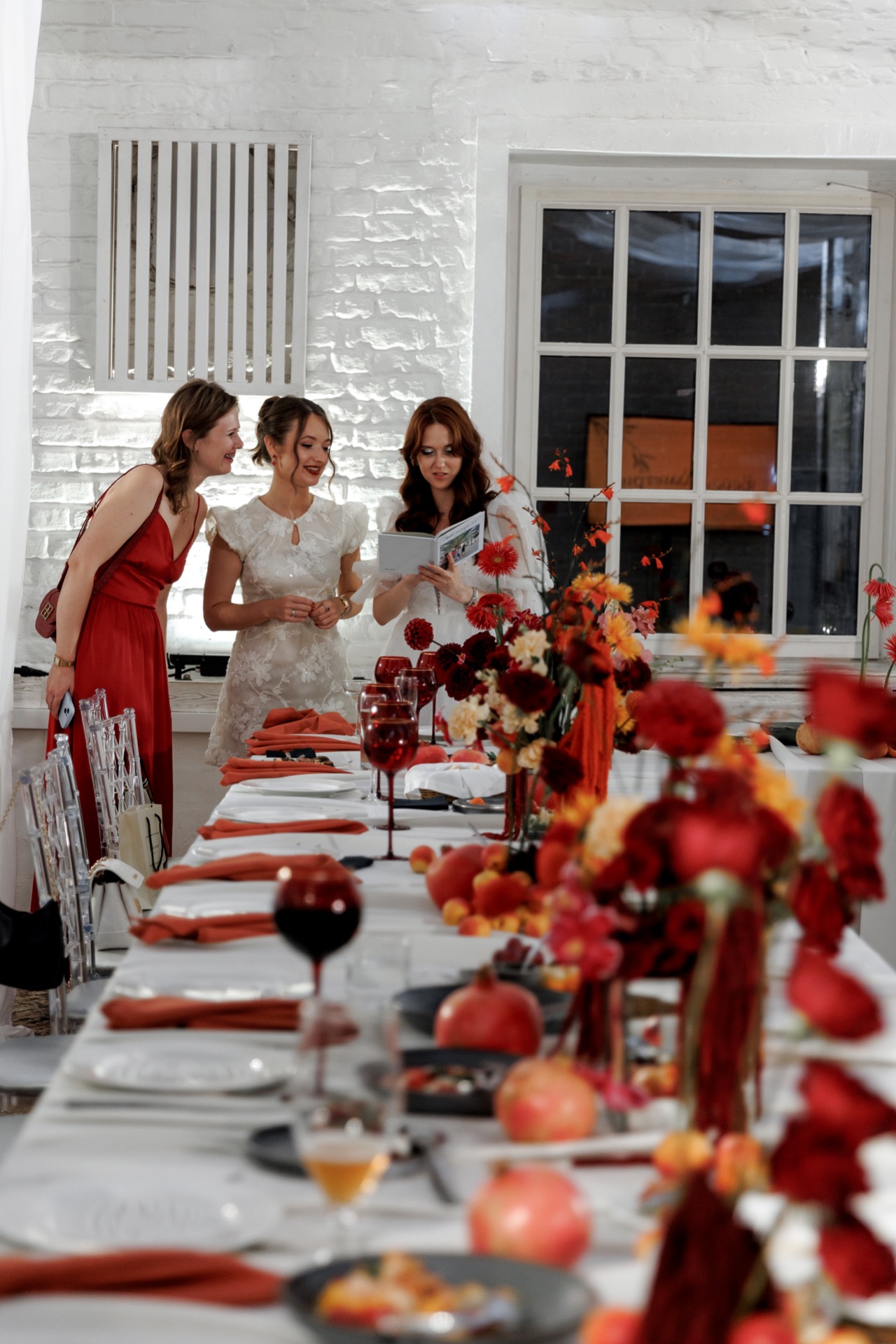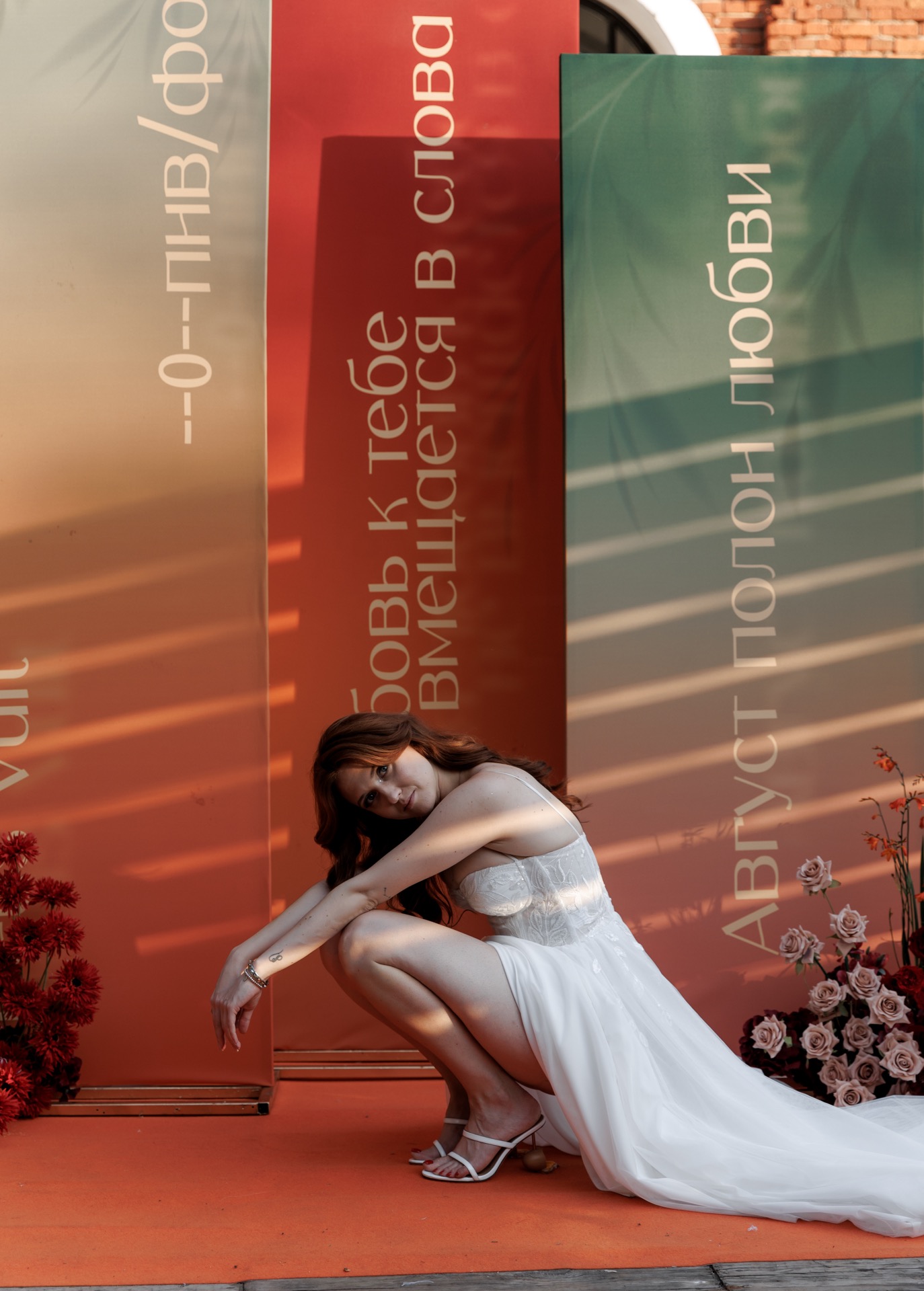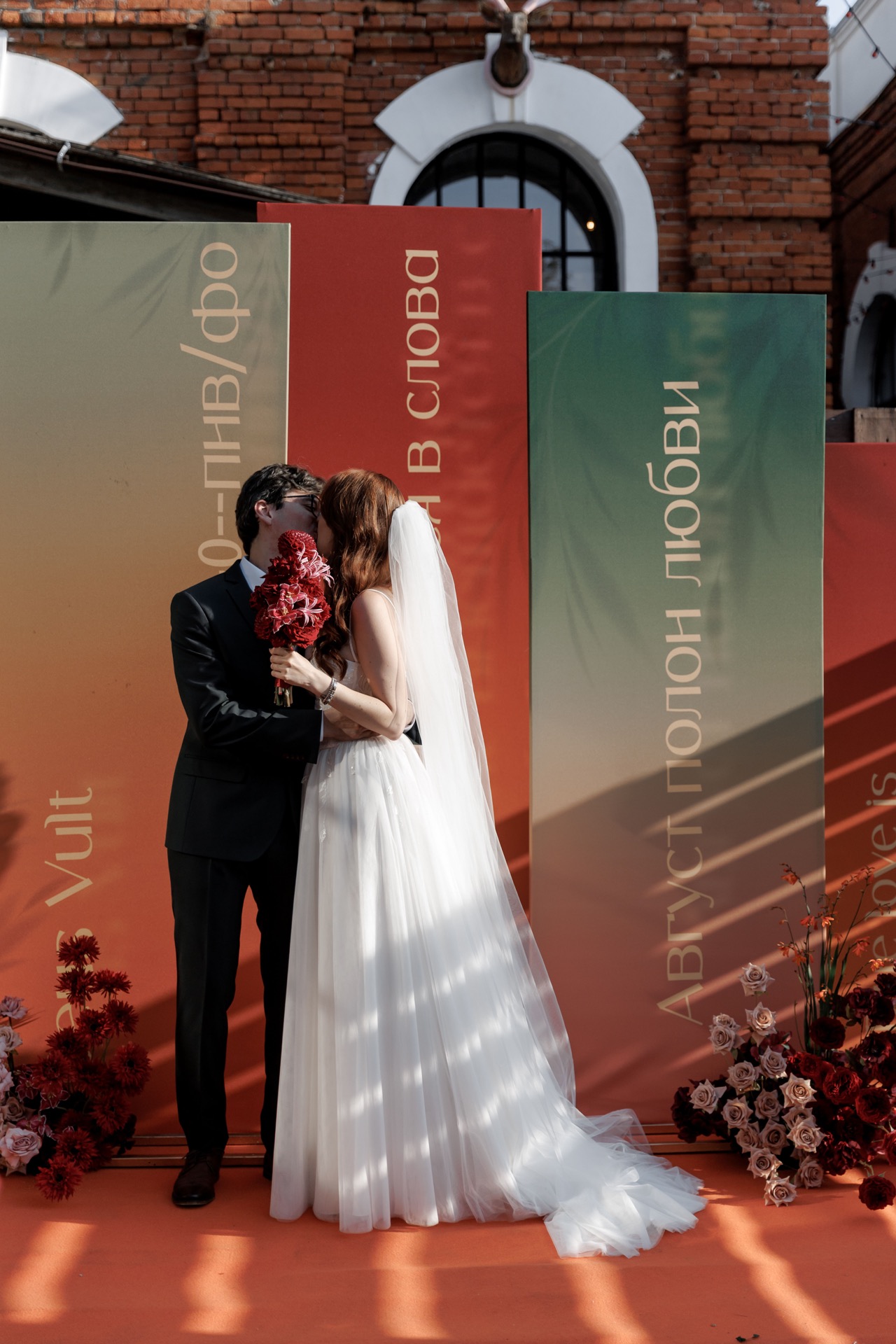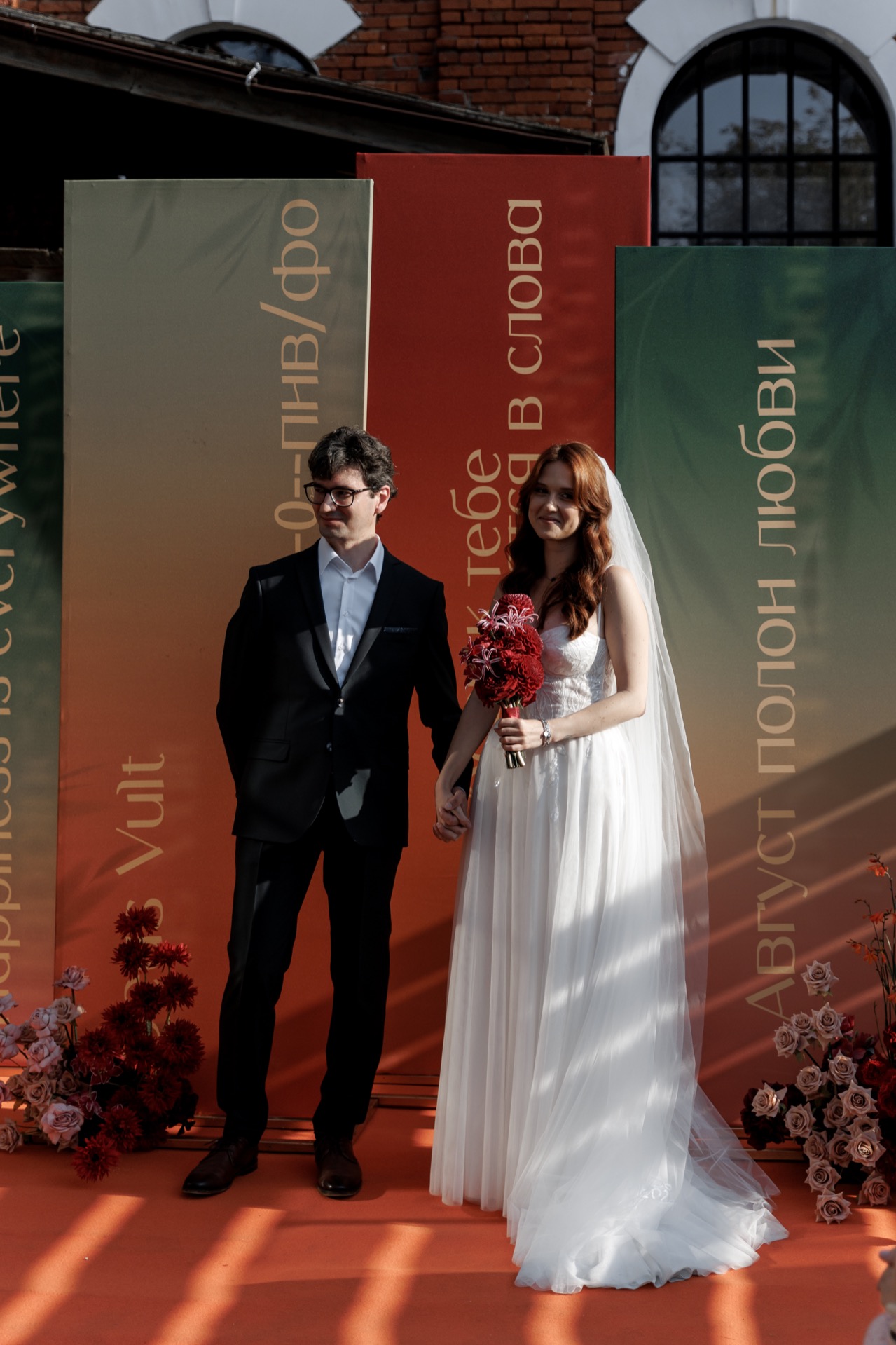 У меня были референсы того, как я себе представляла декор и палитру. Хотелось лёгкости, но при этом, чтобы в декоре присутствовали глубокий бордовый цвет, рыжие и зеленые оттенки. От этого и отталкивались. Получилось в миллион раз круче, чем было на картинке! Девочки очень чутко подошли к нашим пожеланиям, всё учли, предлагали классные идеи, которые потом круто воплотились в реальность. Ярка зона церемонии с зашифрованными фразами добавила элемент таинственности.