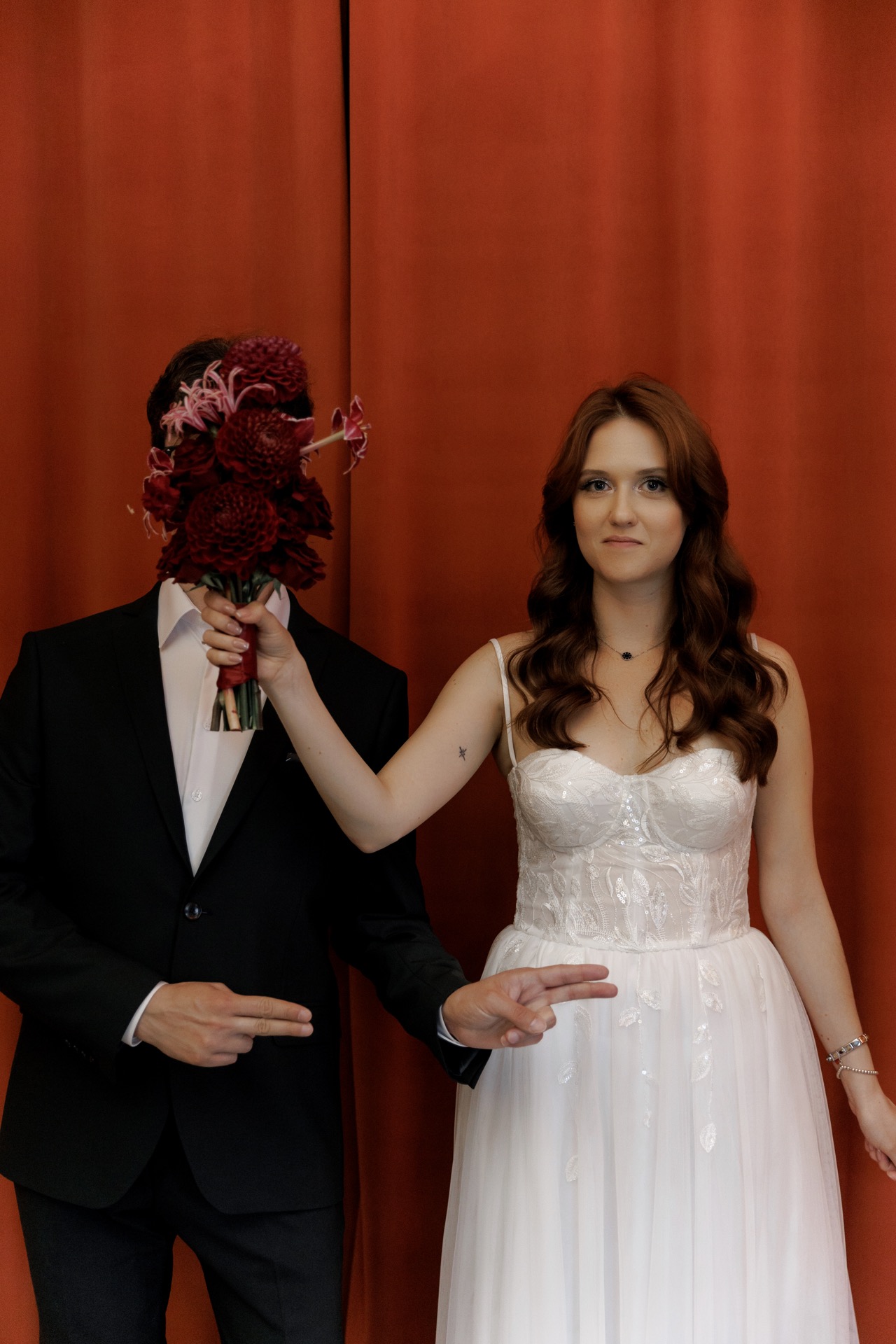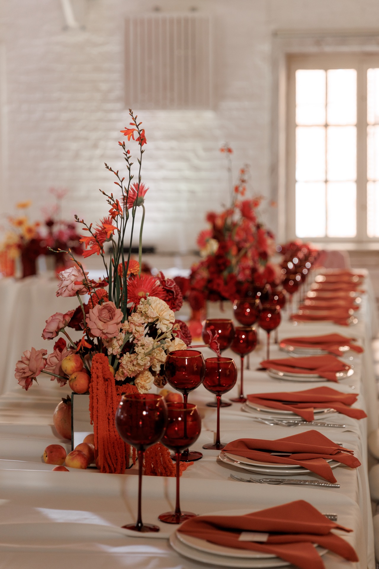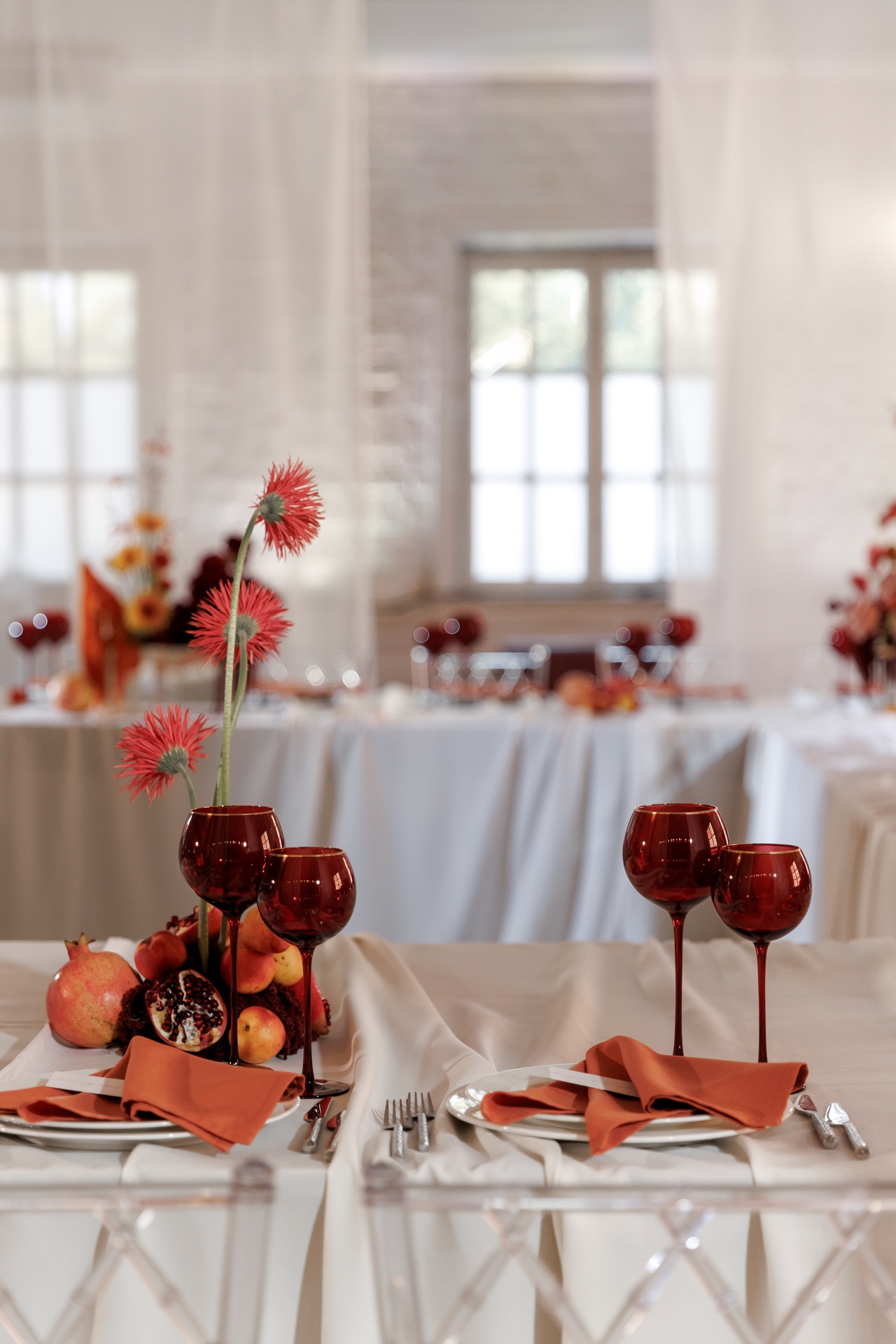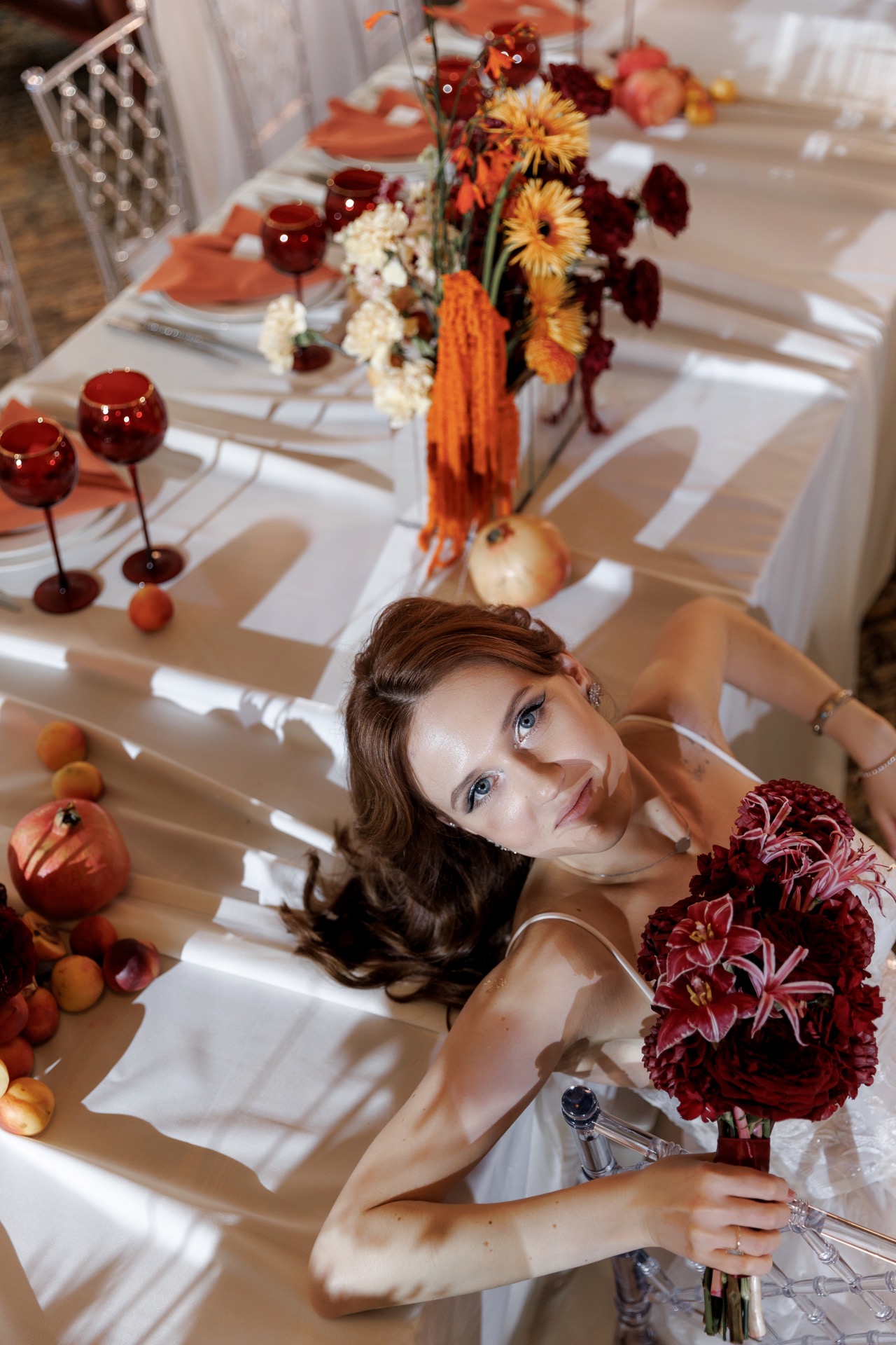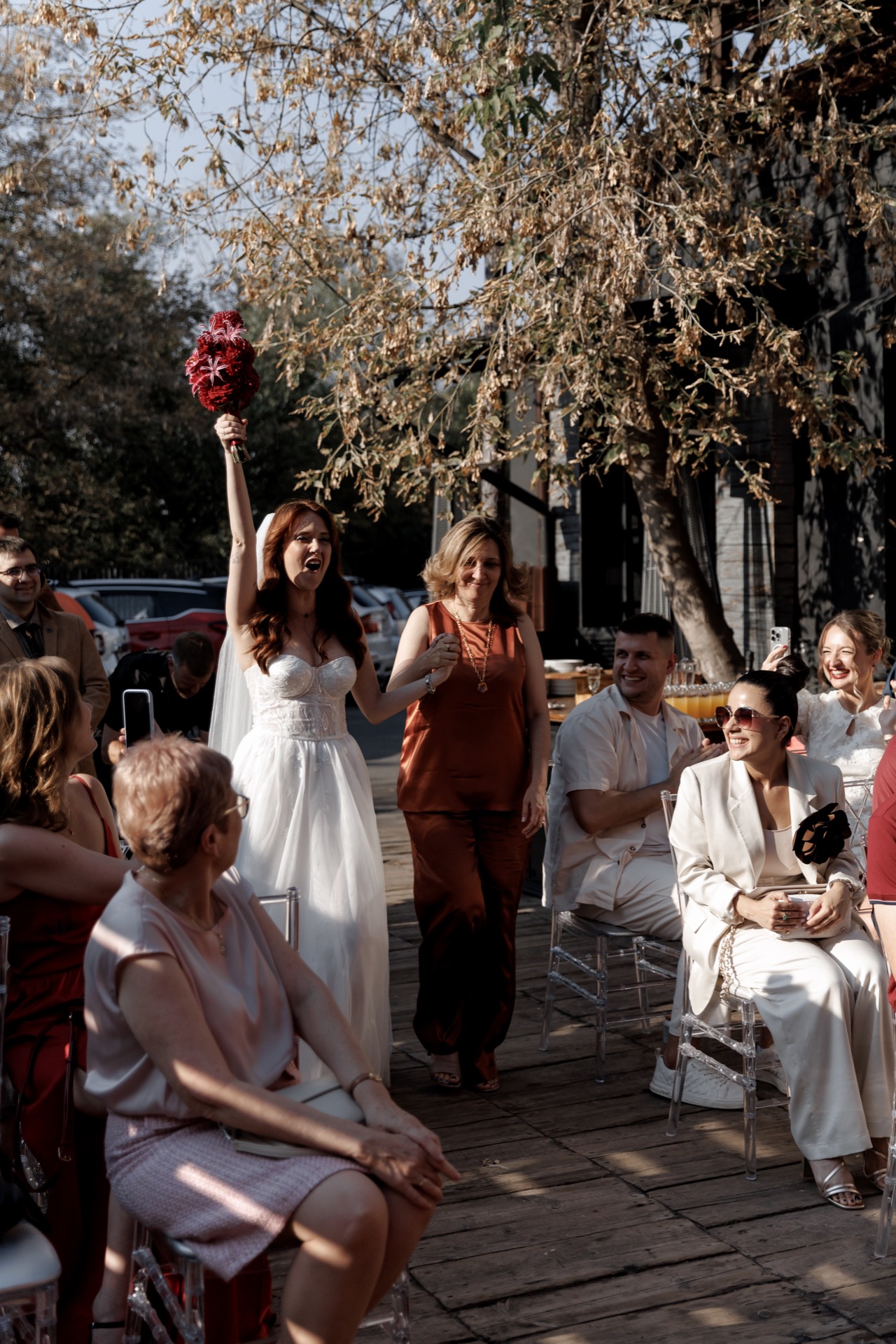 У меня были референсы того, как я себе представляла декор и палитру. Хотелось лёгкости, но при этом, чтобы в декоре присутствовали глубокий бордовый цвет, рыжие и зеленые оттенки. От этого и отталкивались. Получилось в миллион раз круче, чем было на картинке! Девочки очень чутко подошли к нашим пожеланиям, всё учли, предлагали классные идеи, которые потом круто воплотились в реальность. Ярка зона церемонии с зашифрованными фразами добавила элемент таинственности.