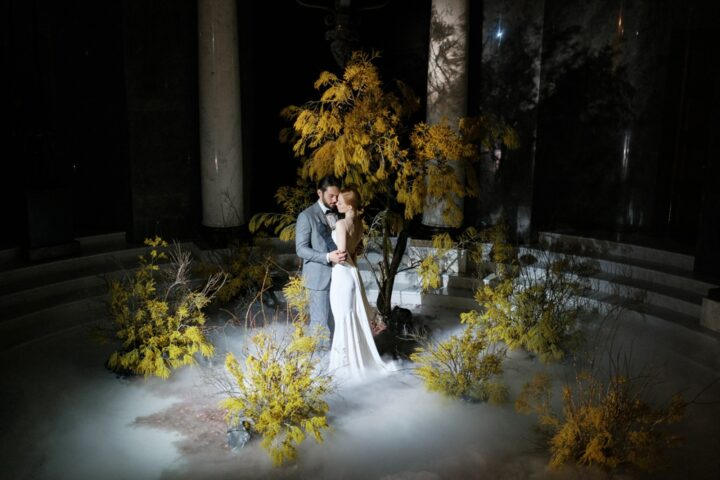 Центральная идея выездной регистрации – уединение влюбленных в туманной полуночной природе весны. Красной нитью через всю концепцию проходила мысль: «Нельзя воссоздать то, чего не существует в природе». Декор ужина продолжал японскую лирику, выражаясь в лаконичных конструкциях за первыми столами и президиумом, формируя общую композицию.