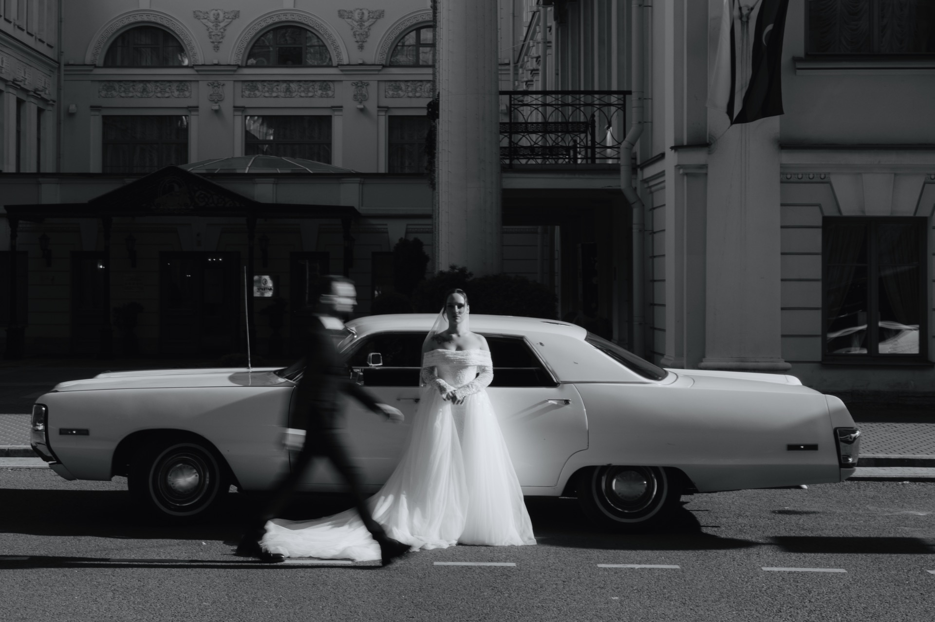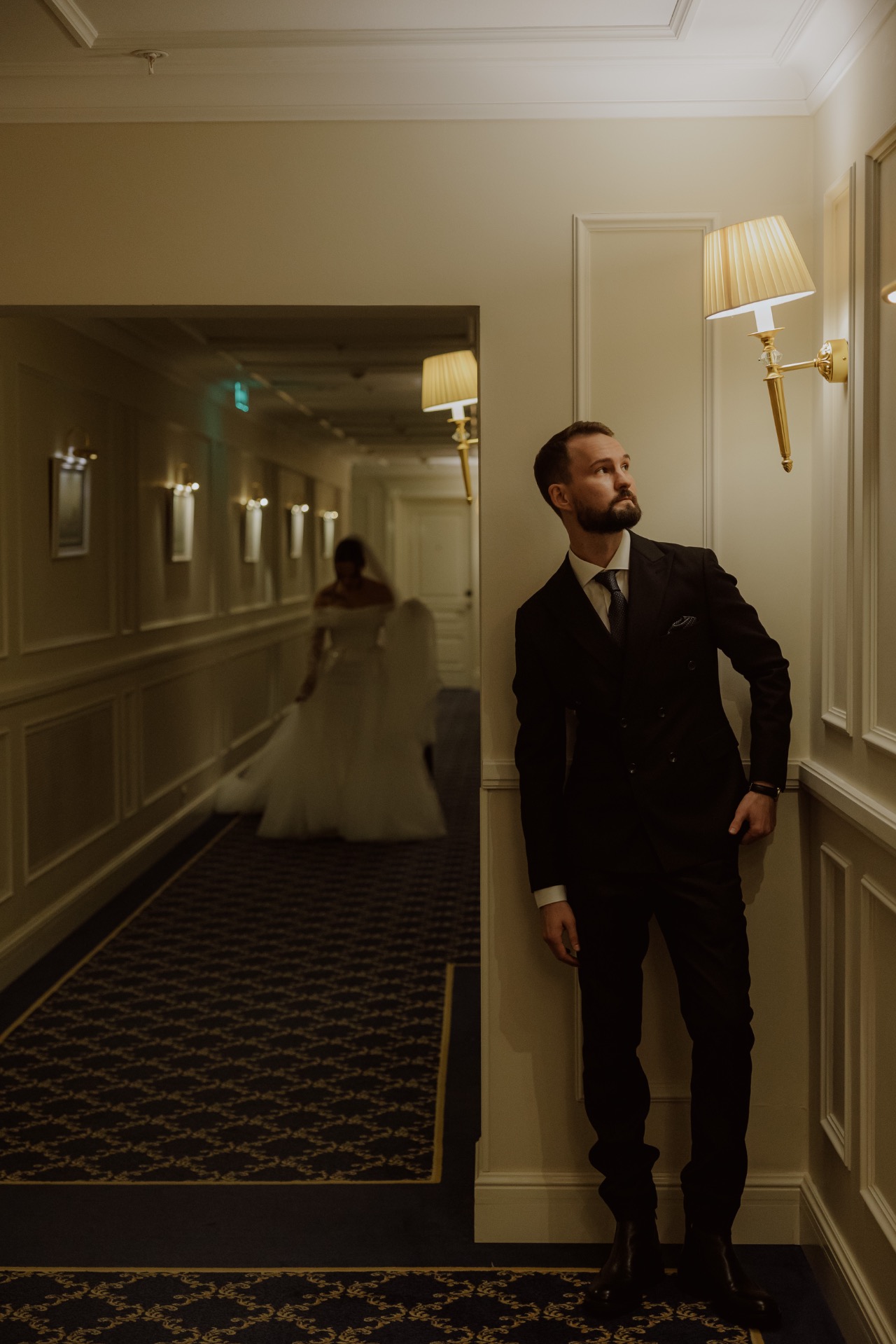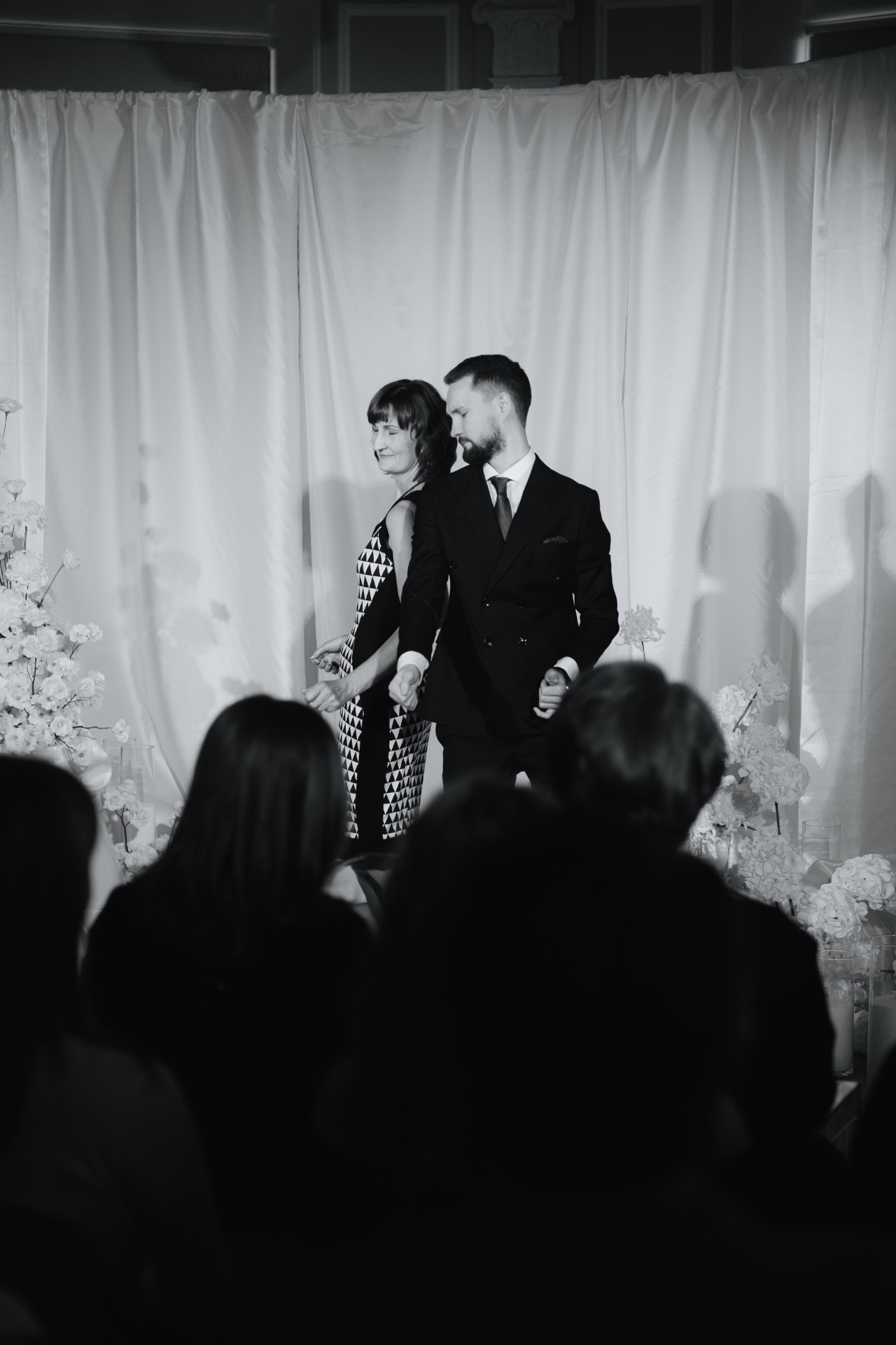 Жених сначала был в элегантном костюме с двубортным пиджаком, а затем сменил его на бадлон.