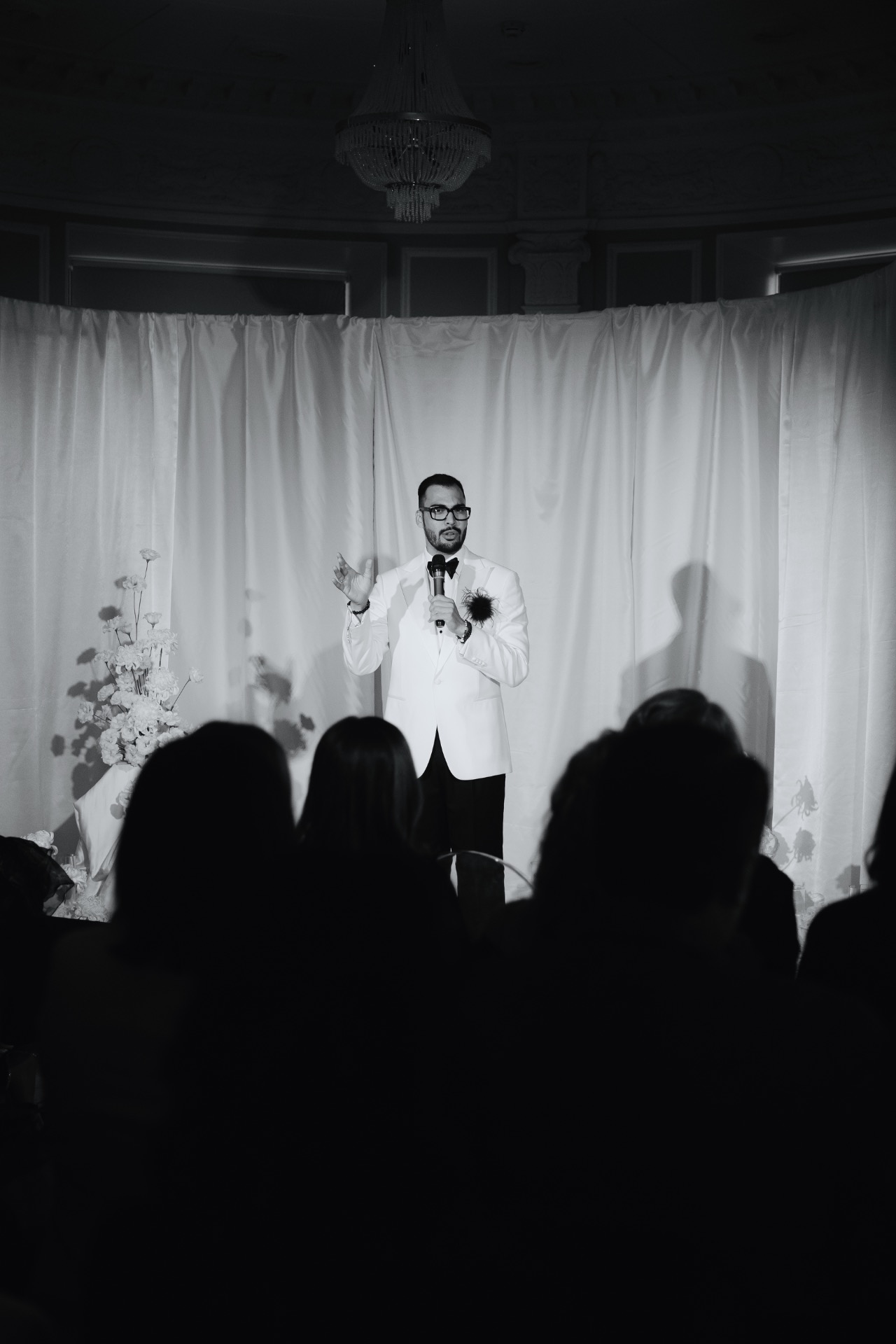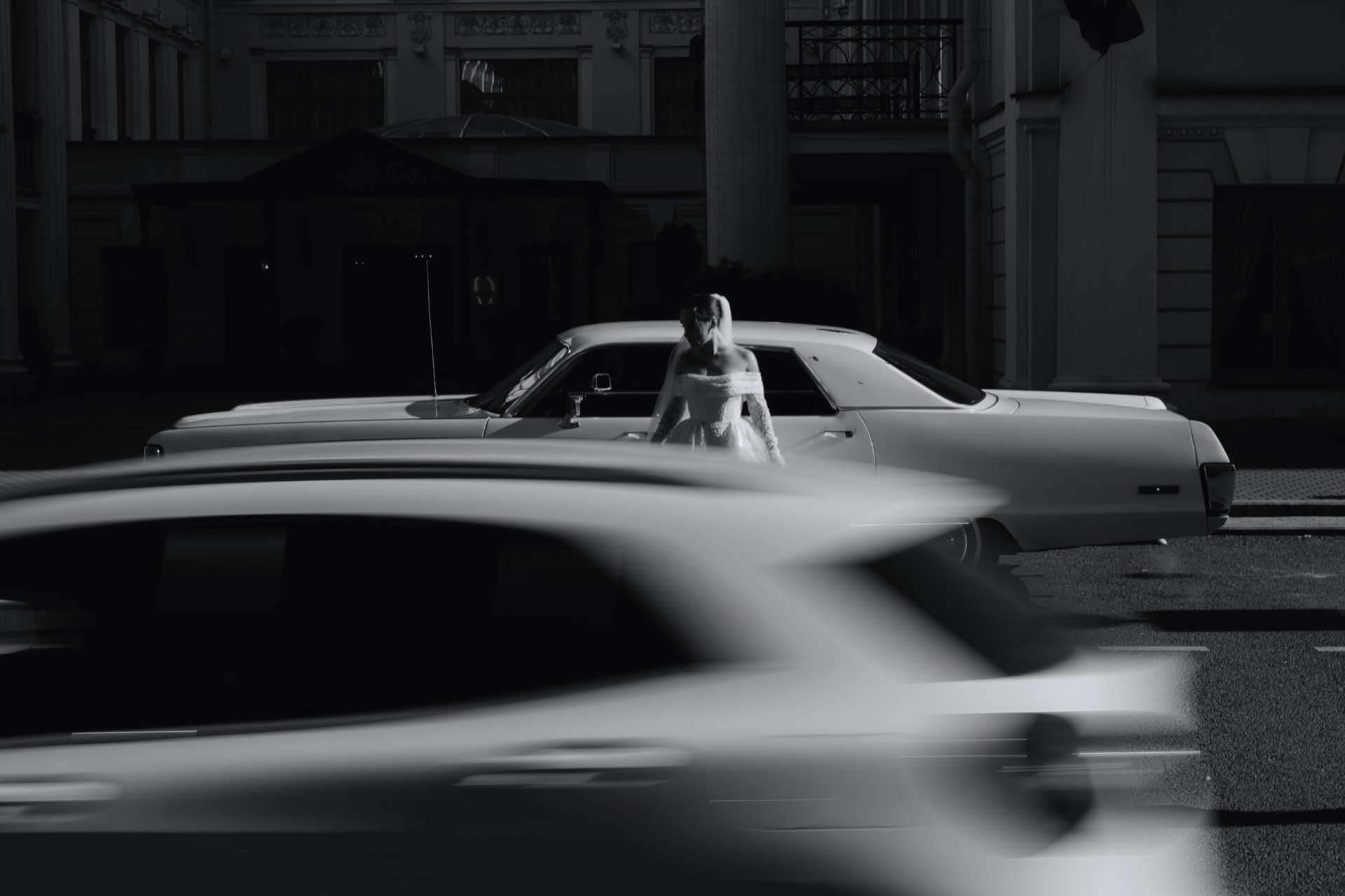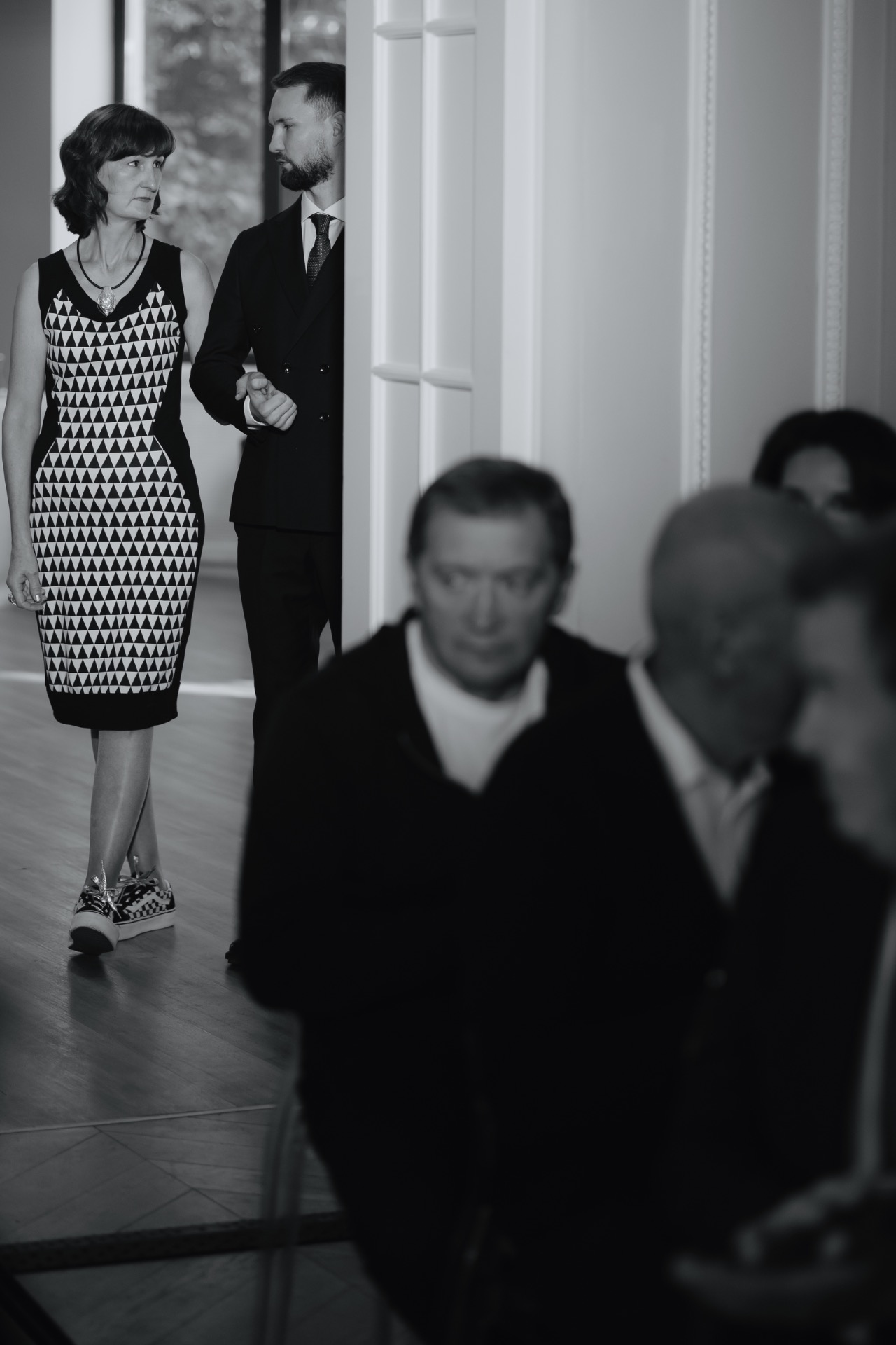 Жених сначала был в элегантном костюме с двубортным пиджаком, а затем сменил его на бадлон.