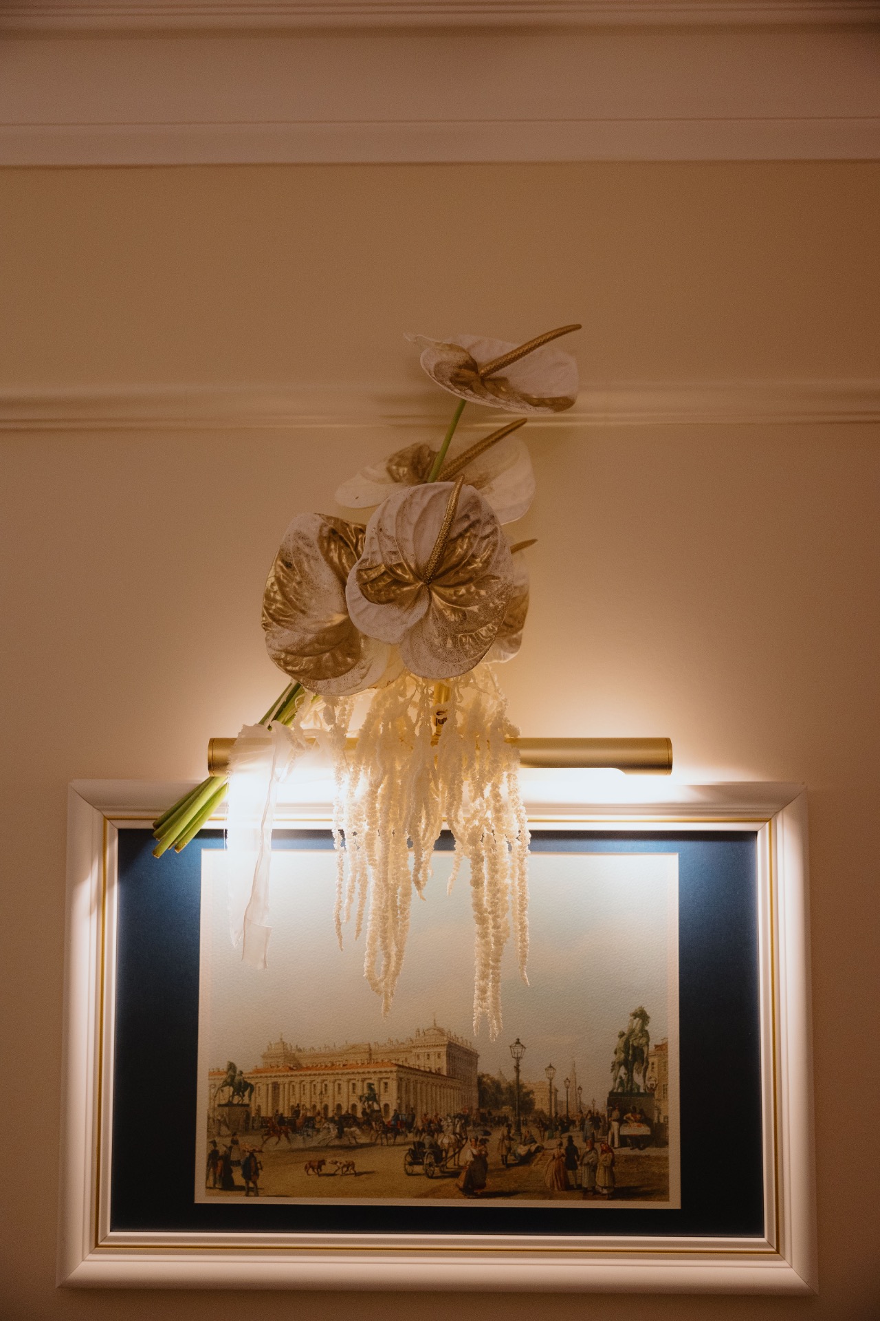 Мы выбрали палитру из золота, белого и чёрного цвета. В качестве площадки у нас был исторический особняк с лепниной, как я мечтала. В декоре были цветы, канделябры, покрытые жемчугом, ткани, что добавляло сказочной атмосферы. Торт тоже был оформлен так, словно был окутан тканями.