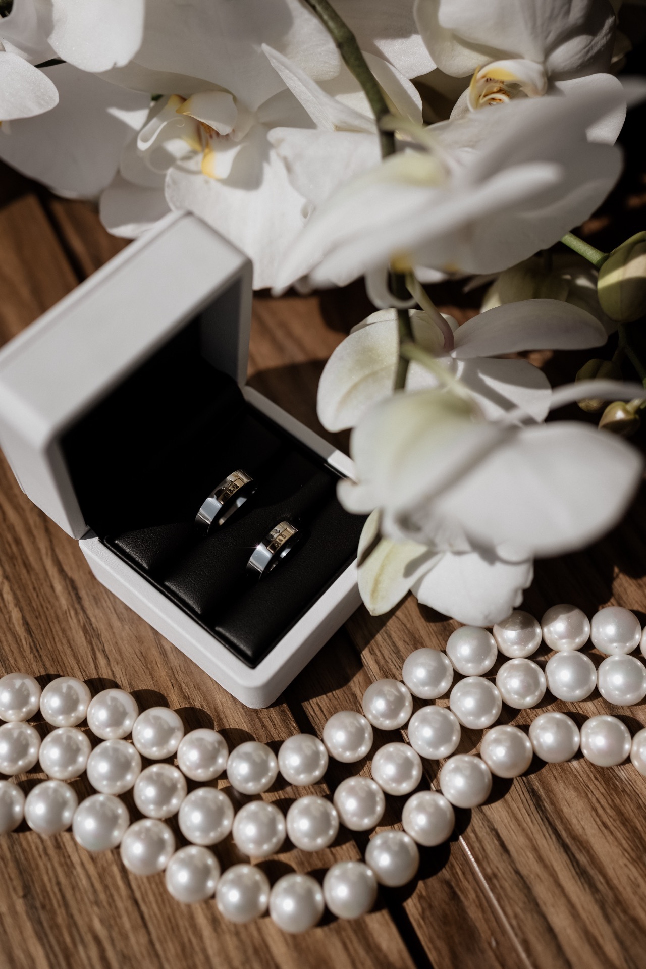 Объединяющей нитью наших образов стала утончённая орхидея: она украшала мой букет, её изящный бутон красовался в бутоньерке жениха, а также она стала частью цветочного декора в ресторане.