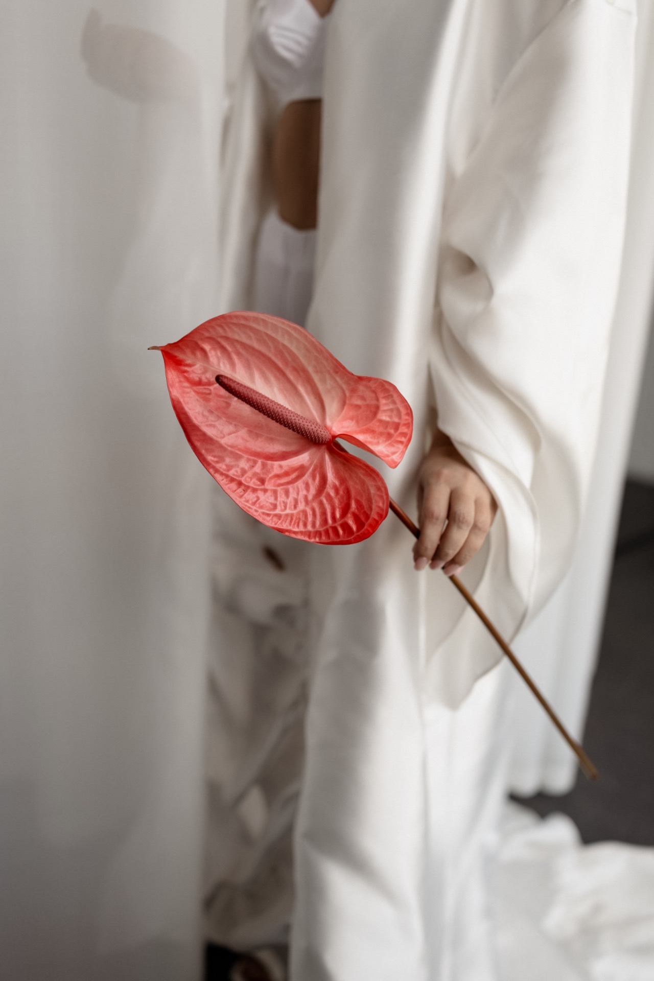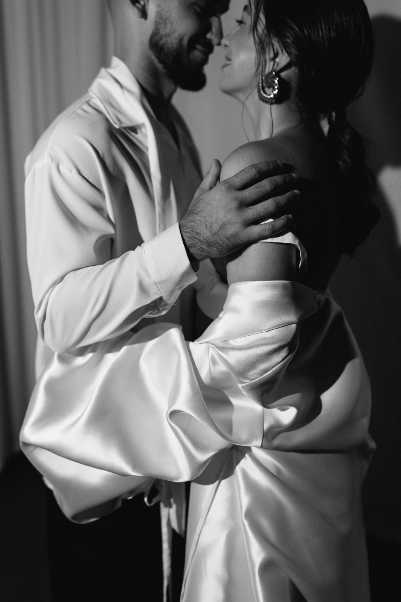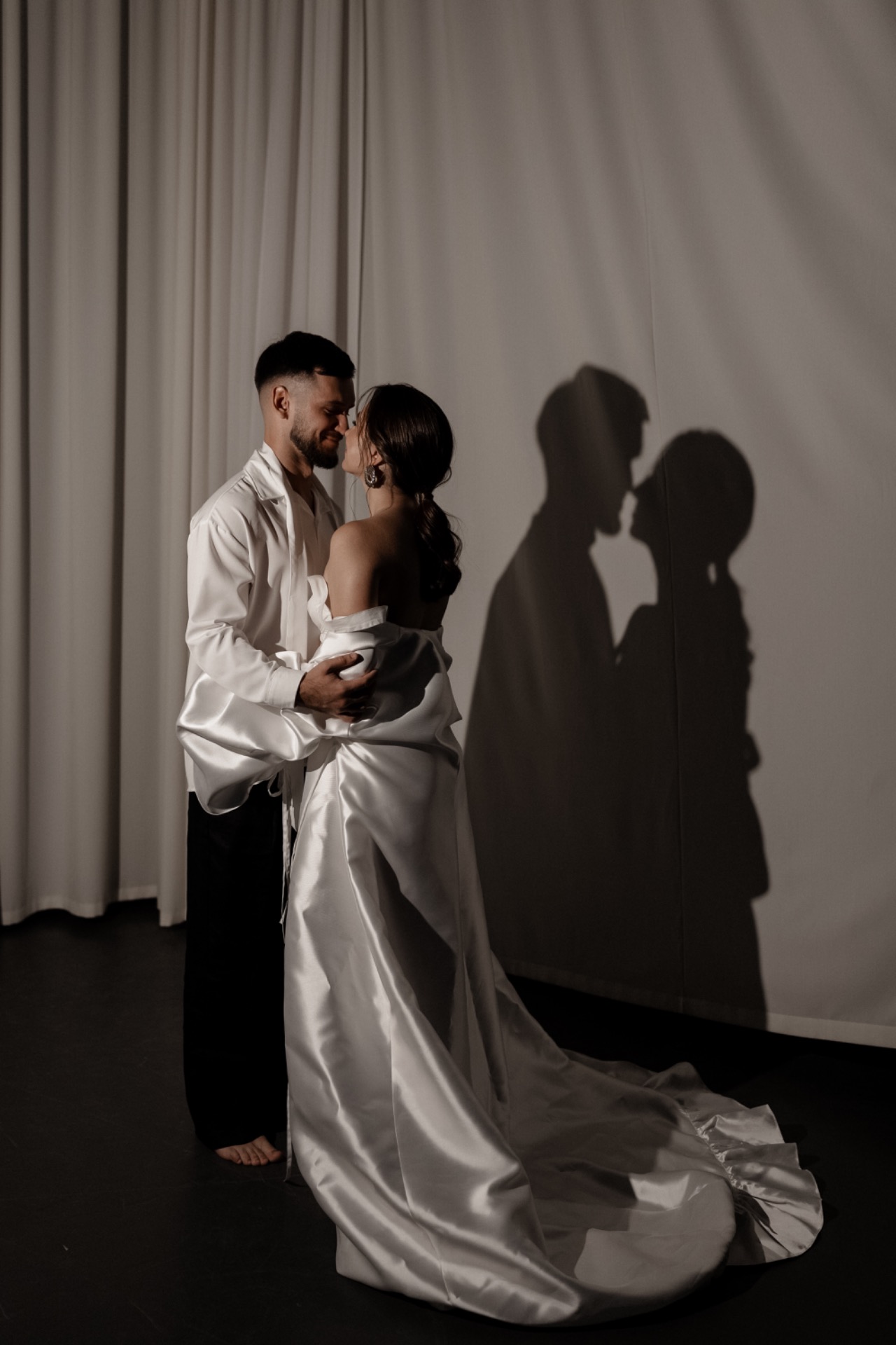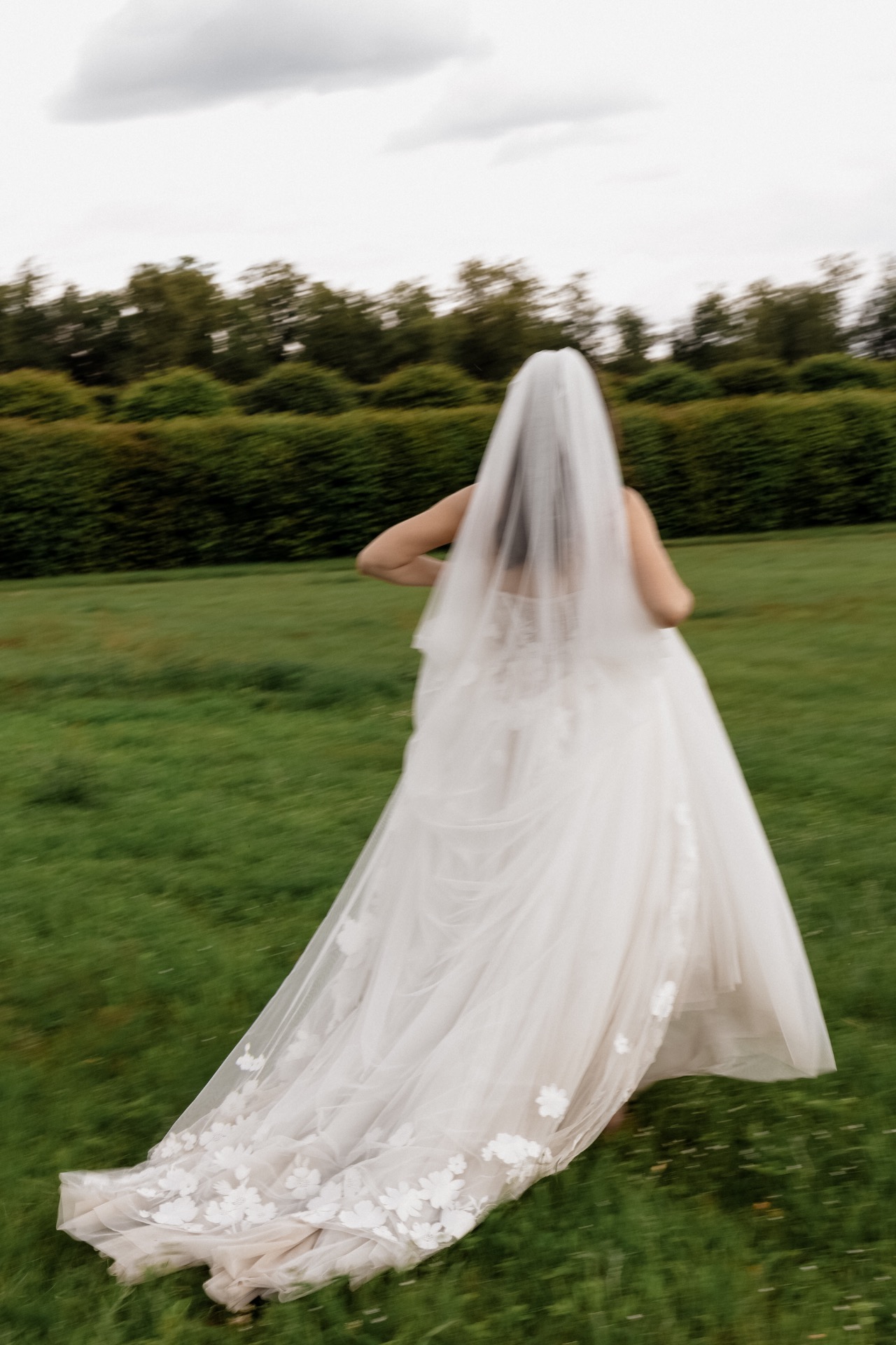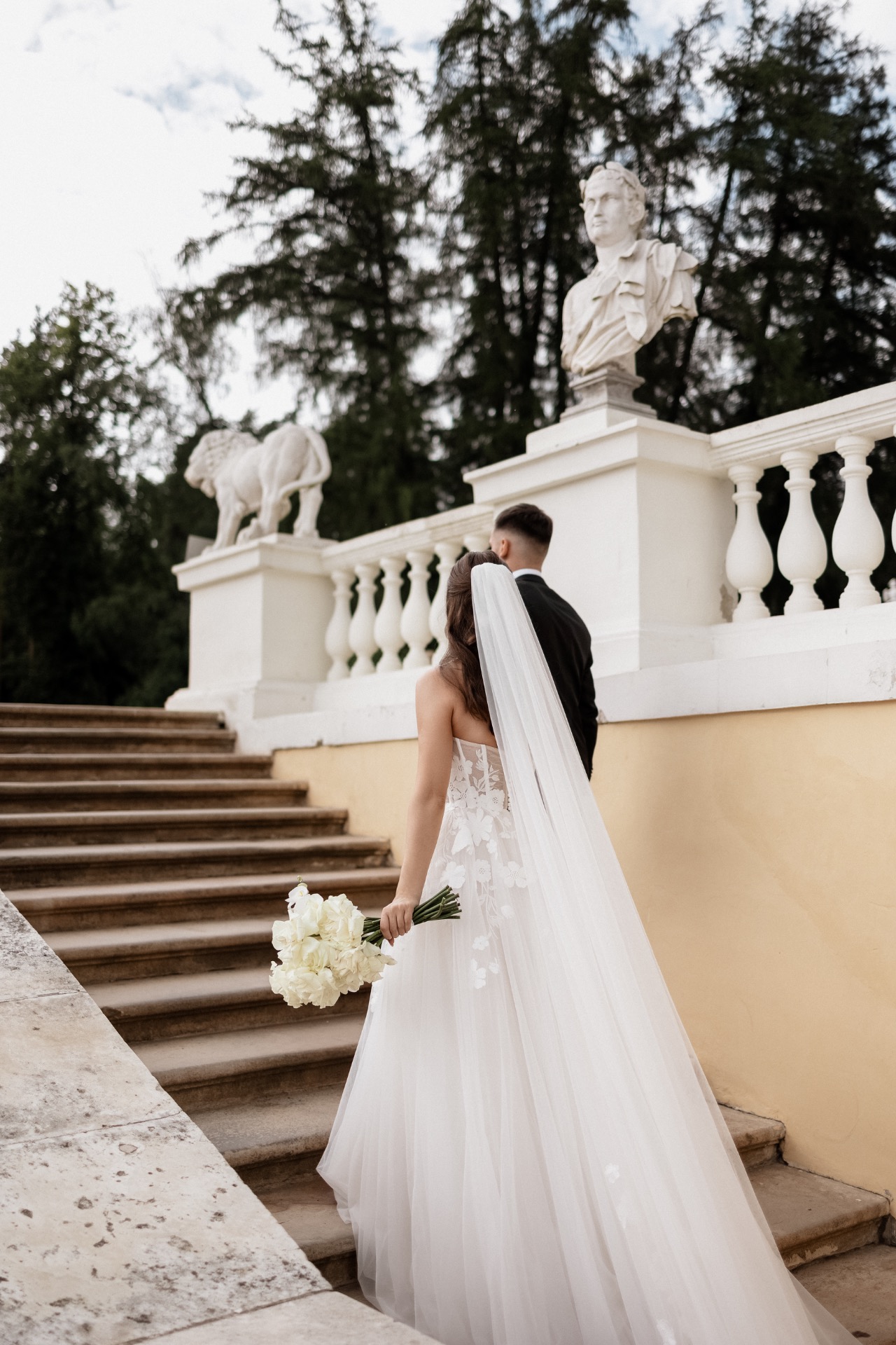 Фотографа на праздничном ужине у нас не было, потому что мы решили провести этот вечер без объективов, только среди родных. Но желание вновь надеть это платье не покидало меня, и на нашу первую годовщину мы устроили фотосессию вдвоём. Мы прочитали друг другу клятвы, вновь окунулись в роли жениха и невесты и прожили этот момент наедине друг с другом, без лишних глаз.