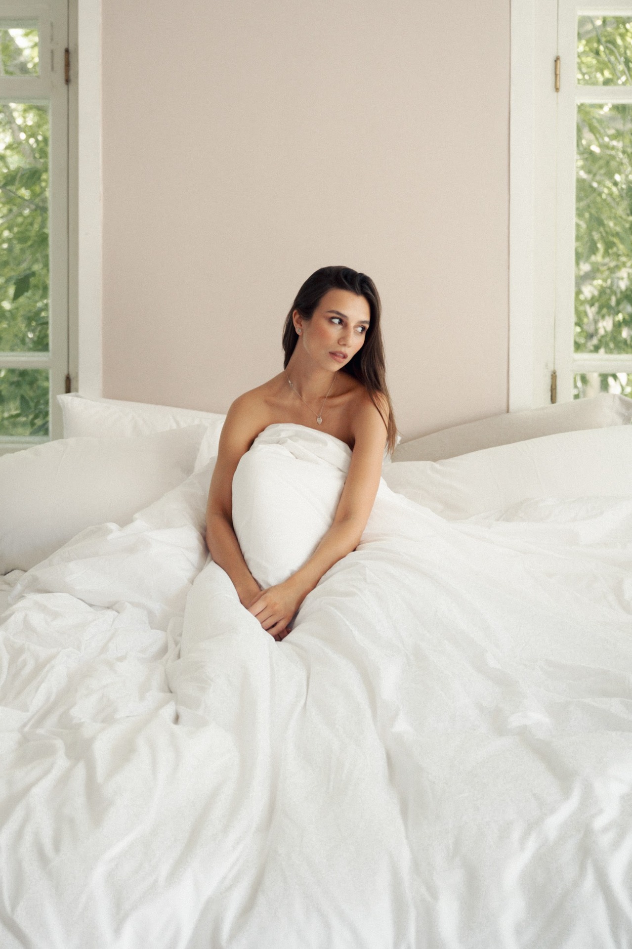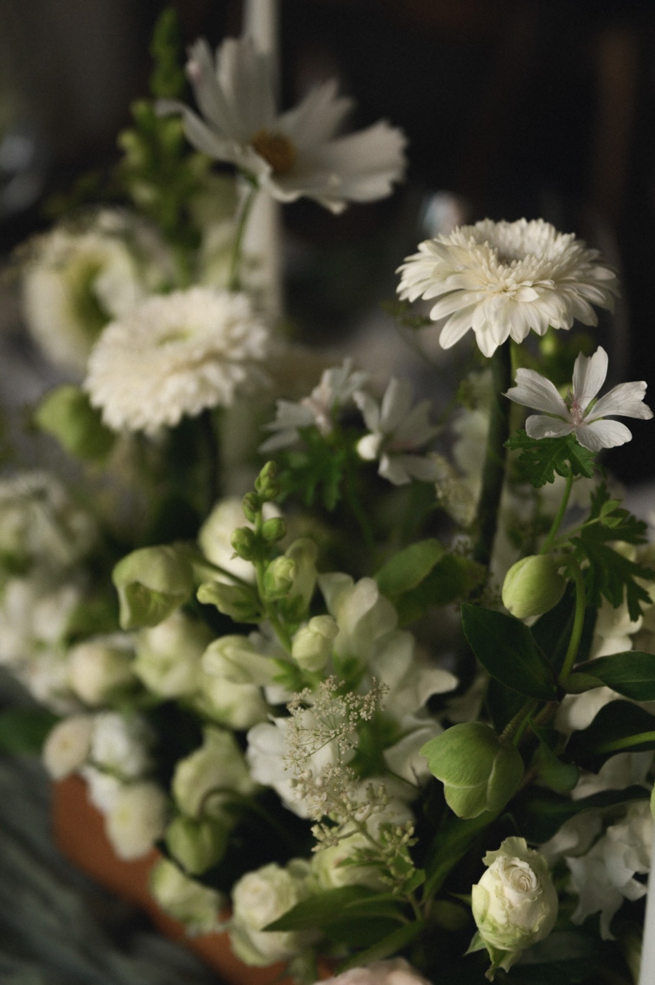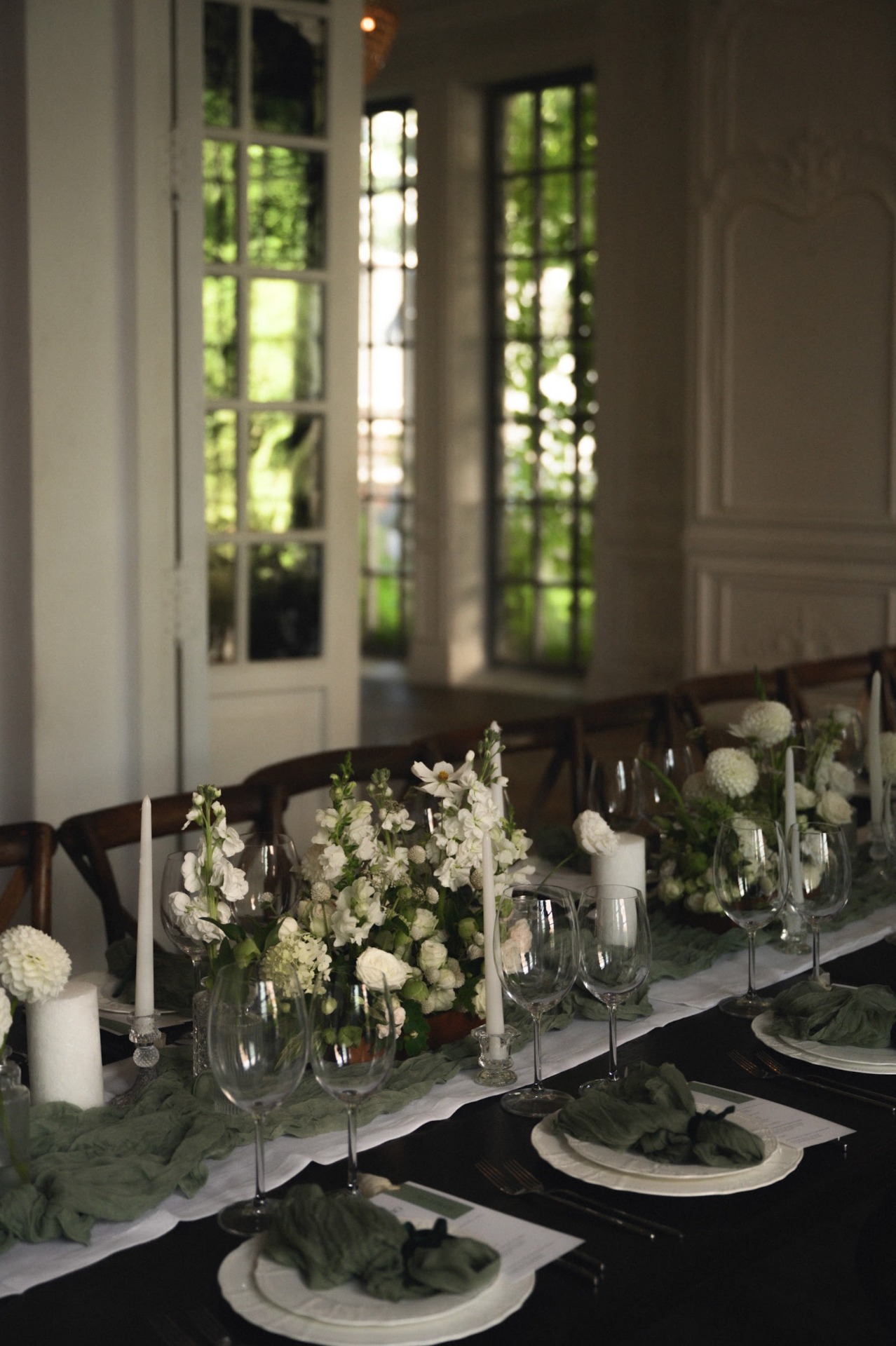 Декоратором стала моя сестра Люба. Она же — основательница цветочной мастерской Ravnovesie Lab. Она собрала для меня безупречный свадебный букет и воздушные бело-зелёные композиции на столы, добавила к ним зелёные полупрозрачные скатерти, гранёные вазочки и множество свечей.
