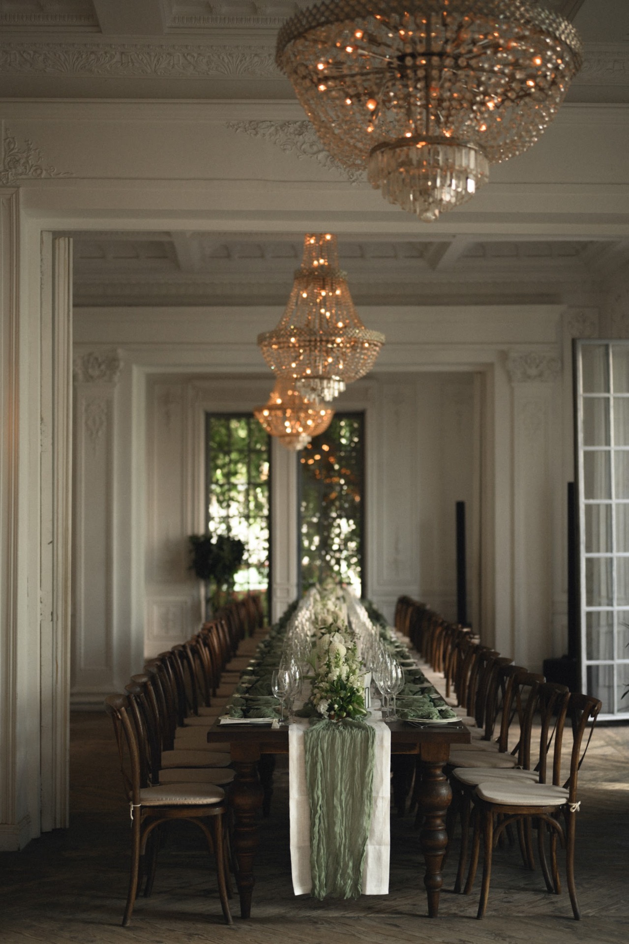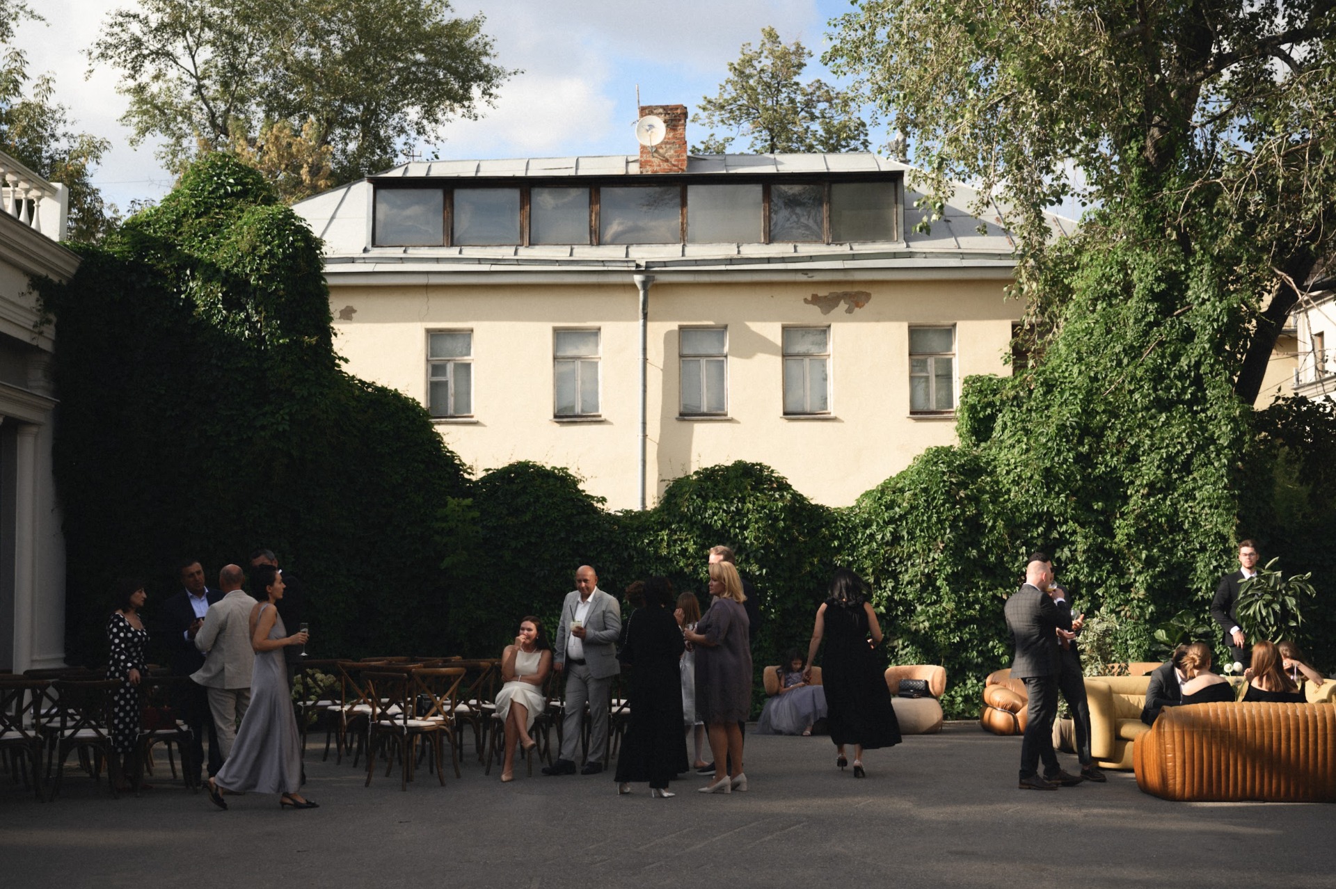 Мы сознательно отказались от услуг организатора: мы оба ужасные контрол-фрики и не могли представить себе, что доверим столь важный процесс кому-то постороннему. Сразу после подачи заявления мы выбрали площадку – особняк Royal. Он идеально подходил под наше видение: светлые стены, высокие потолки, лепнина, много света, огромные окна в пол и большой закрытый двор, завитый диким виноградом.