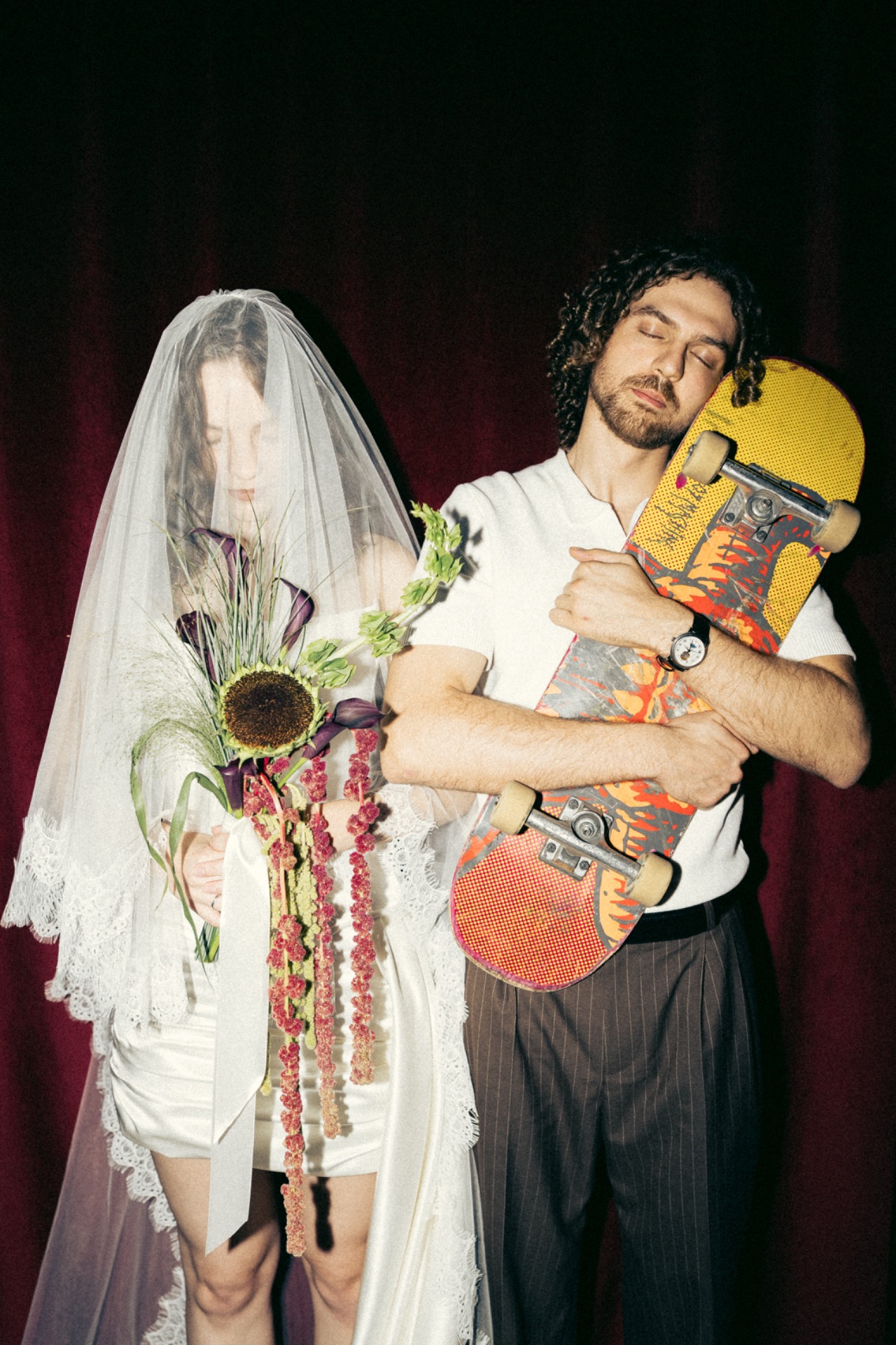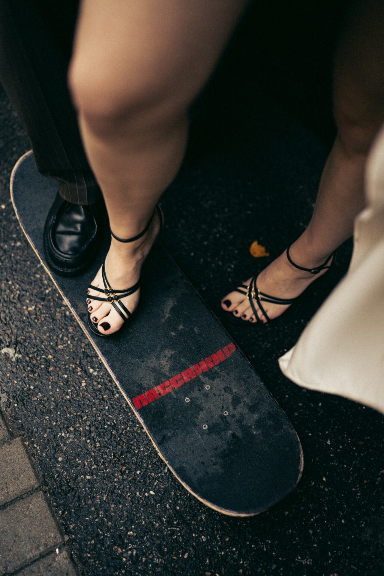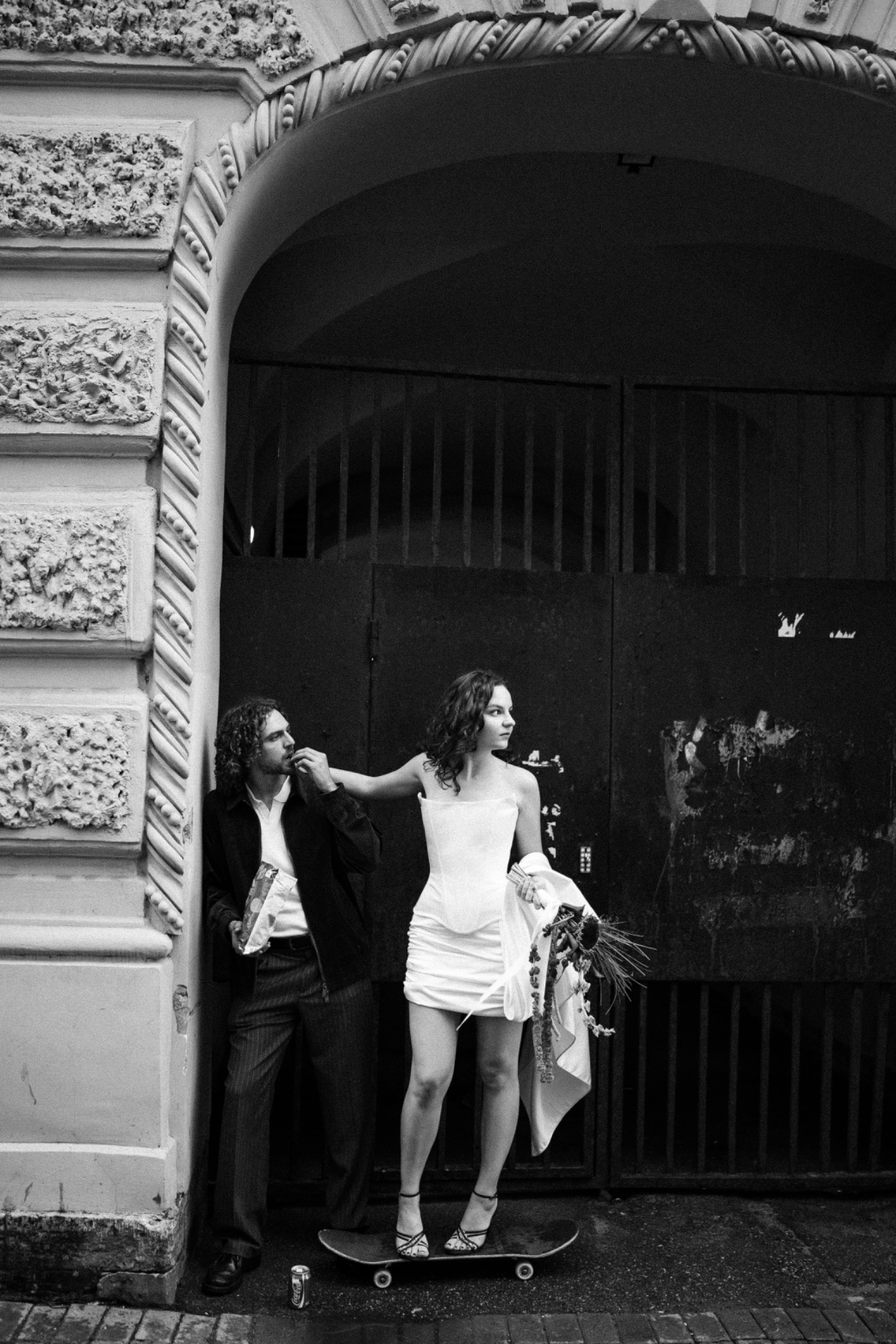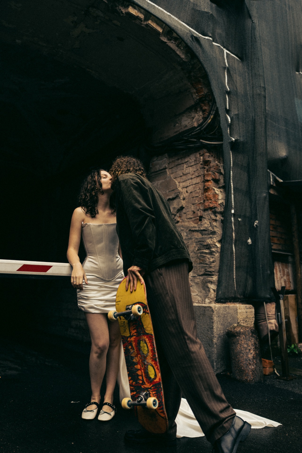 В итоге сложилось всё очень спонтанно: за день до росписи мы приехали в бильярд «Кручёных», договорились о фотосессии, осмотрели округу и решили съёмку со скейтом провести рядом с бильярдом. Нам хотелось отразить драйвовое, панковское настроение на наших свадебных снимках, чтобы наши дети смотрели на эти фотографии и думали: «Вау, вот это мама с папой вытворяли в молодости!».