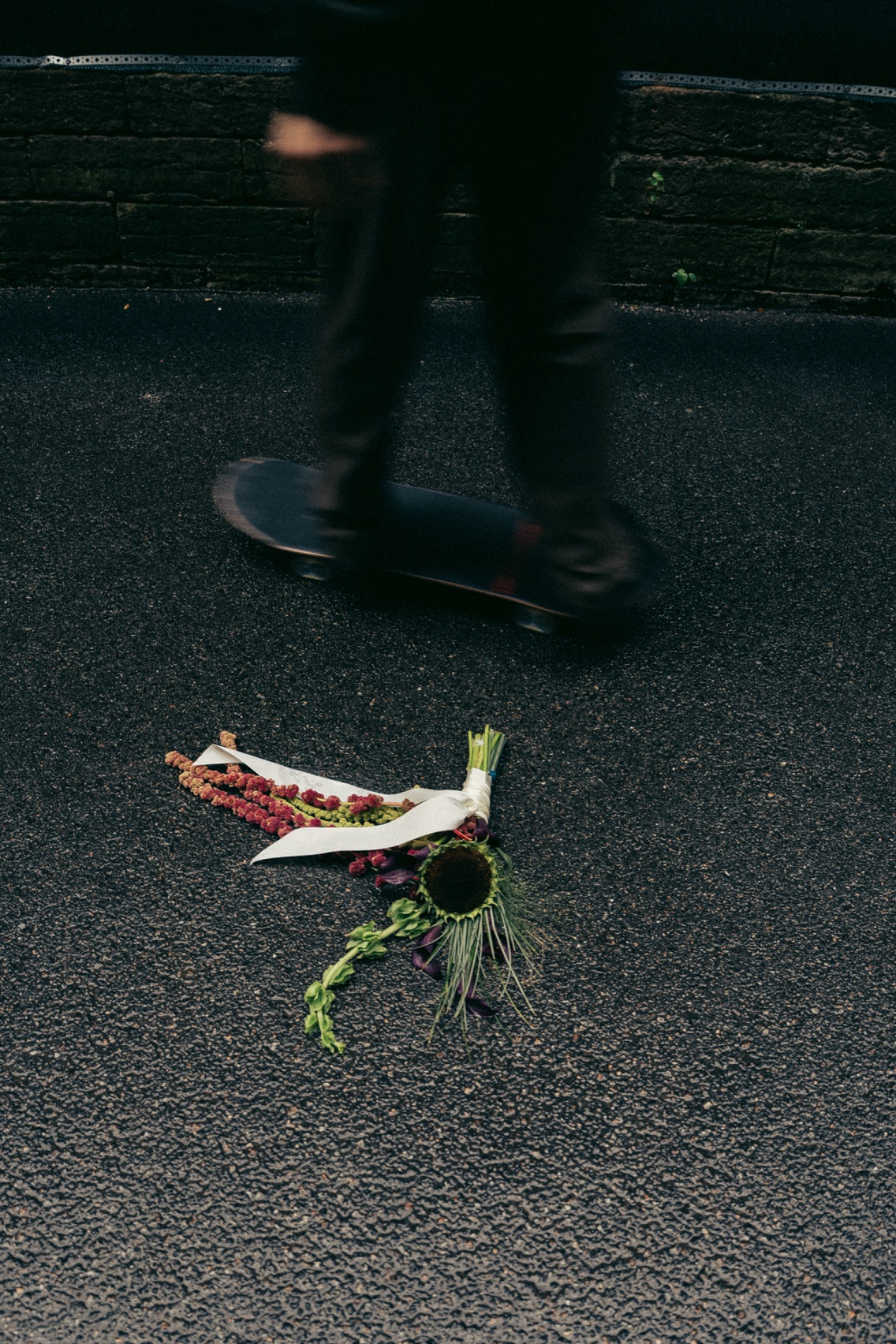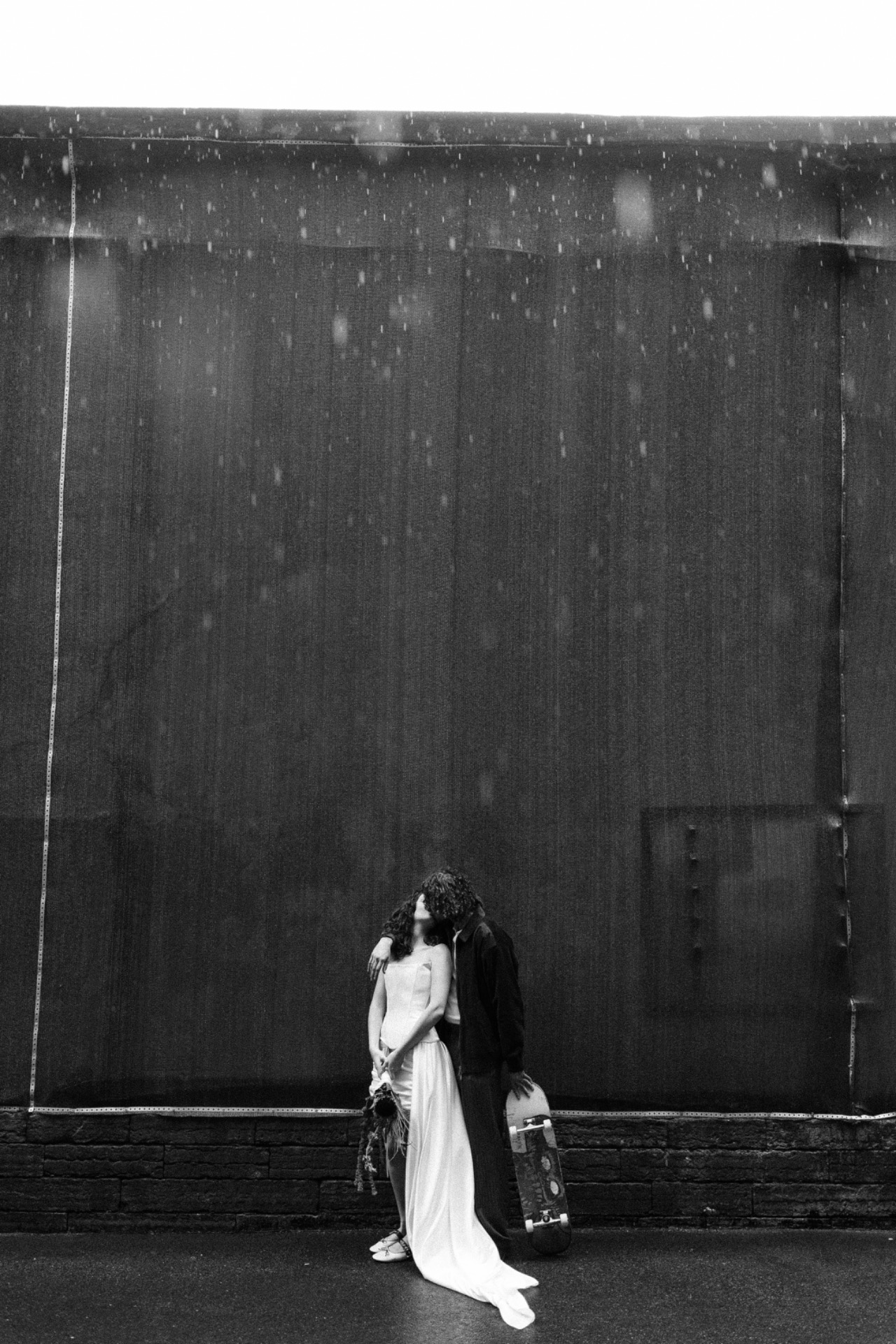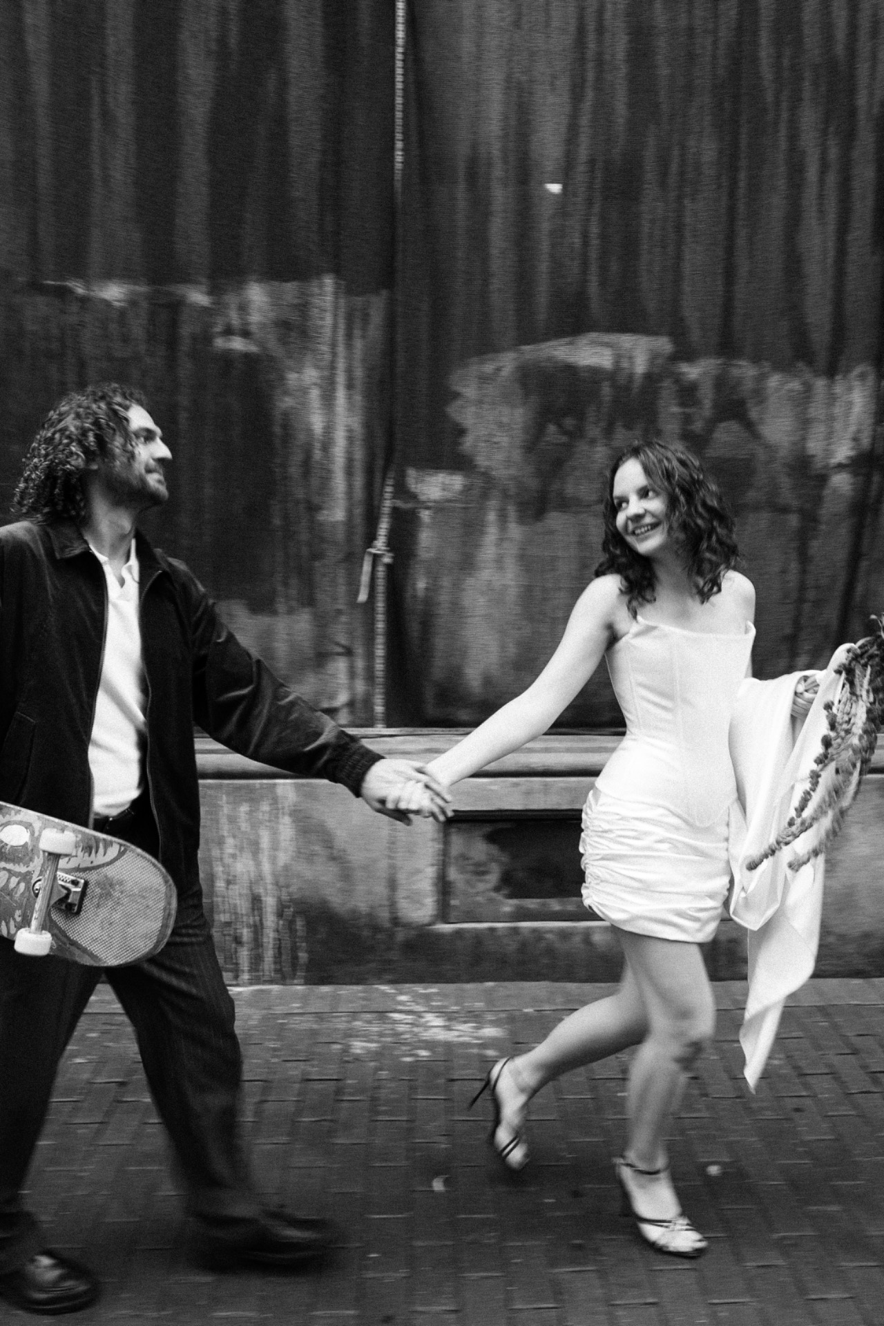 В итоге сложилось всё очень спонтанно: за день до росписи мы приехали в бильярд «Кручёных», договорились о фотосессии, осмотрели округу и решили съёмку со скейтом провести рядом с бильярдом. Нам хотелось отразить драйвовое, панковское настроение на наших свадебных снимках, чтобы наши дети смотрели на эти фотографии и думали: «Вау, вот это мама с папой вытворяли в молодости!».