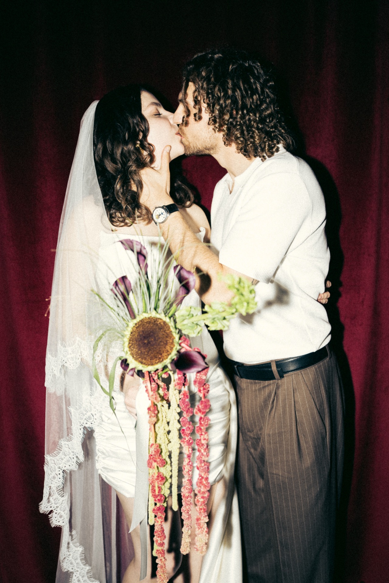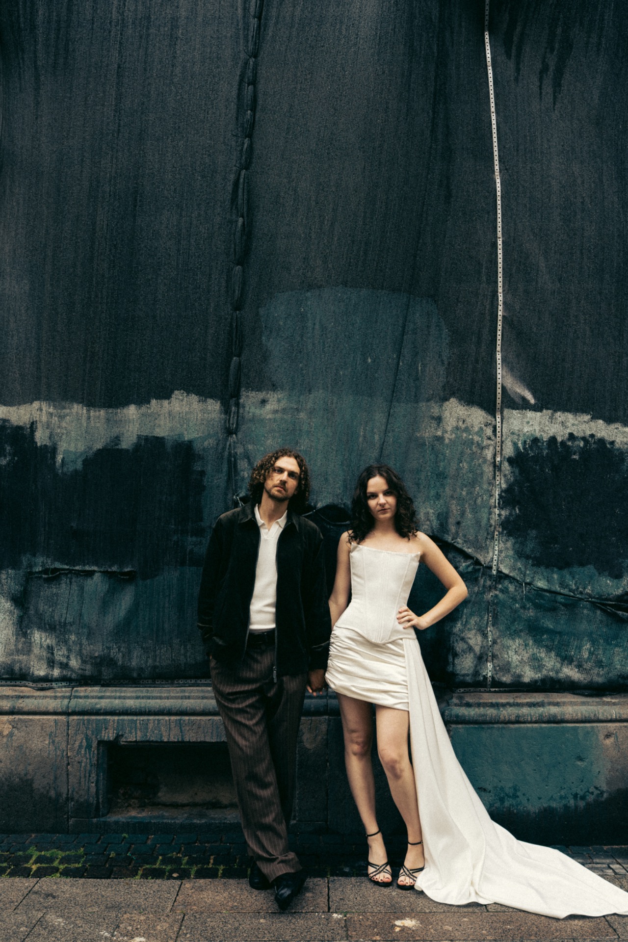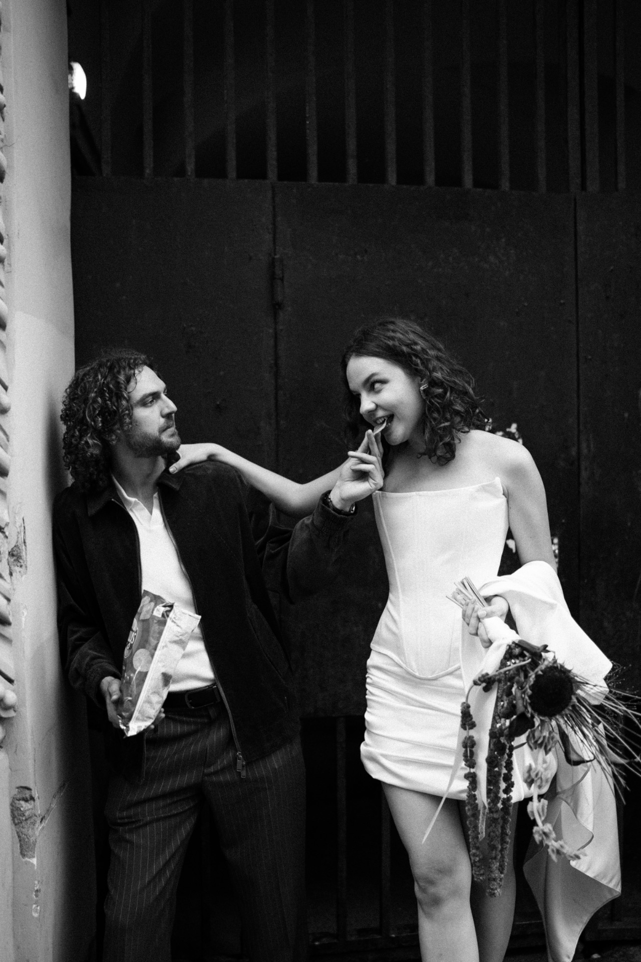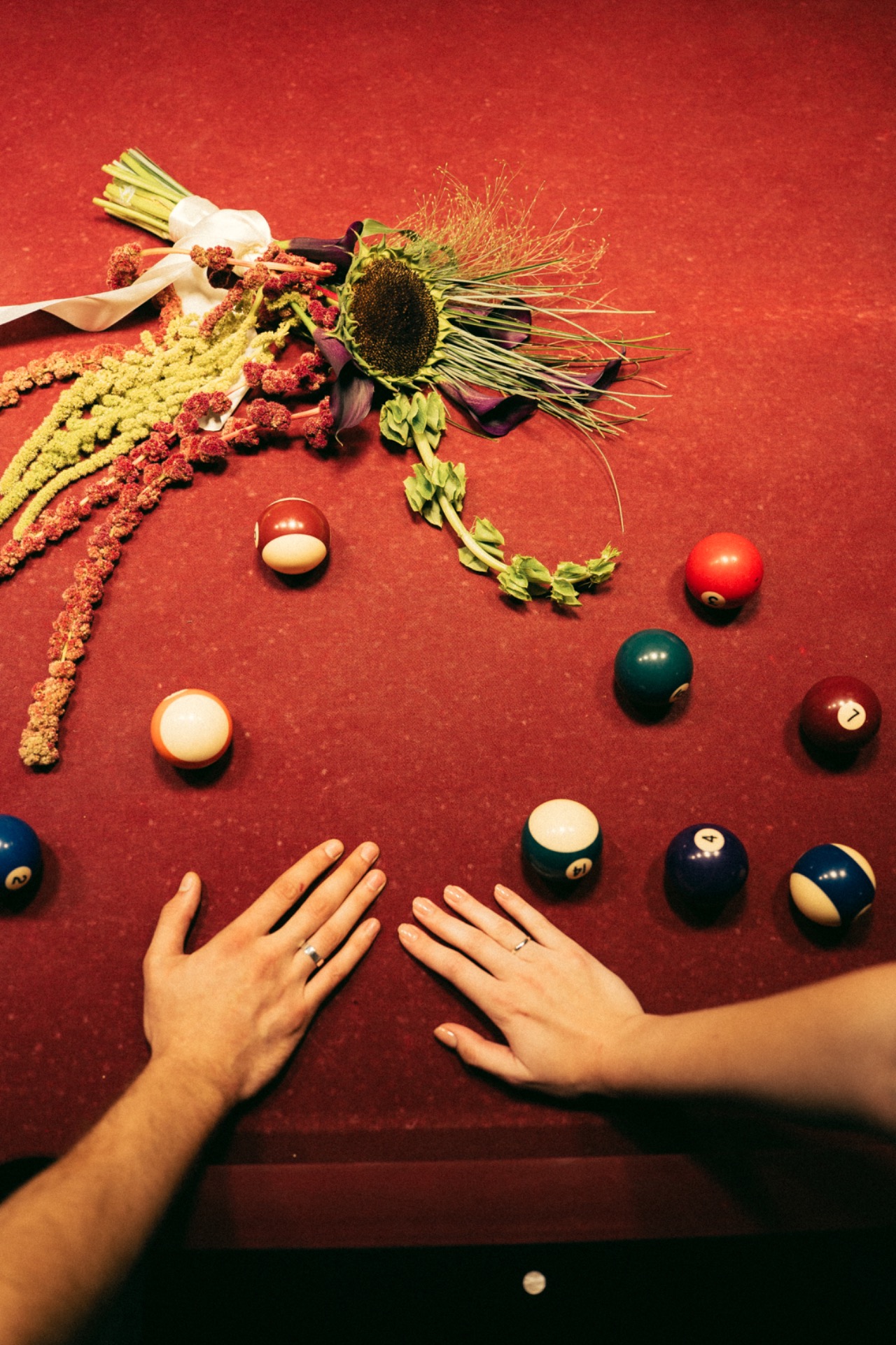 В итоге сложилось всё очень спонтанно: за день до росписи мы приехали в бильярд «Кручёных», договорились о фотосессии, осмотрели округу и решили съёмку со скейтом провести рядом с бильярдом. Нам хотелось отразить драйвовое, панковское настроение на наших свадебных снимках, чтобы наши дети смотрели на эти фотографии и думали: «Вау, вот это мама с папой вытворяли в молодости!».
