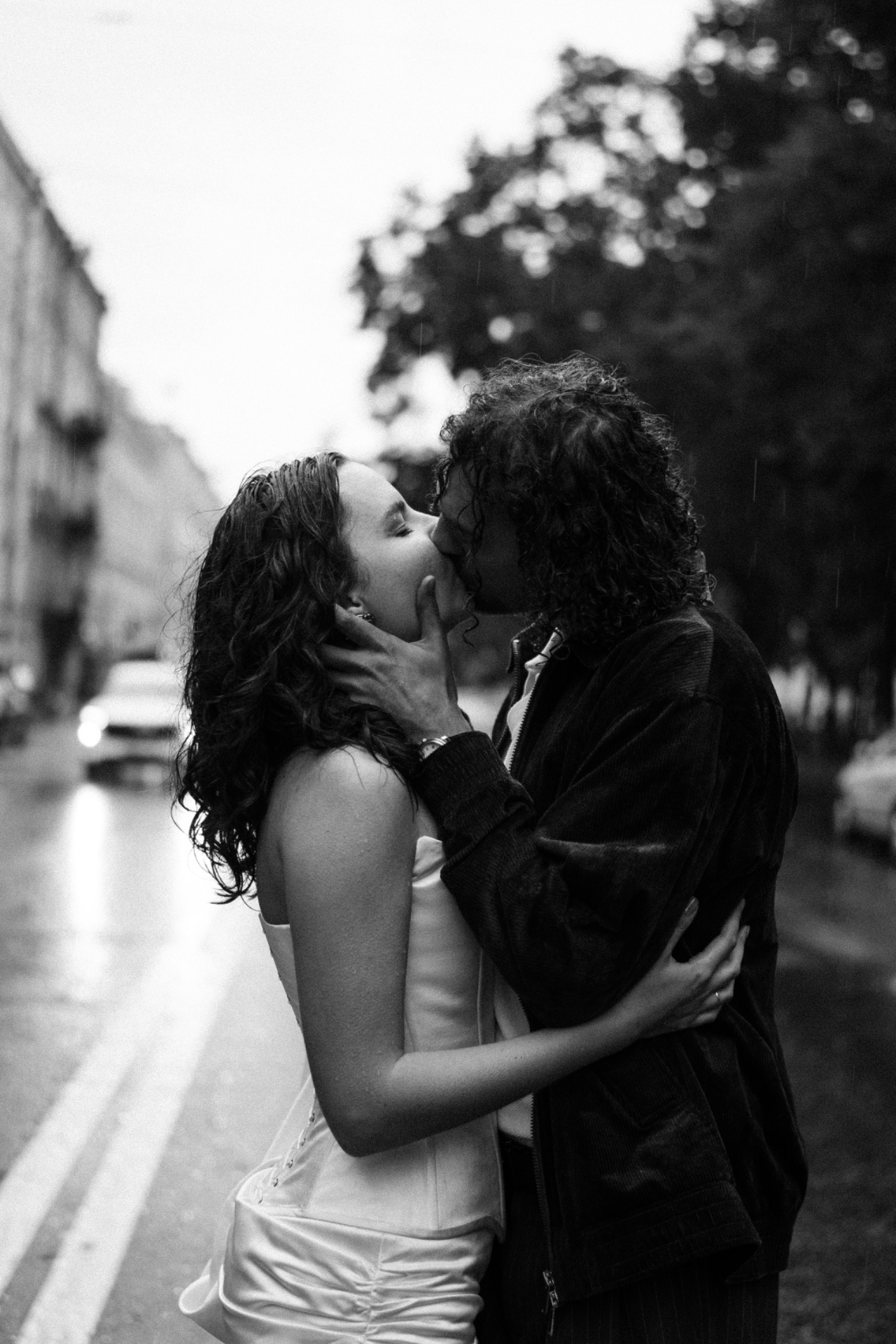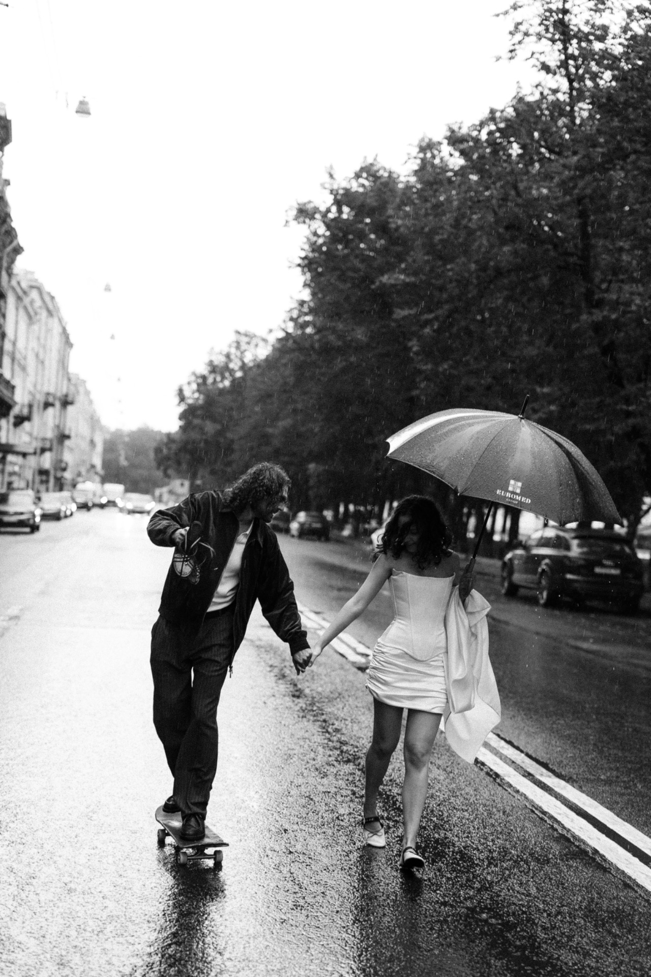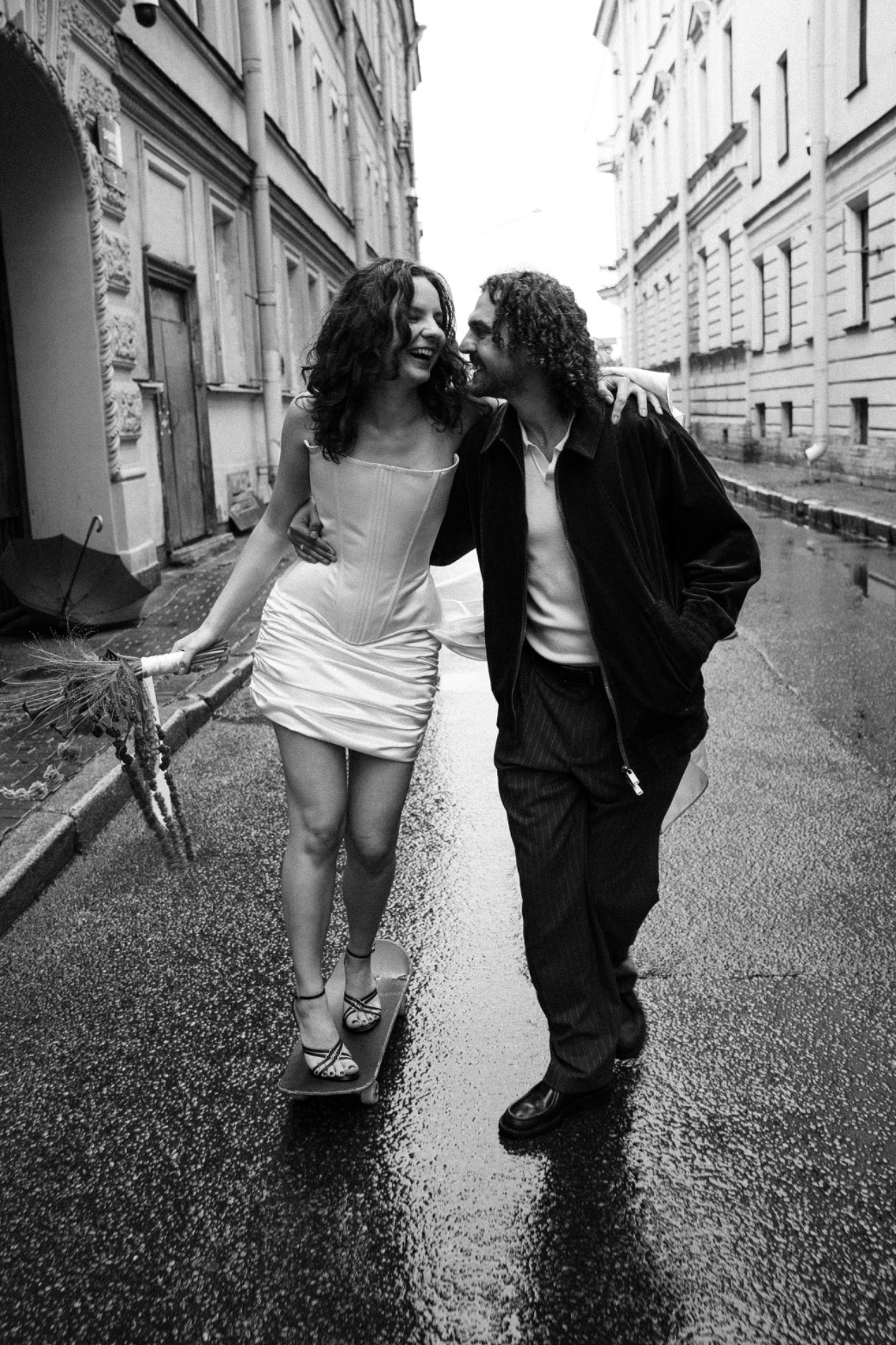 Главным приключением дня стала съёмка. Фотограф очень круто уловил наш вайб, и несколько часов пролетели как одно мгновение: мы играли в бильярд, катались на скейте, бегали и целовались под дождём. Это была наша первая совместная съёмка, где мы просто кайфовали друг от друга, а фотограф ловил эти моменты на камеру. Нам так понравилось, что теперь хотим устраивать такую фотосессию каждый год на годовщину.