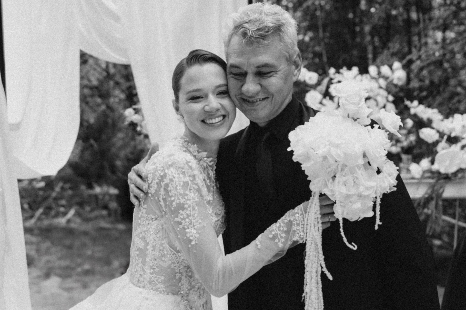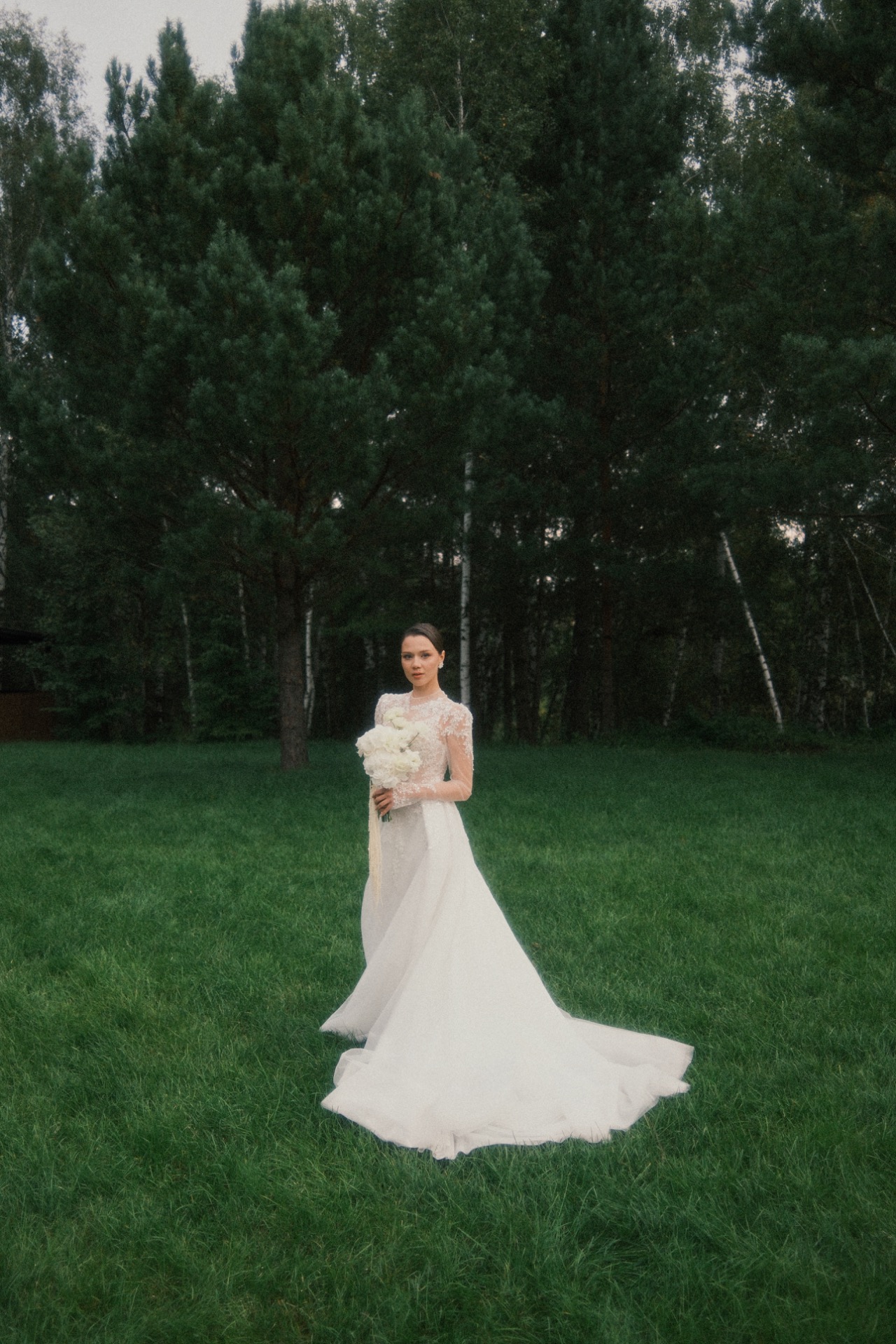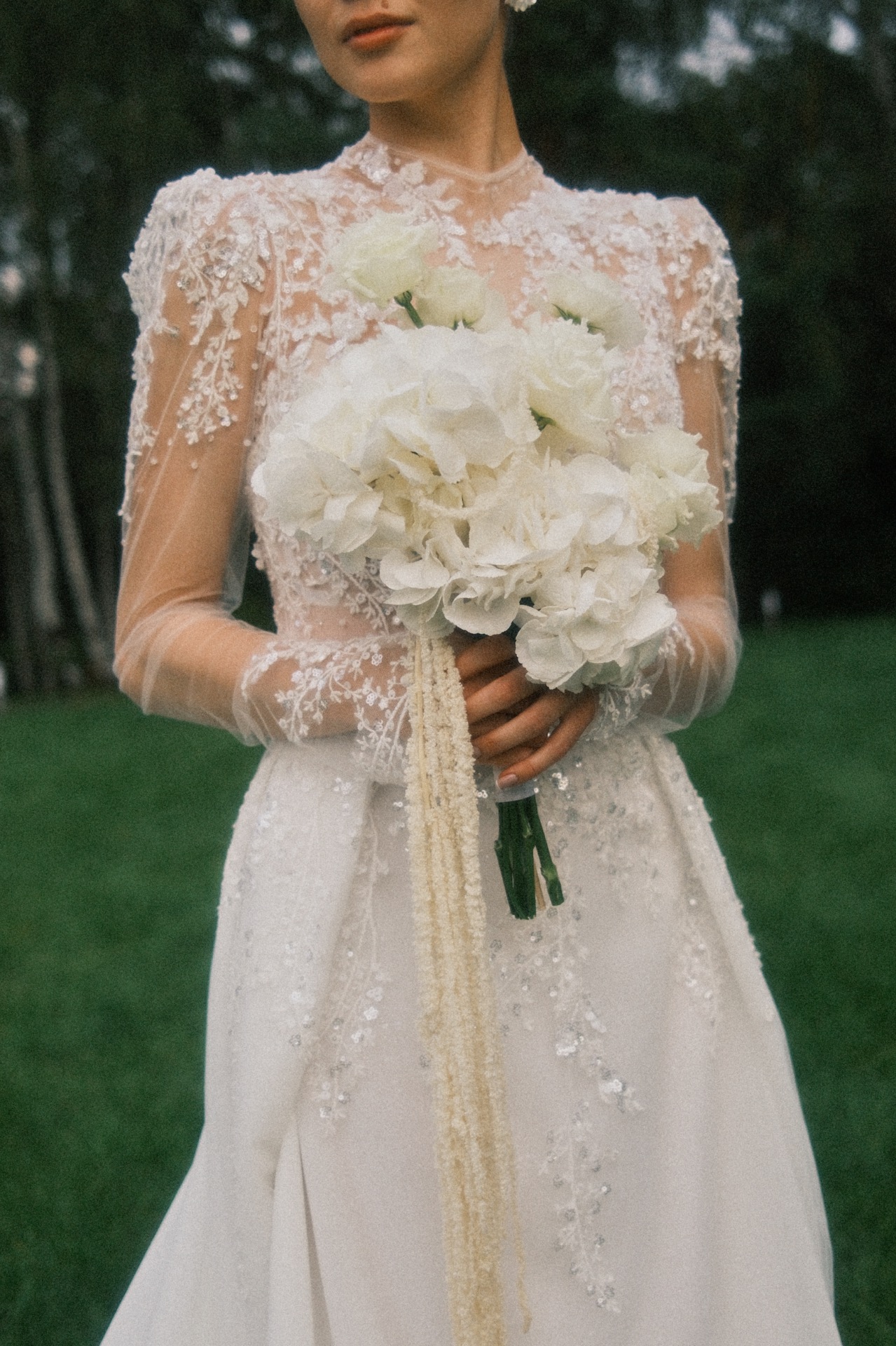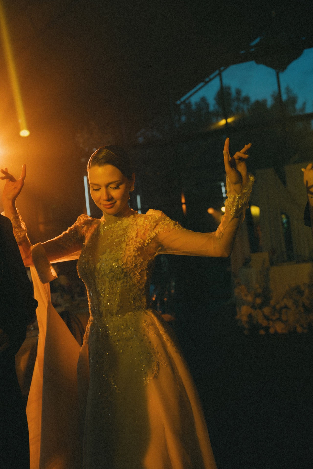 Для основного платья я выбрала белый наряд с чистыми линиями, необычной вышивкой сверху и элегантным разрезом. В нём я чувствовала себя собой — уверенной и лёгкой одновременно.