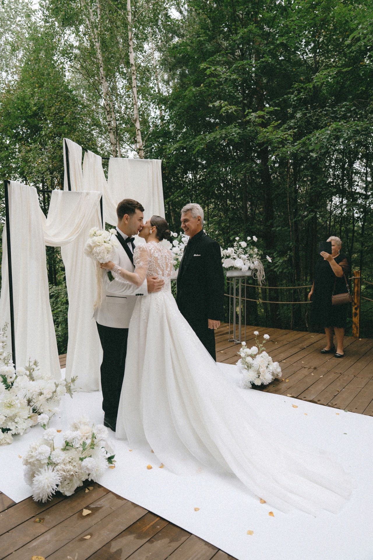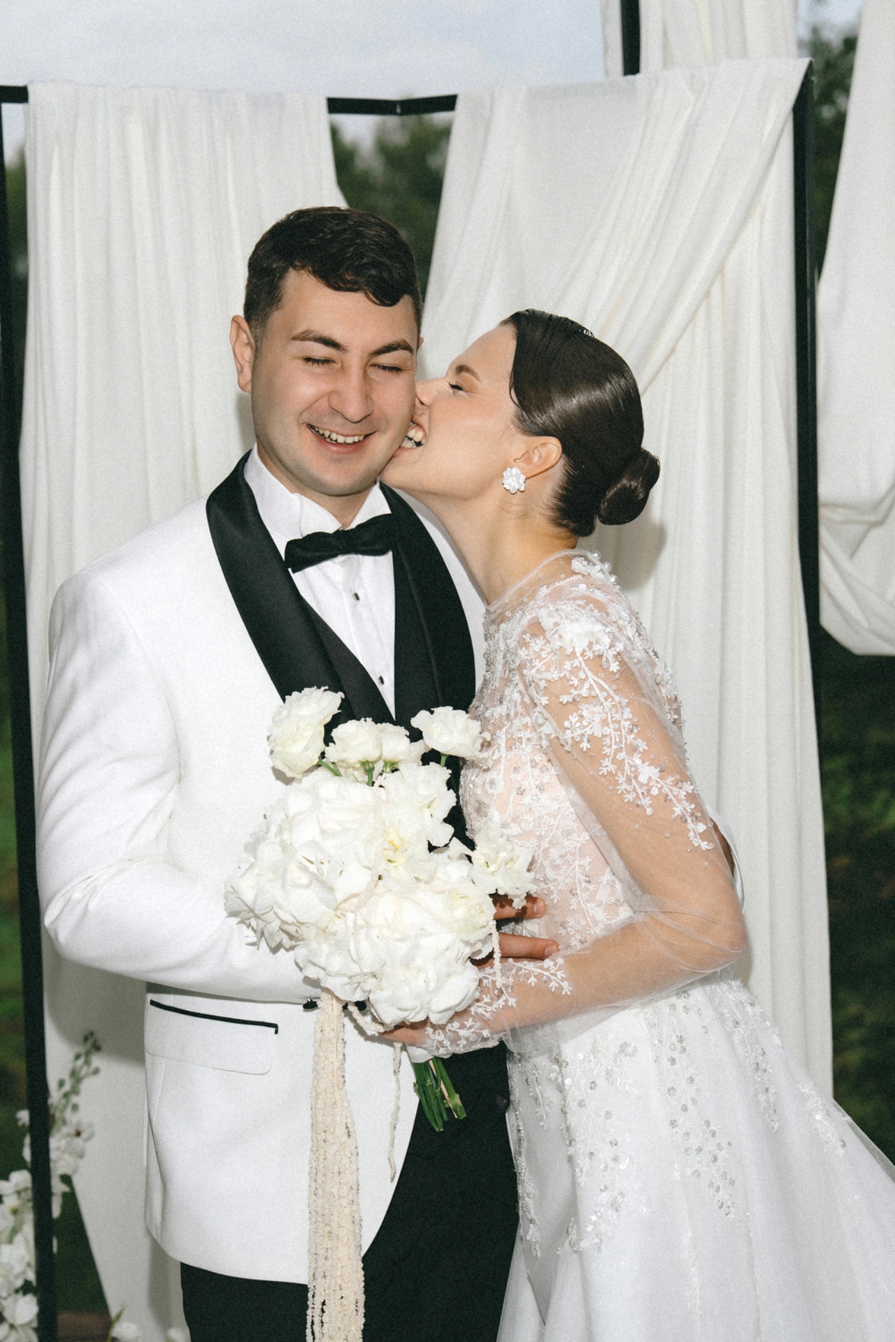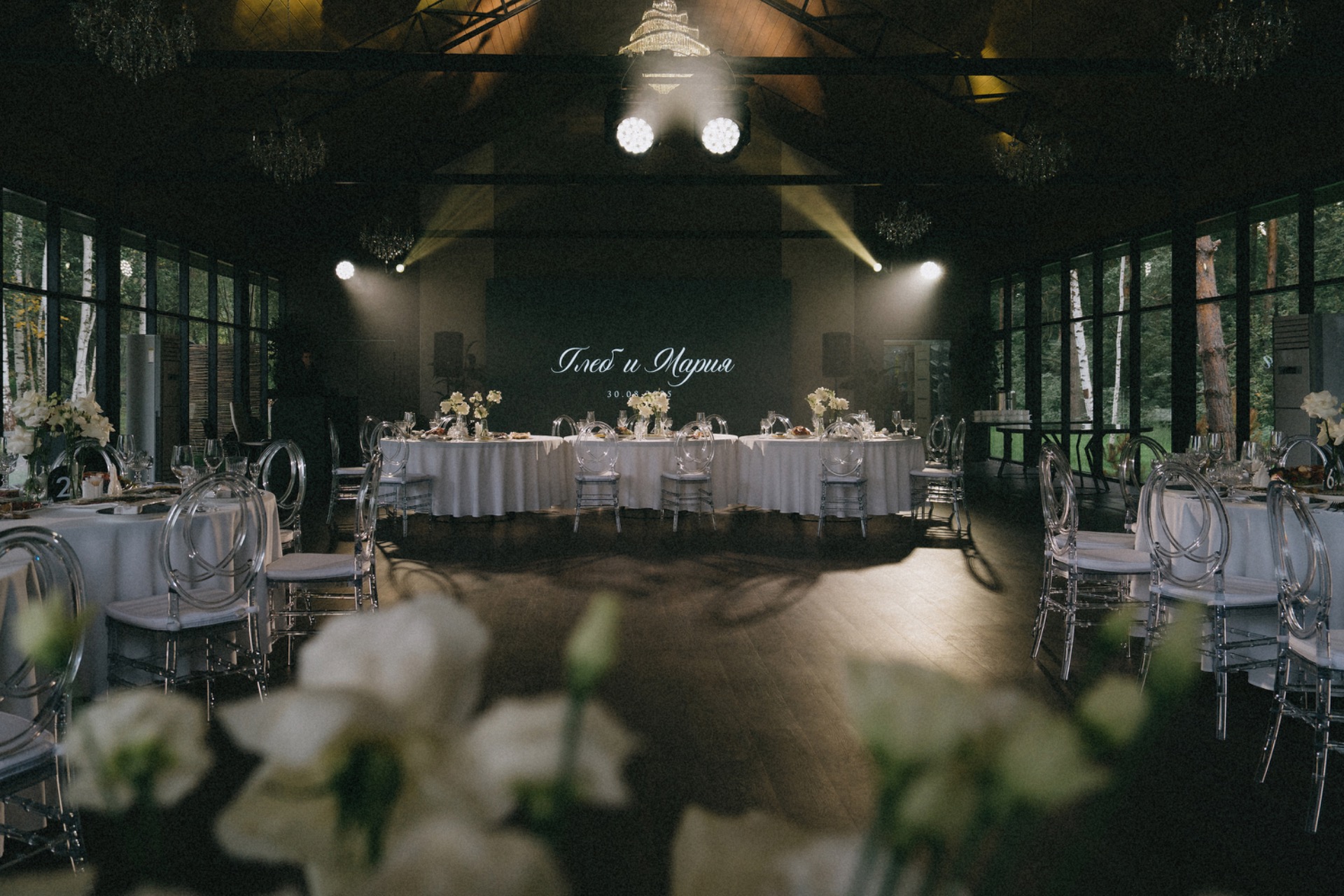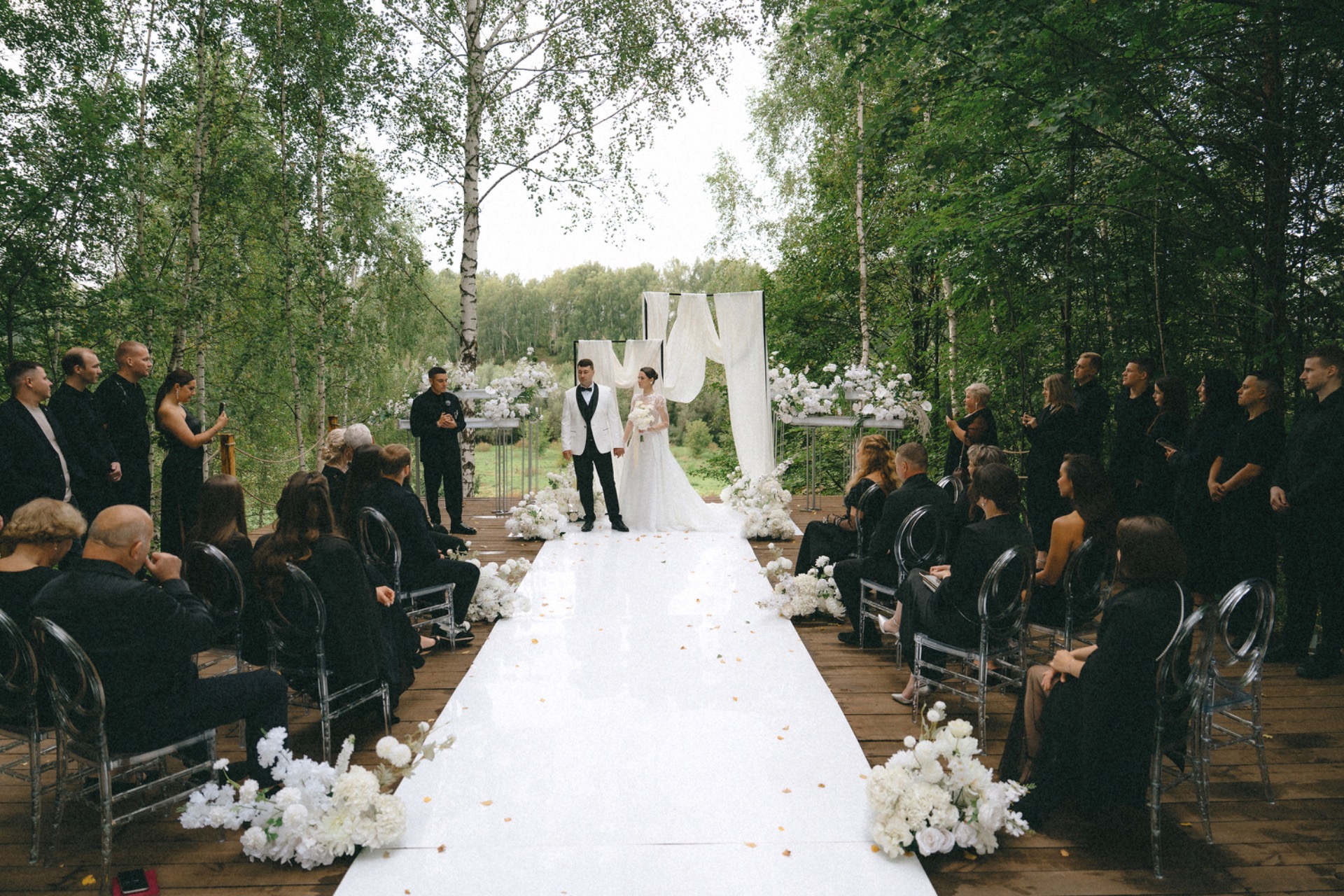 Я по профессии дизайнер интерьеров, и, наверное, поэтому с самого начала знала, как должна выглядеть наша свадьба: чистые линии, лаконичность, визуальная гармония. Так появилась концепция чёрно-белой свадьбы — стильной, но сдержанной, без лишних деталей. Я собрала мудборд в Pinterest, и все остальные элементы сложились сами собой: выразительная белая флористика и минимализм в декоре.