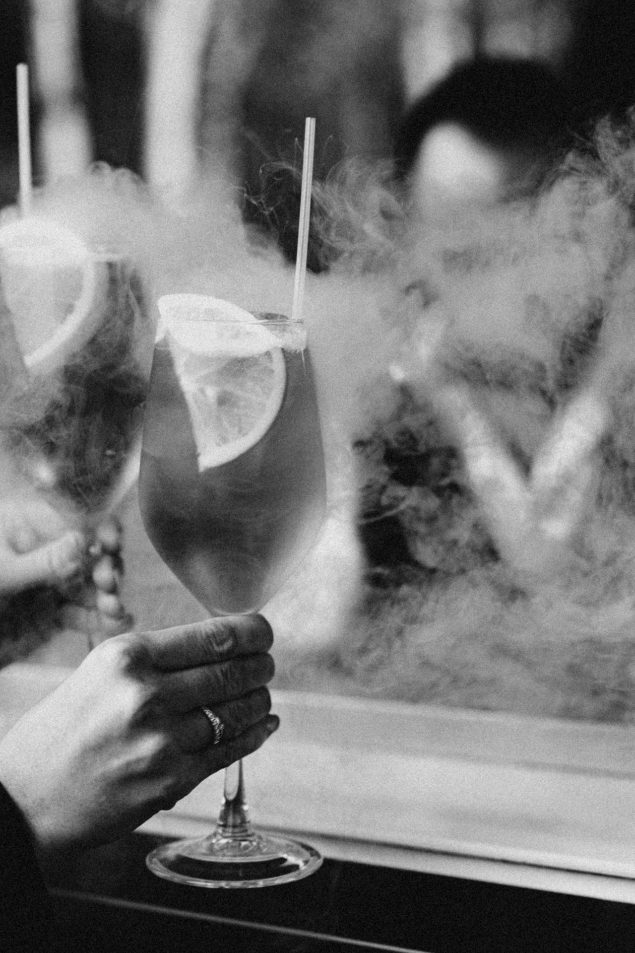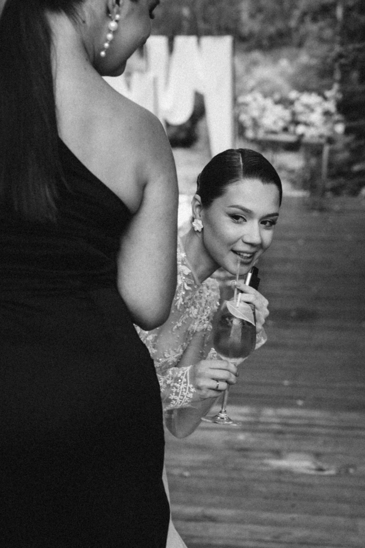 Мы организовали бар с авторскими коктейлями и каждому напитку придумали своё название, вдохновившись нашей историей. На welcome-зоне мы установили зеркало для селфи и пригласили художницу, которая делала быстрые скетчи гостей. Теперь у каждого приглашённого осталась миниатюра на память о нашем дне.
