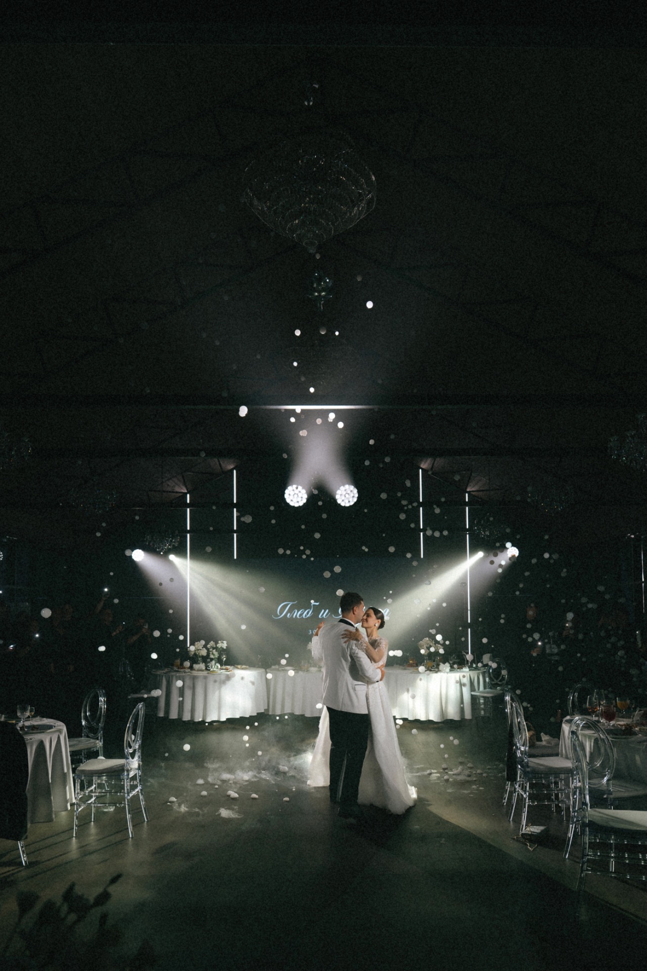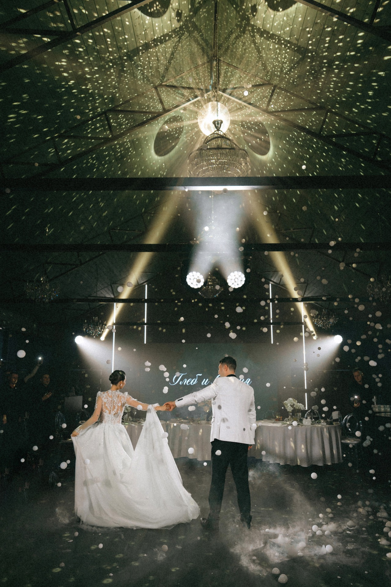 Для первого танца мы отказались от стандартного тяжёлого дыма и сделали вместо него эффект «дымных пузырей». Эта деталь выглядела волшебно и отлично подчеркнула нежную эстетику свадьбы.
