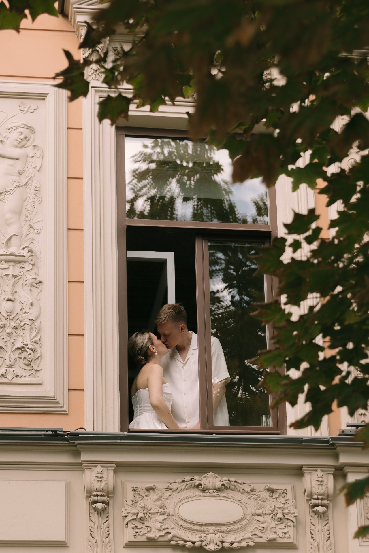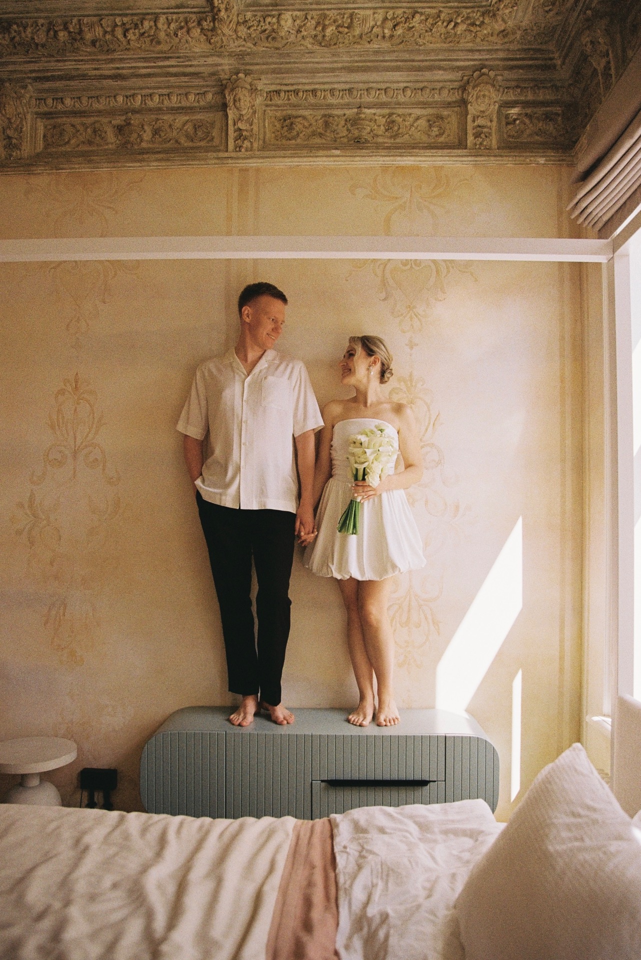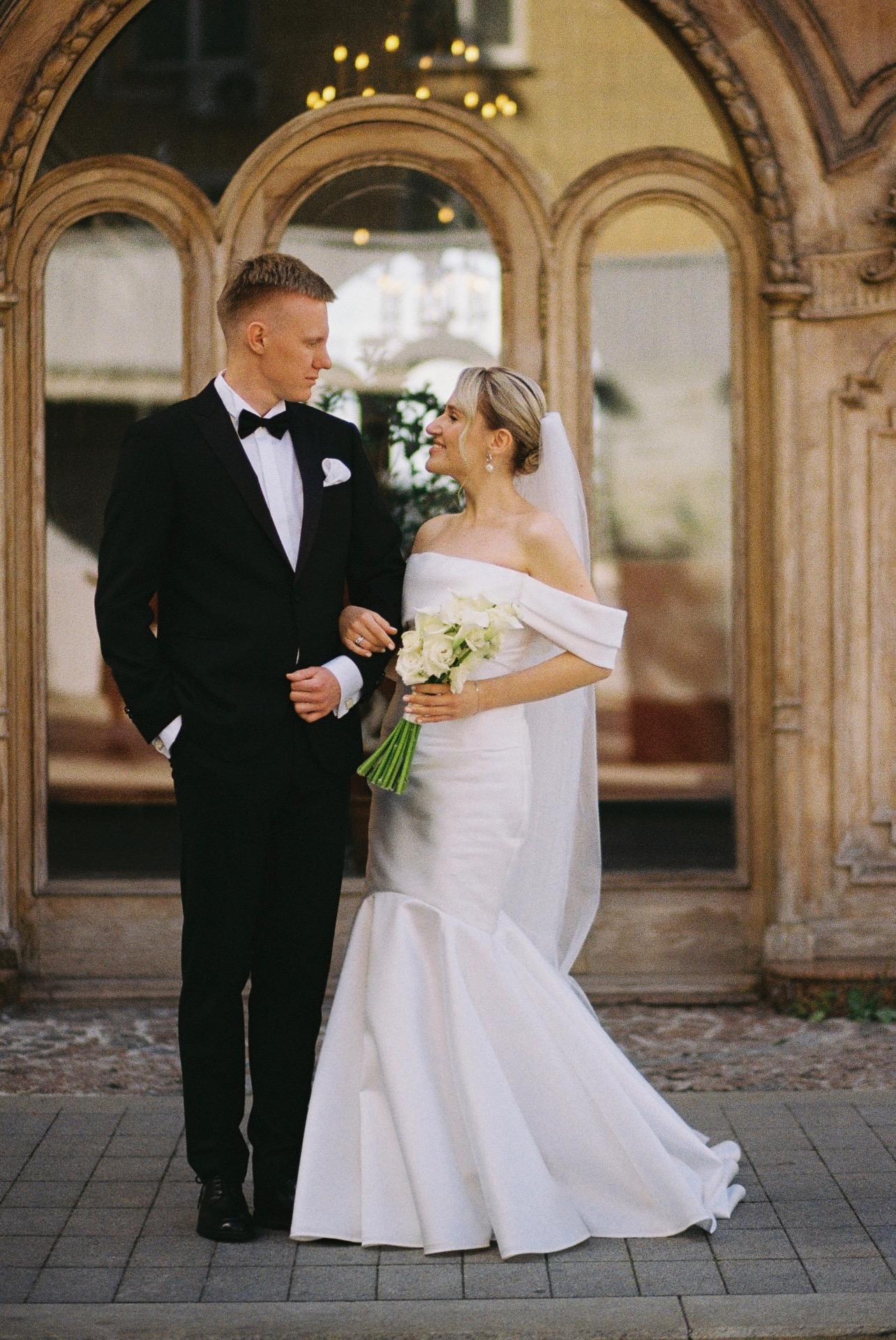 Наши образы также поддерживали выбранный стиль. Для утра, которое проходило в историческом особняке, отеле Twelve Reasons, мы выбрали более расслабленные наряды. У меня было короткое корсетное платье с юбкой-баллоном молочного цвета, а у Димы чёрные брюки и свободная сорочка.