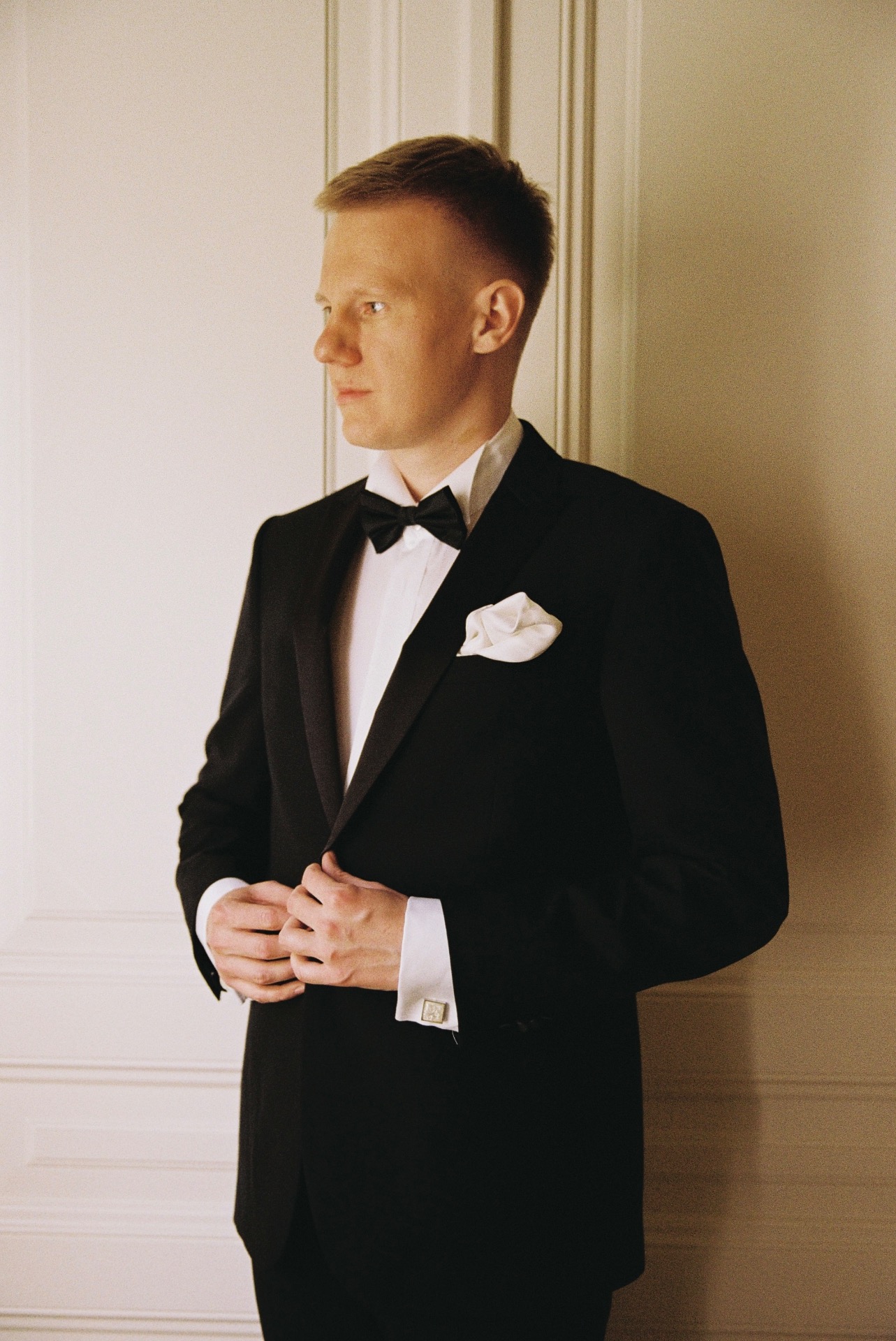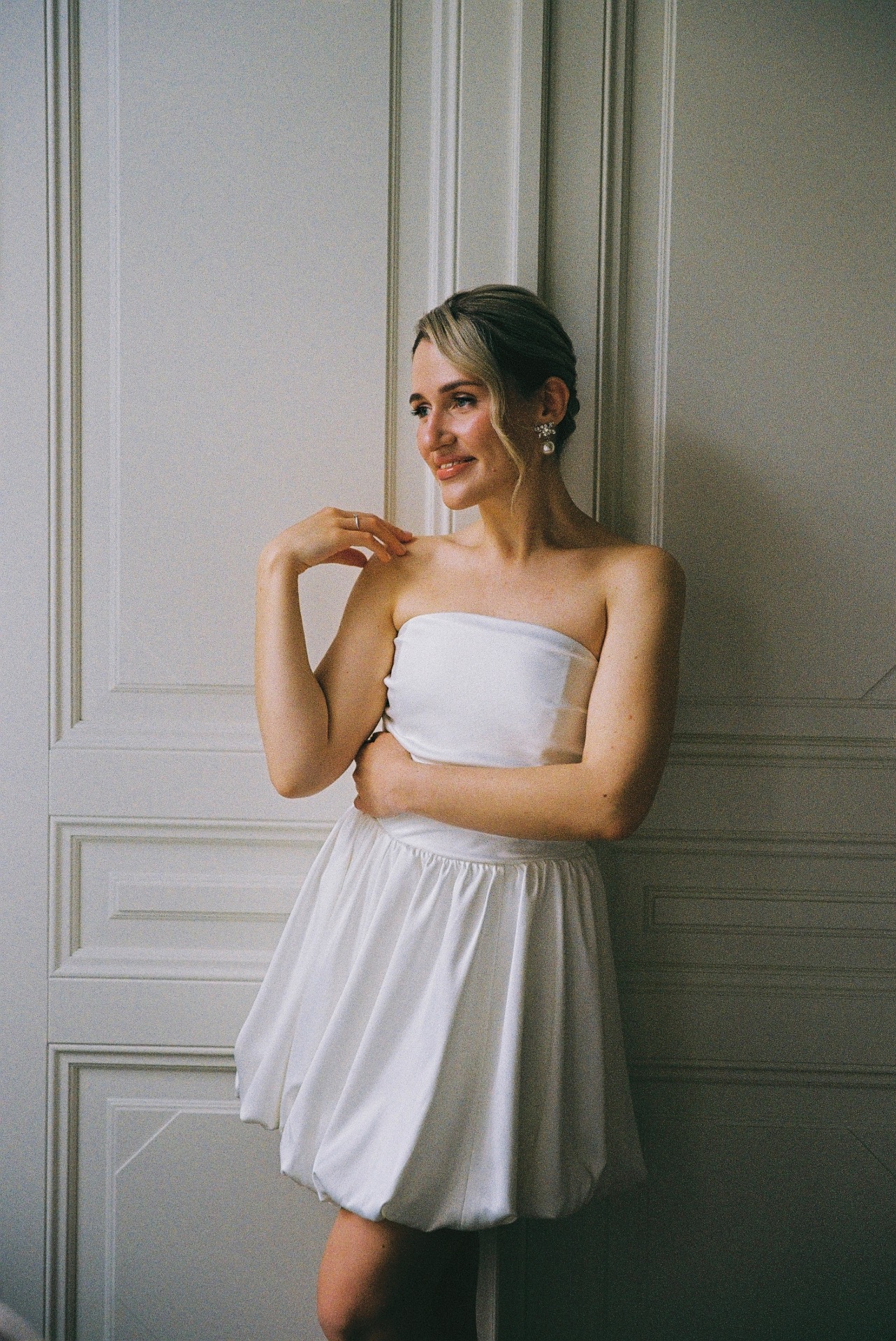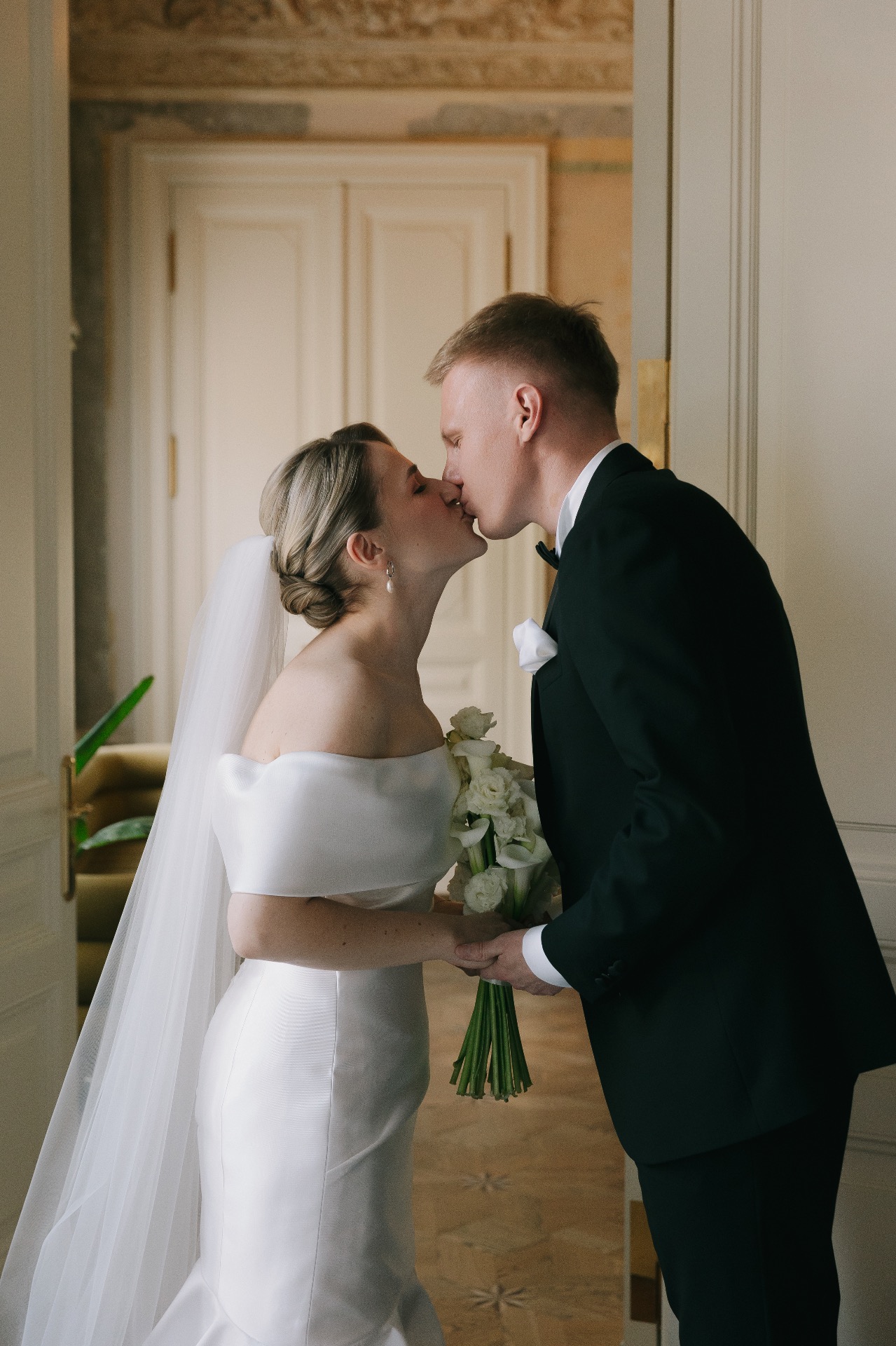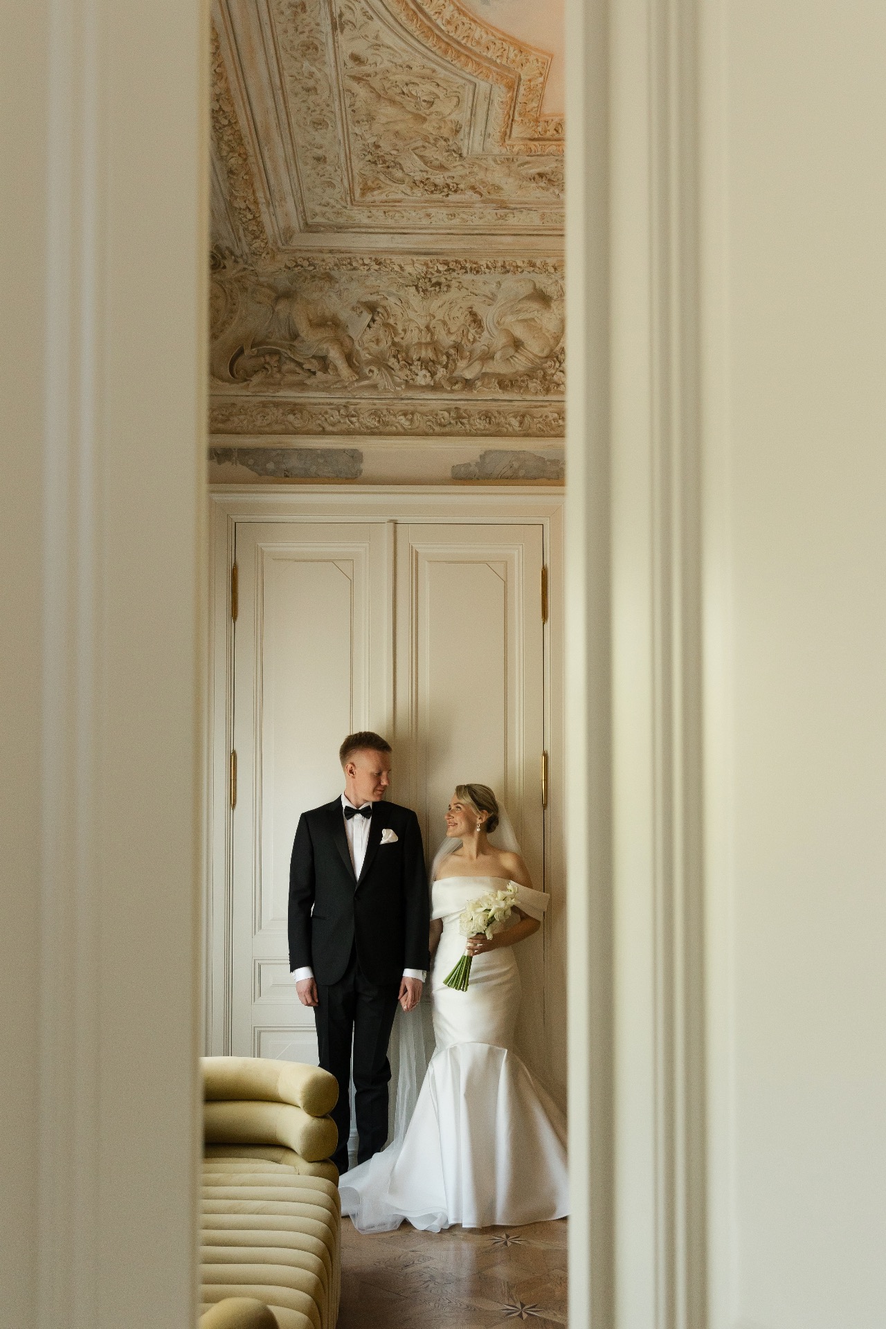 Наши образы также поддерживали выбранный стиль. Для утра, которое проходило в историческом особняке, отеле Twelve Reasons, мы выбрали более расслабленные наряды. У меня было короткое корсетное платье с юбкой-баллоном молочного цвета, а у Димы чёрные брюки и свободная сорочка.
