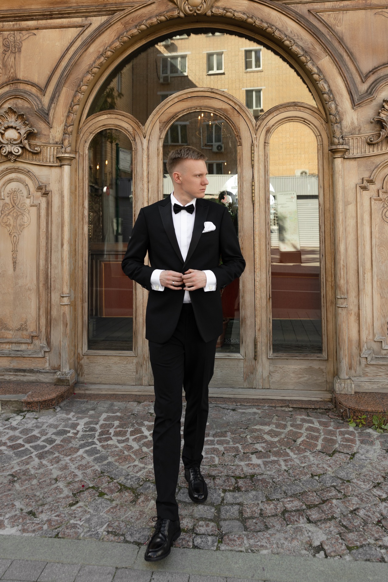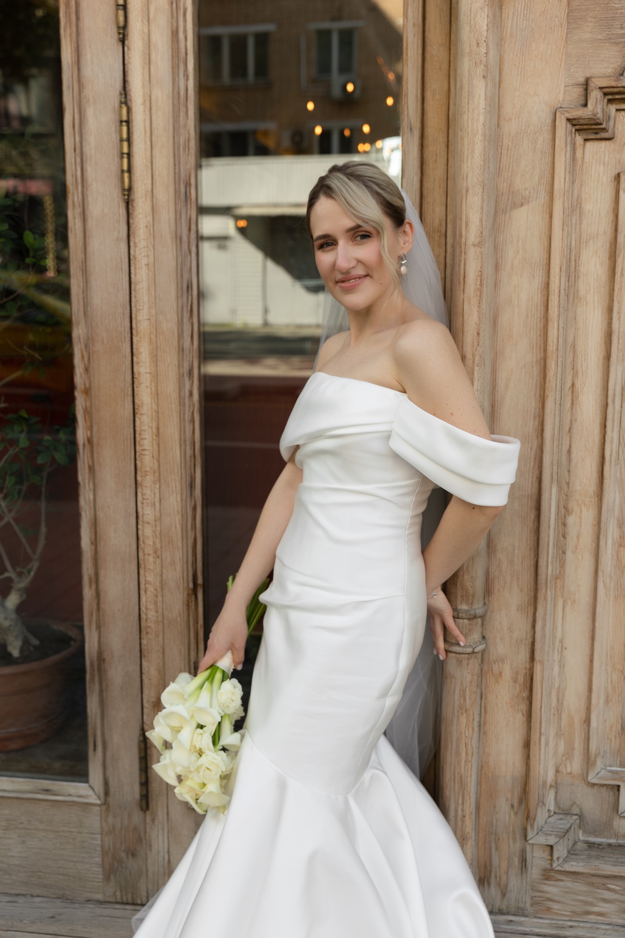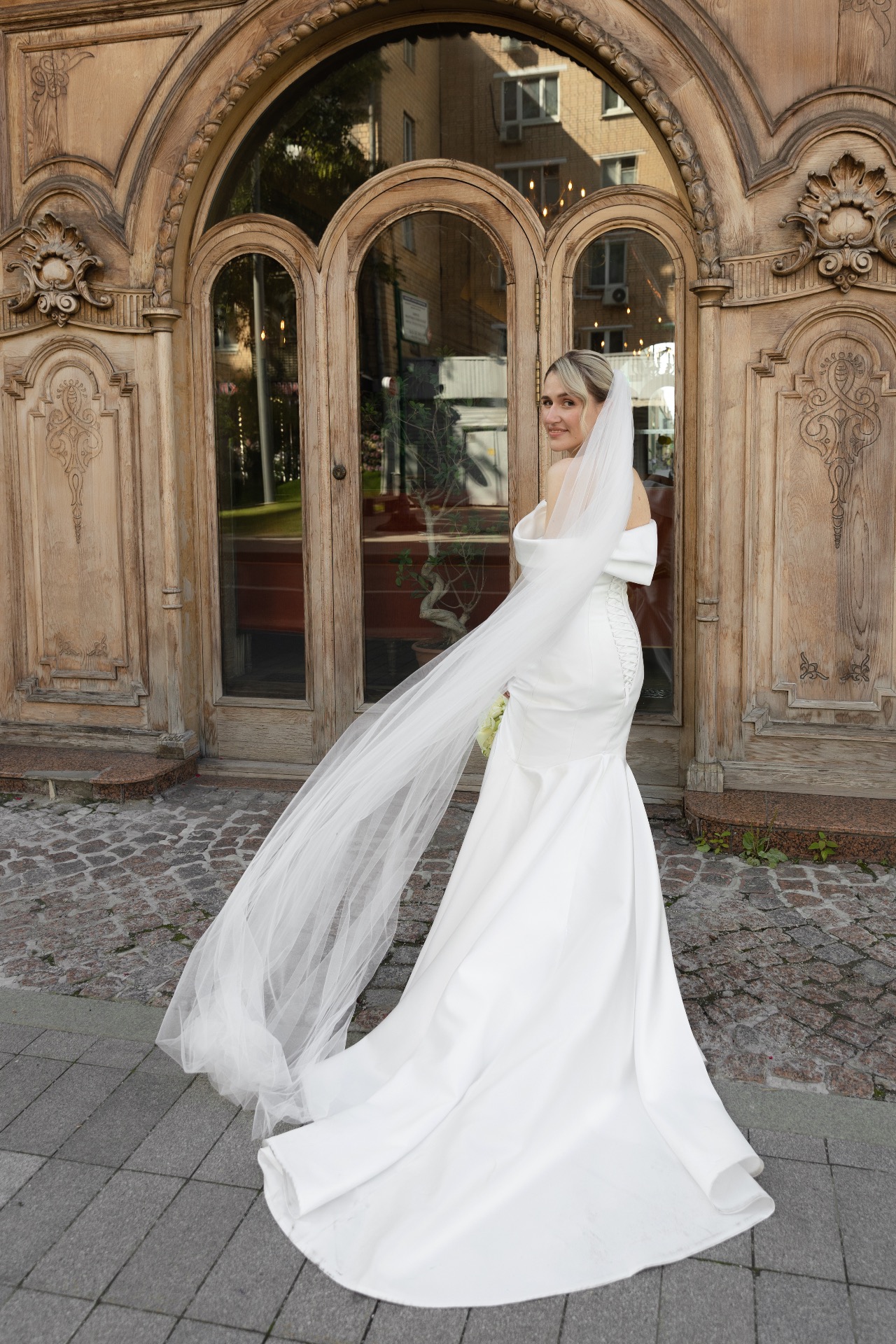 Для торжества и в качестве основного образа мне хотелось чего-то лаконичного, но не слишком простого. Поэтому я остановилась на платье изящного силуэта с открытой шнуровкой и шлейфом, дополнив его длинной фатой. Для Димы мы выбрали смокинг: чёрная классика всегда выглядит безупречно.