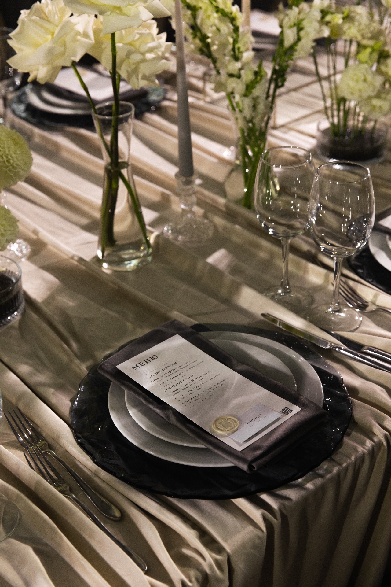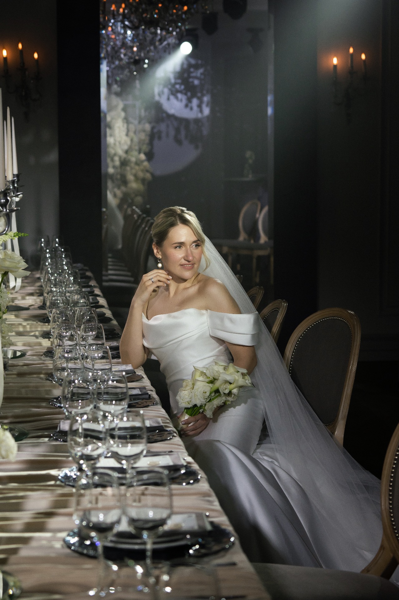 Дальнейшую подготовку мы уже вели вместе с нашим организатором Виолеттой. С первой встречи у нас возникло полное взаимопонимание, благодаря чему процесс прошёл легко и без стресса. В итоге всё сложилось идеально: сдержанная, но стильная современная классика. Красивые композиции в кензанах на столах, высокие канделябры, свечи, рояль, живая сезонная флористика белого цвета, драпировки и элегантная сервировка сделали атмосферу особенно нежной.