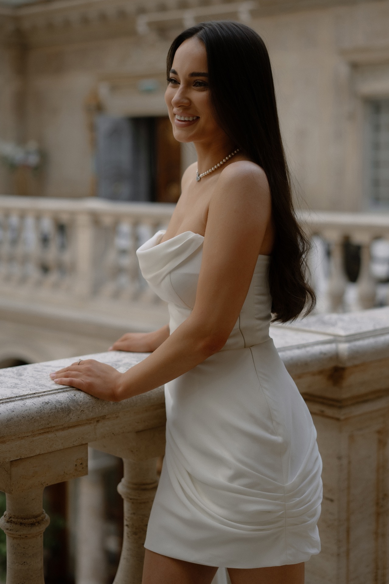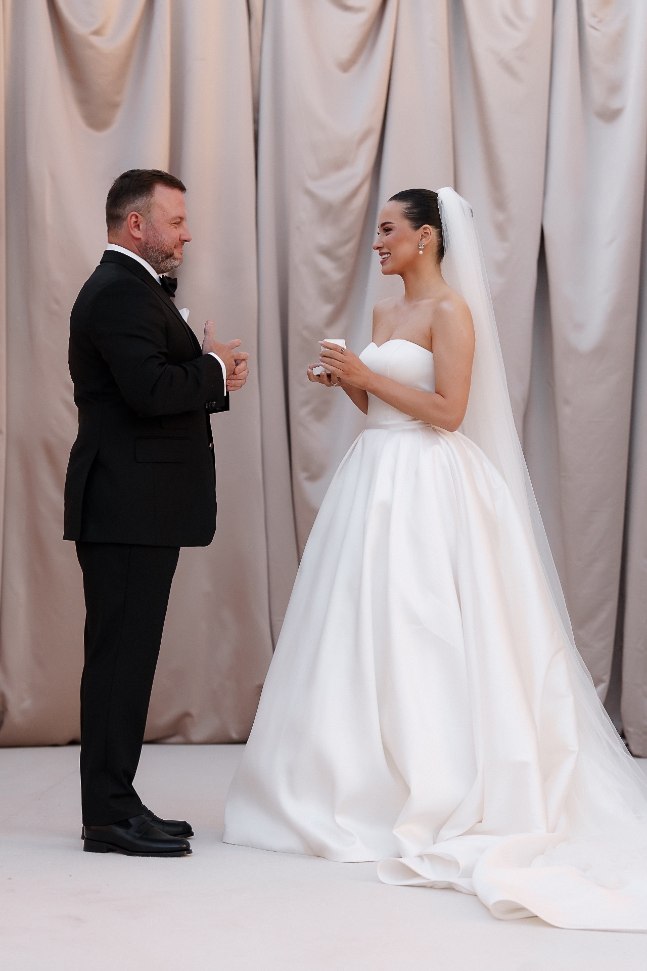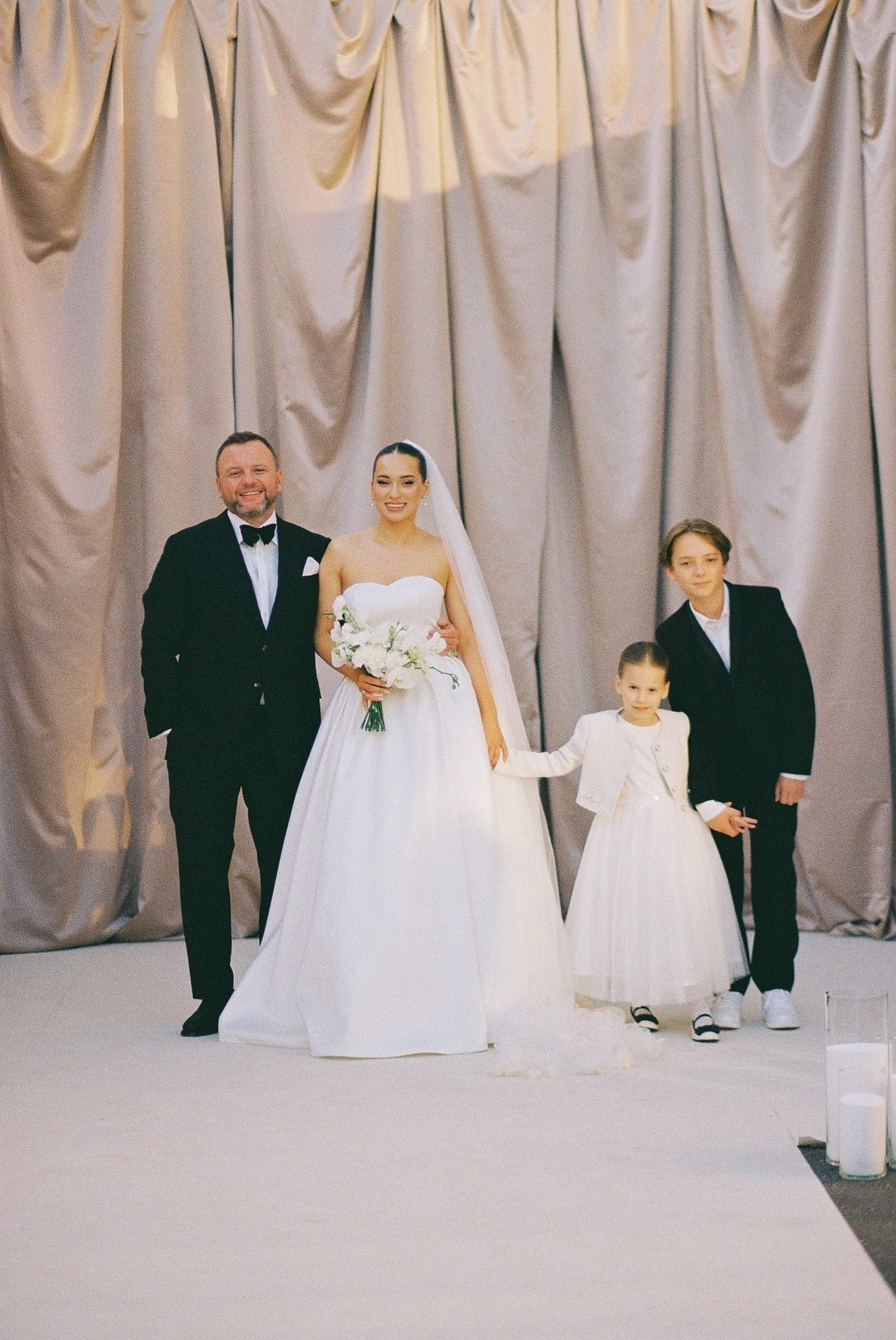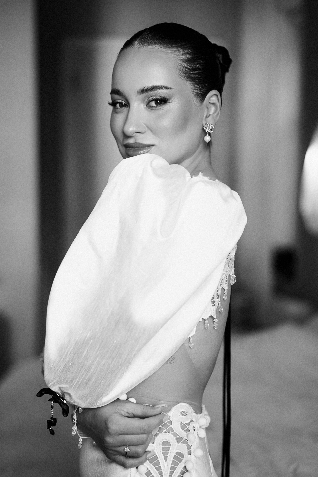 Я выбрала классическое пышное платье от Milla Nova с длинным шлейфом и воздушную длинную фату с объёмными цветами на церемонию, стильное и немного провокационное платье с чёрными бантами и кружевом от Rara Avis, которое максимально меня отражает, на банкетную часть и короткое платье с косами на вечеринку.