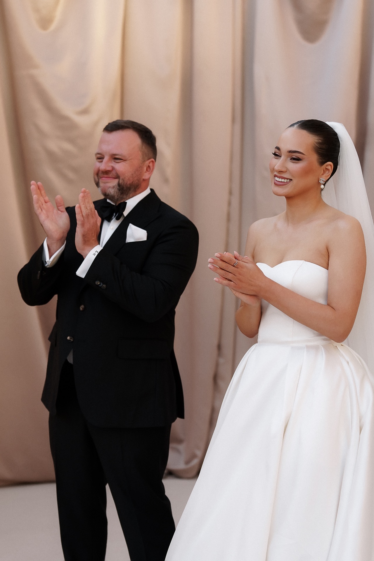 Палитра была в бежевых, кремовых оттенках, а гостей мы попросили соблюсти дресс-код тотал блэк! Чёрные платья и костюмы идеально смотрелись с бежевым цветом и, конечно, обращали особенное внимание на невесту:)