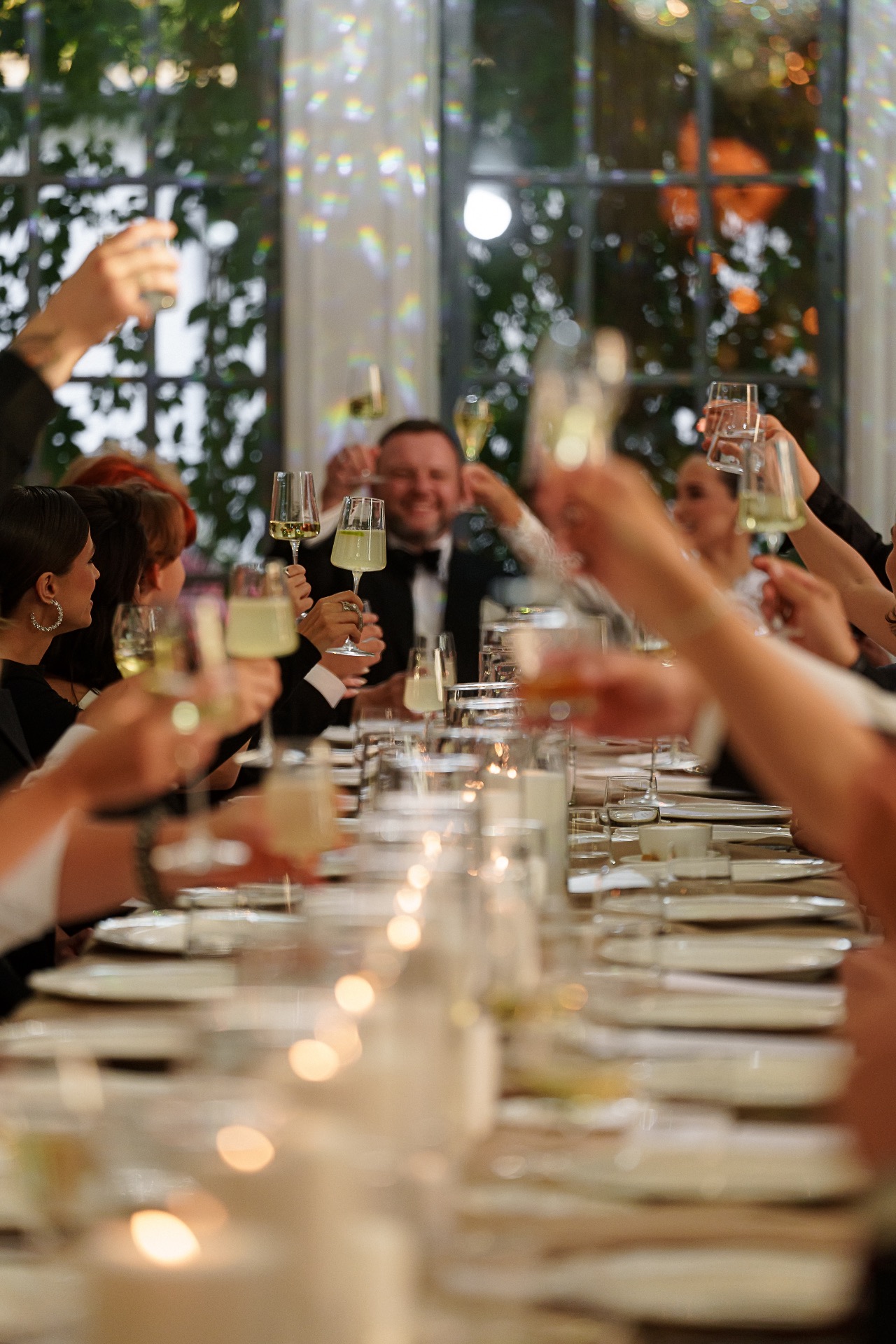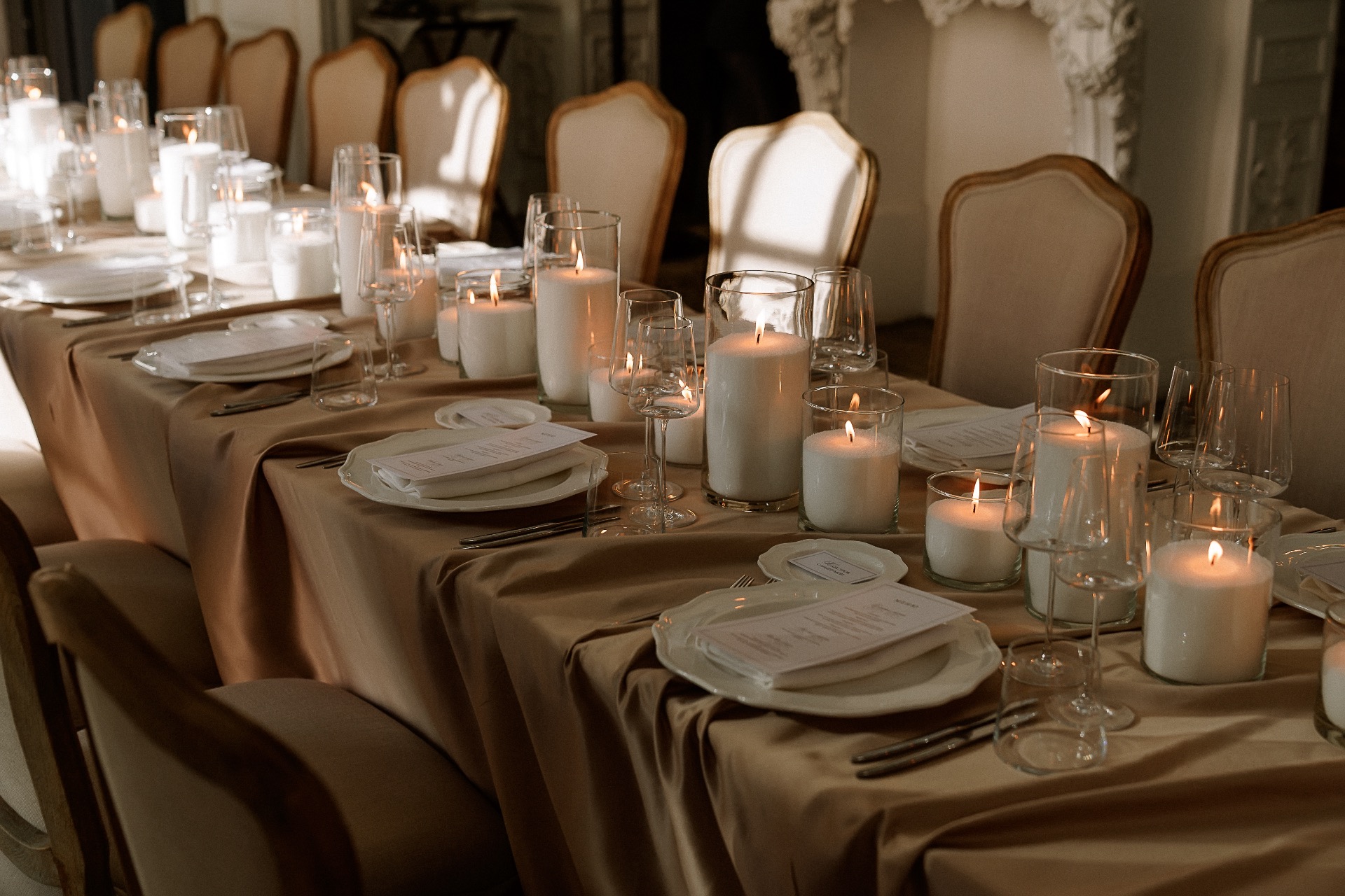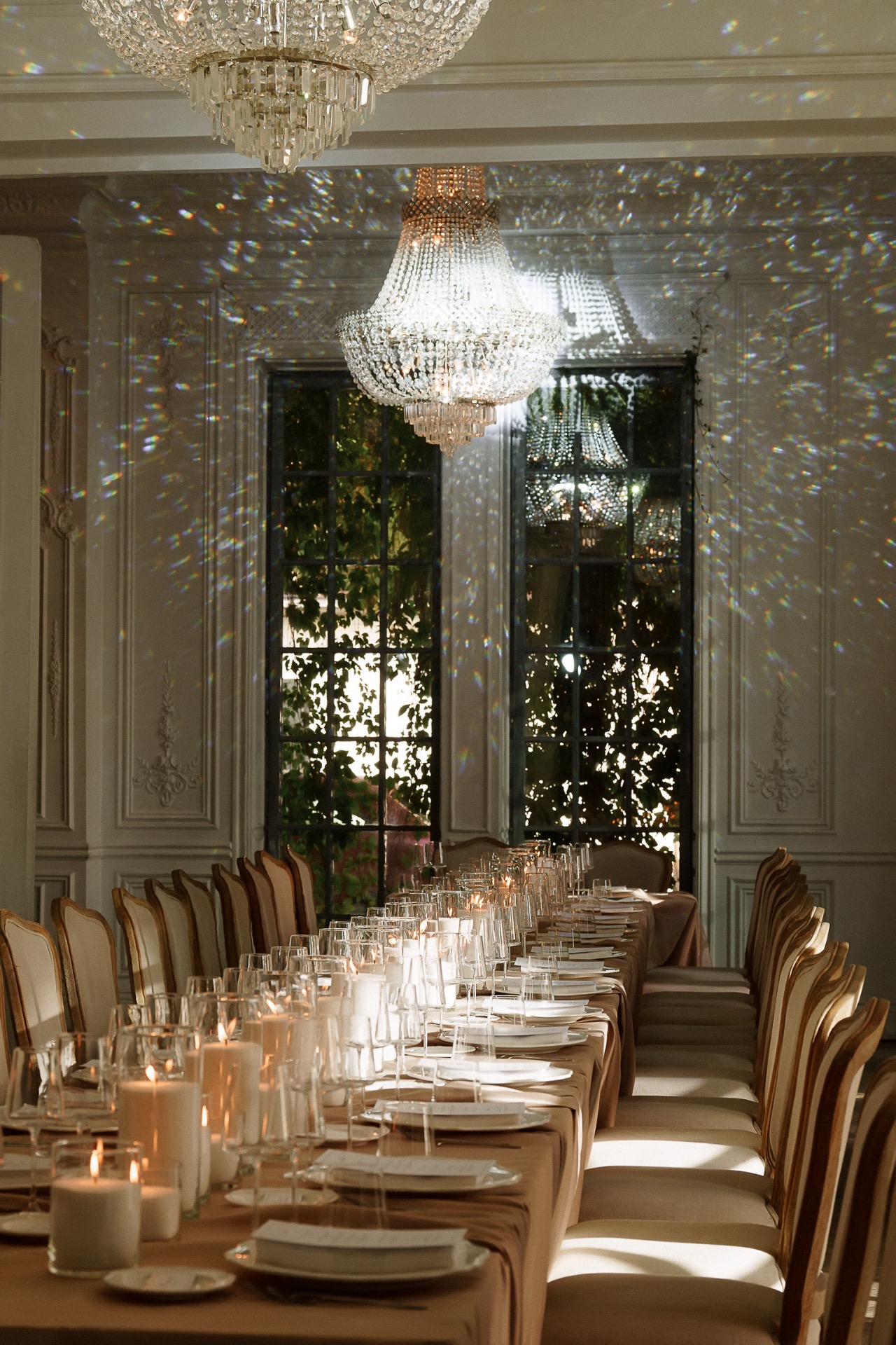 Для зоны церемонии мы выбрали занавес из бежевой ткани, также на улице гостей ждал стол с десертами и цветами. В зоне ужина осенний свет создал калейдоскоп из солнечных зайчиков! Длинный стол, проходил через 2 зала особняка — это было очень красиво!