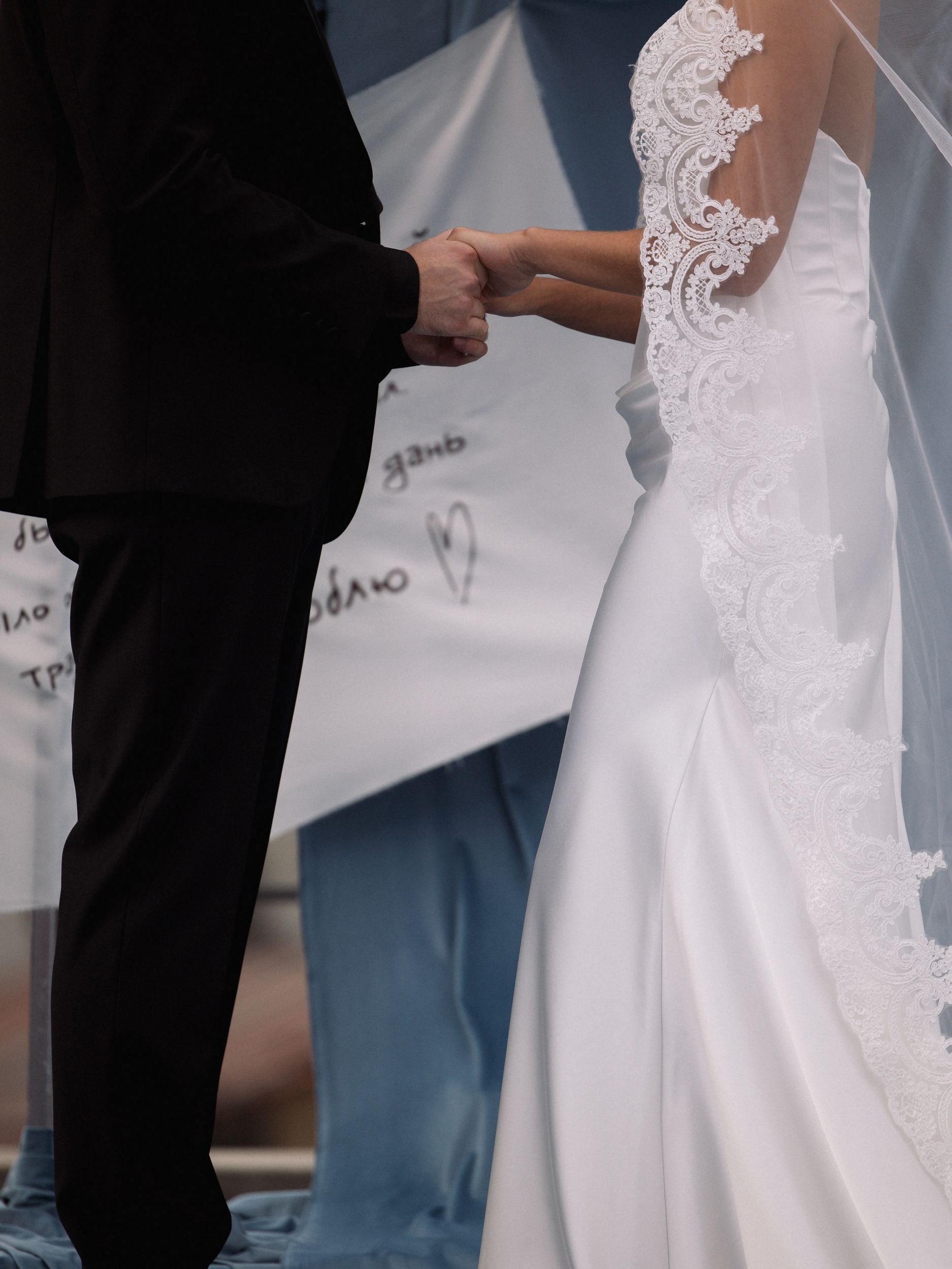 Второе платье было для церемонии: длинное, со шлейфом, я заказывала под него длинную фату-испанку с кружевом. Оно стало отдельной историей. Это был подарок от моего папы, поэтому я подошла к выбору ответственно: объехала все салоны, хотя «то самое» нашла ещё в первом — свадебном доме «Кураж».