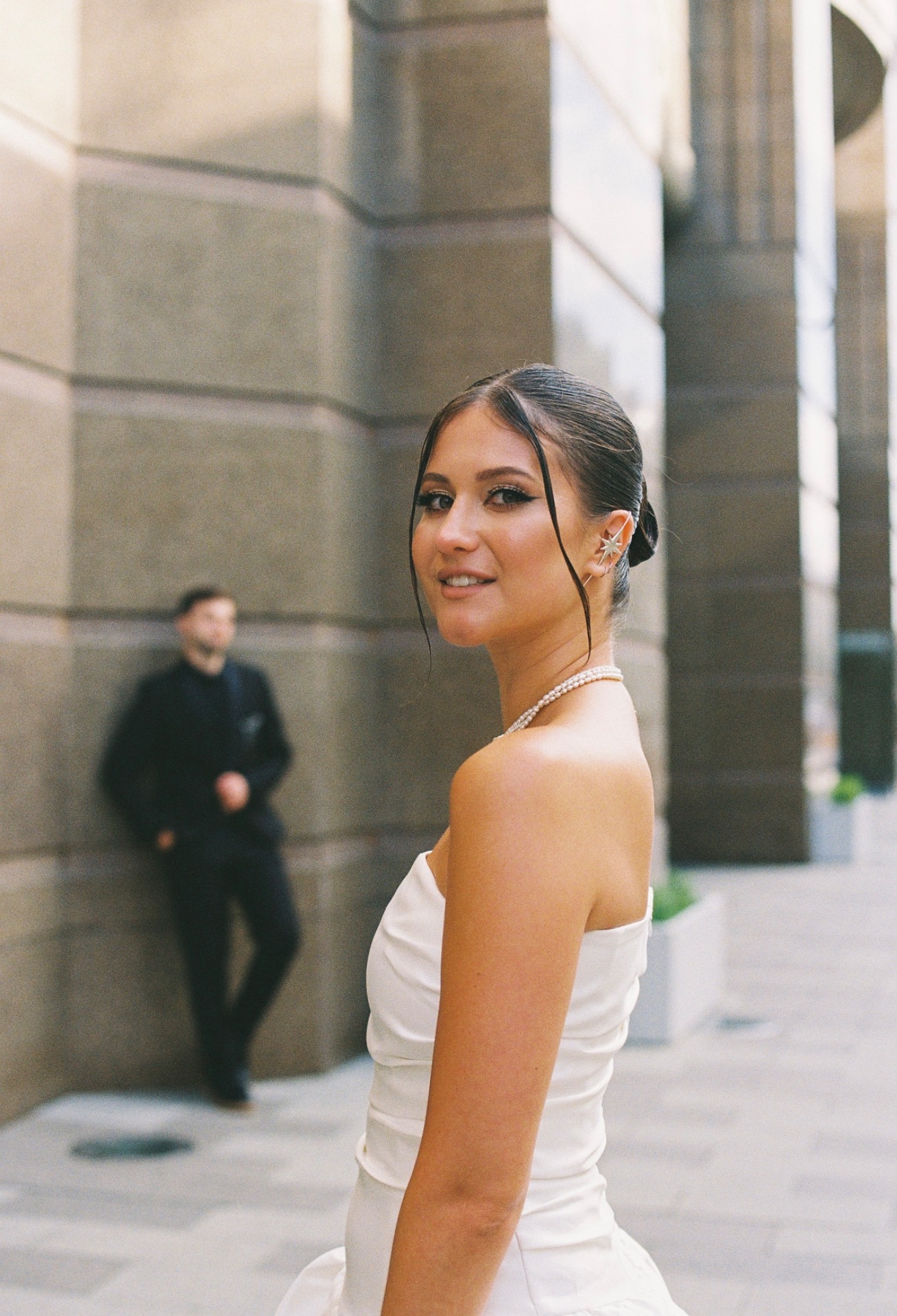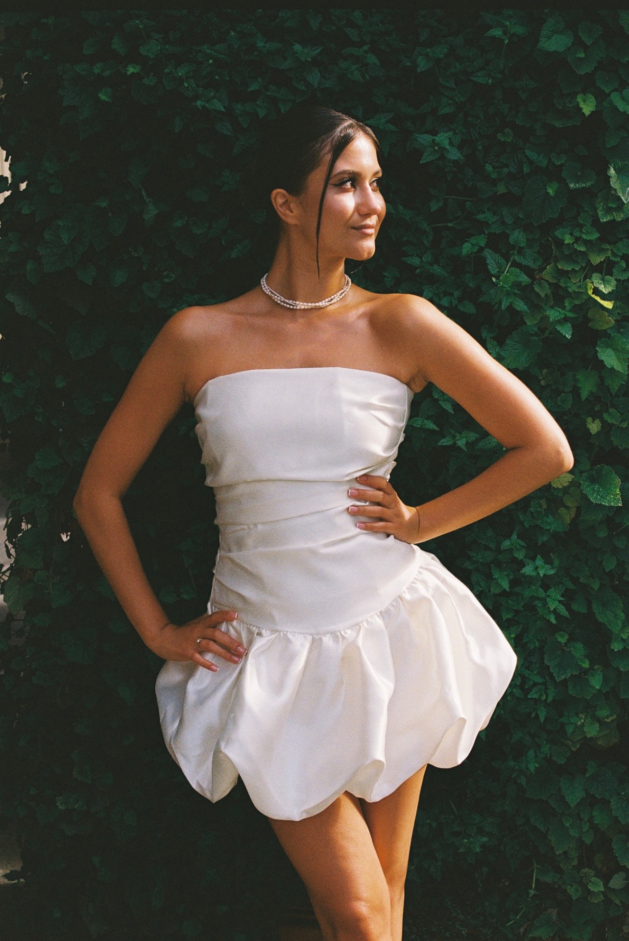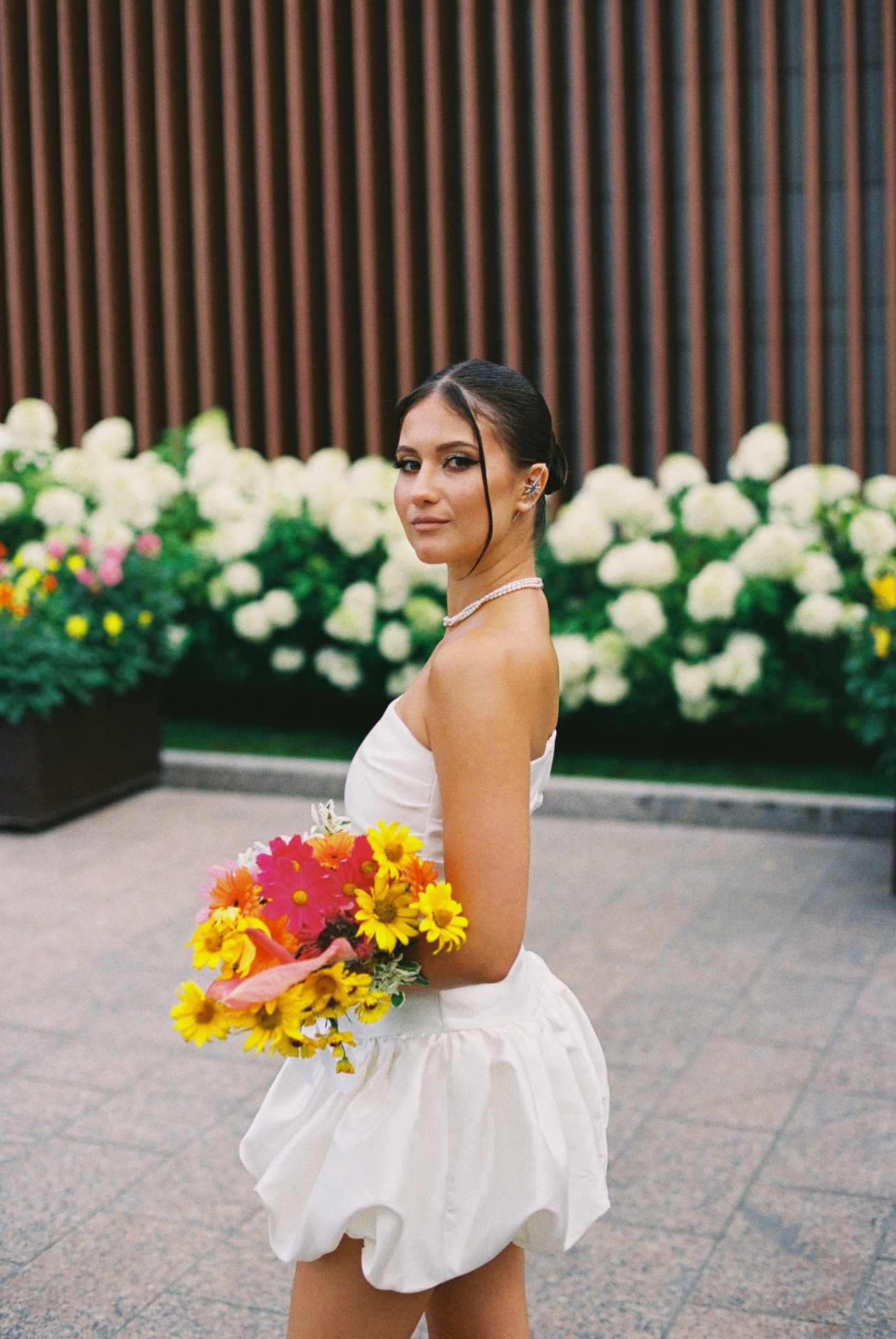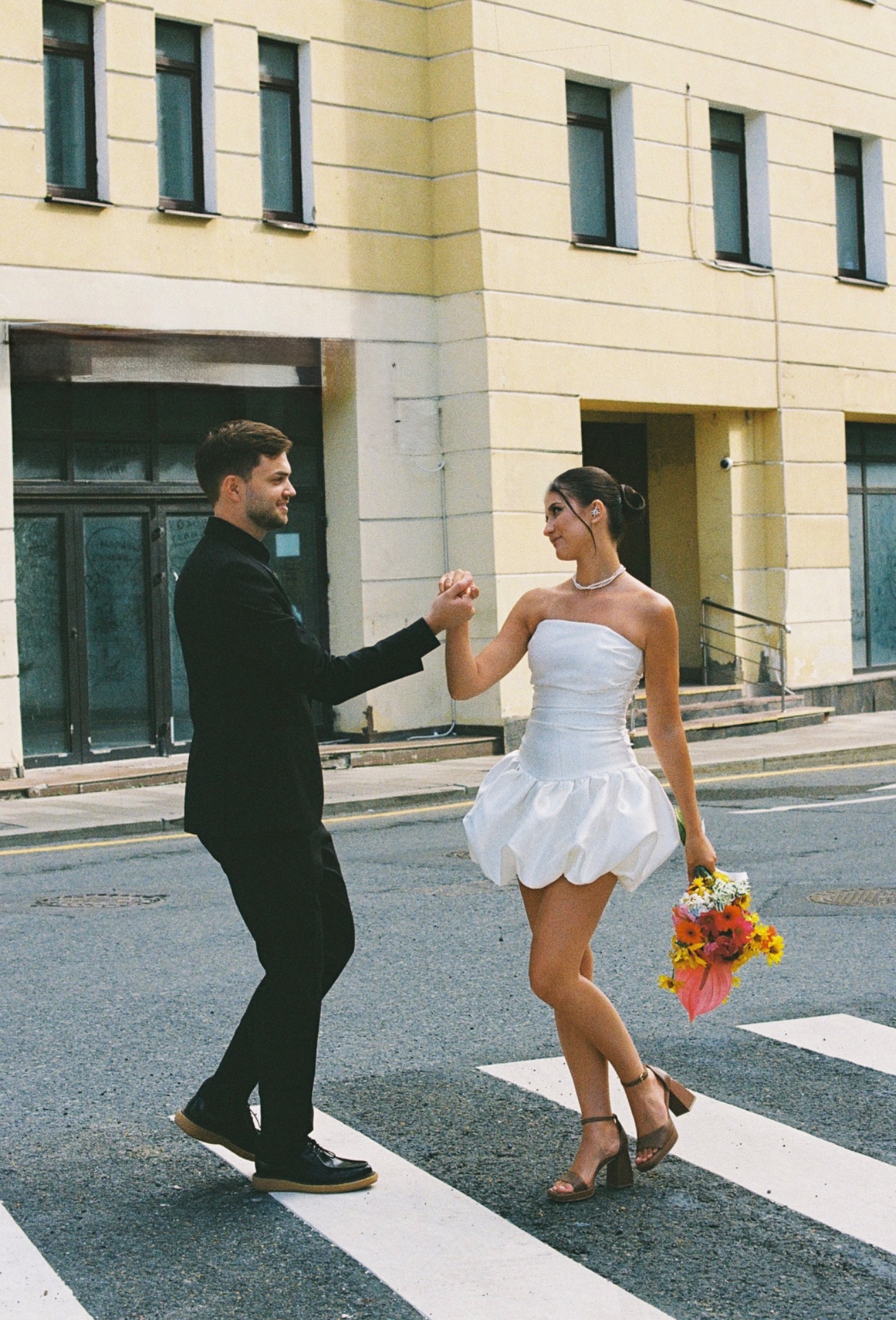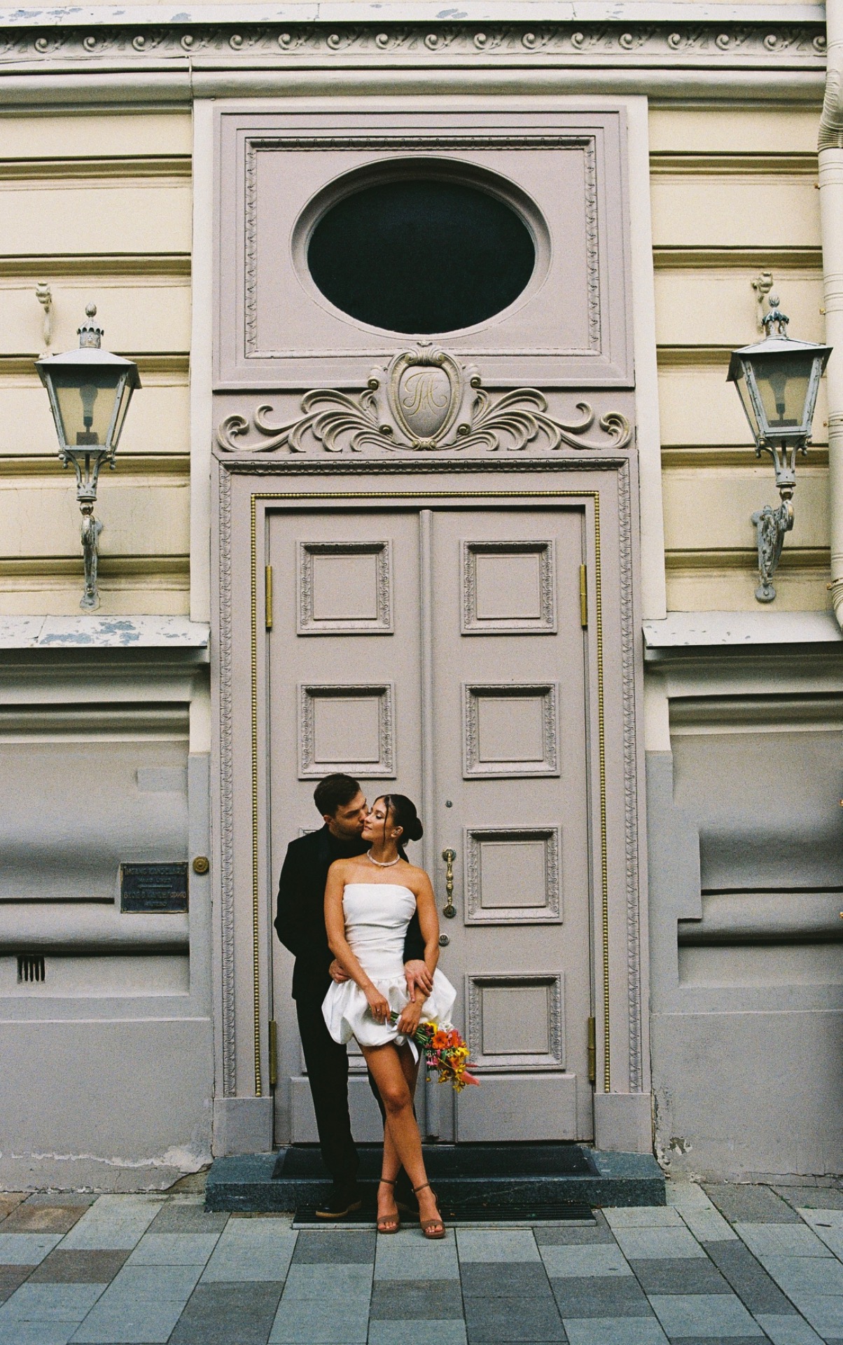 Моим первым образом был наряд для росписи и для второй части свадебного дня — короткое корсетное мини-платье с юбкой-баллоном и высокие каблуки. Простое, но эффектное, и я в нём чувствовала себя очень уверенно и красиво.