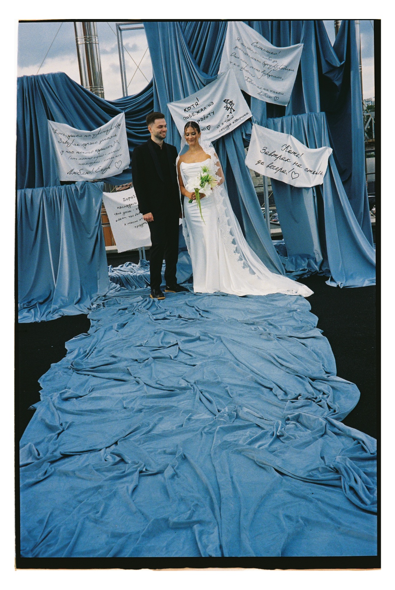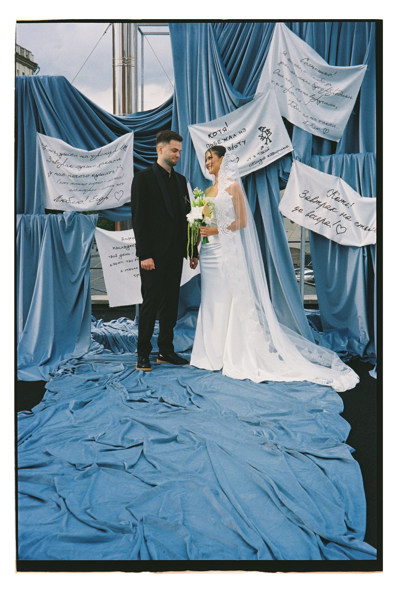 Палитру, детали, декор, концепцию и торт мы прорабатывали вместе с ними. Вдохновением была наша маленькая фишка — мы с Егором регулярно пишем друг другу записки. Я была максимально спокойной невестой, за что до сих пор благодарна агентству. Мама даже подшучивала. Мол: «Юль, у тебя так-то свадьба, надо поволноваться».