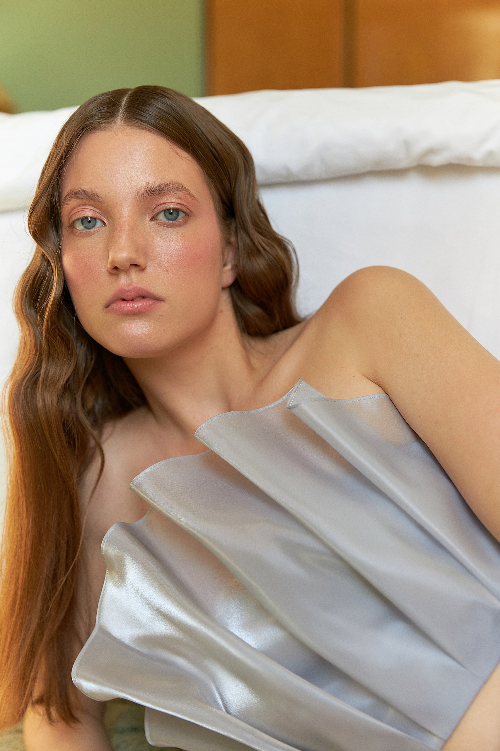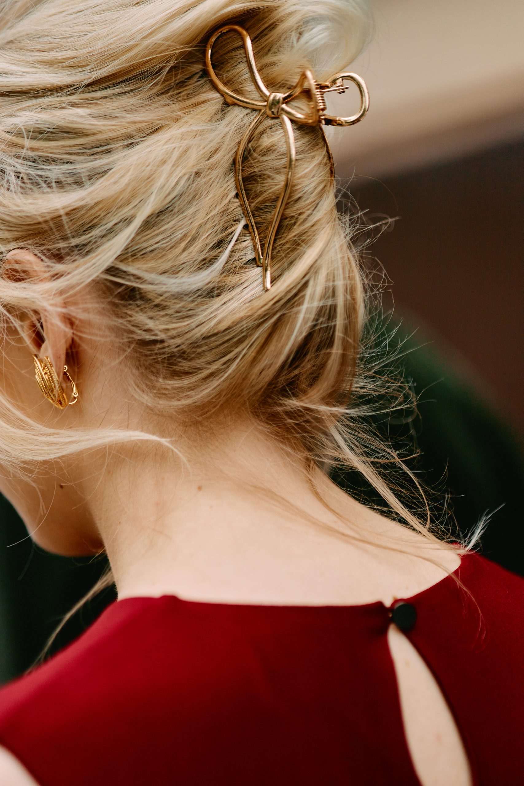 Для более легкого и романтичного образа можно выбрать небрежный пучок в современном прочтении формы — структура прически сохраняет элегантность, но добавляется еще более небрежная форма пучка. В этом варианте эксперимент — наш главный друг.
