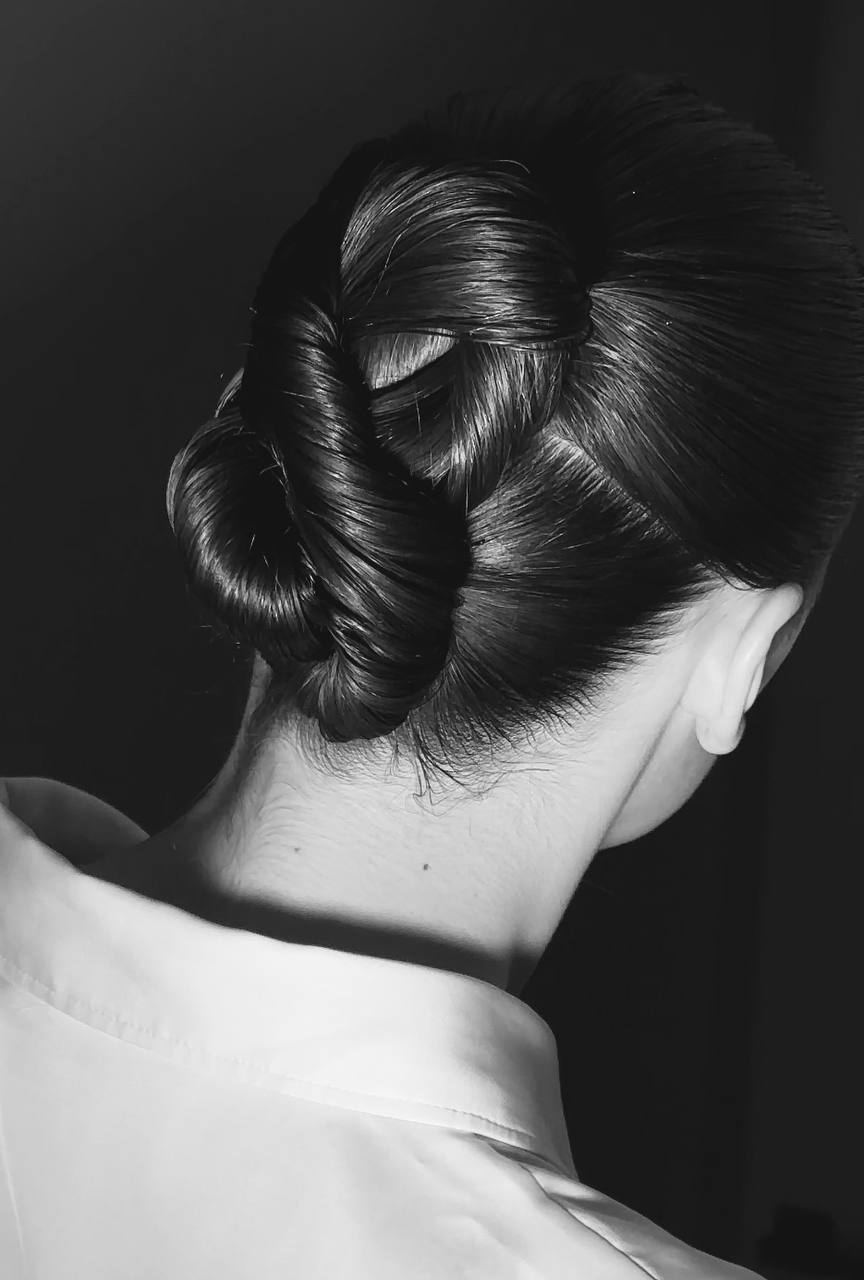 Одним из самых популярных вариантов среди классики остается гладкий пучок, который может быть не только низким, но актуальность приобретают средние и высокие с прямым пробором. При этом форма самого пучка давно вышла за рамки привычной округлой — «узел», «восьмерка» и даже элементы плетения только добавят актуальности.