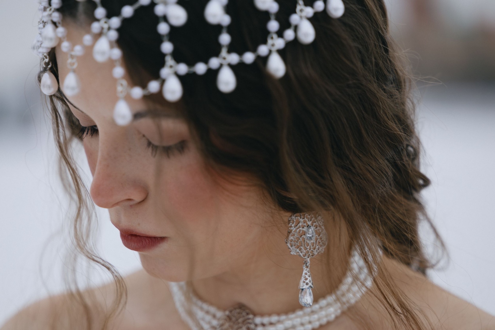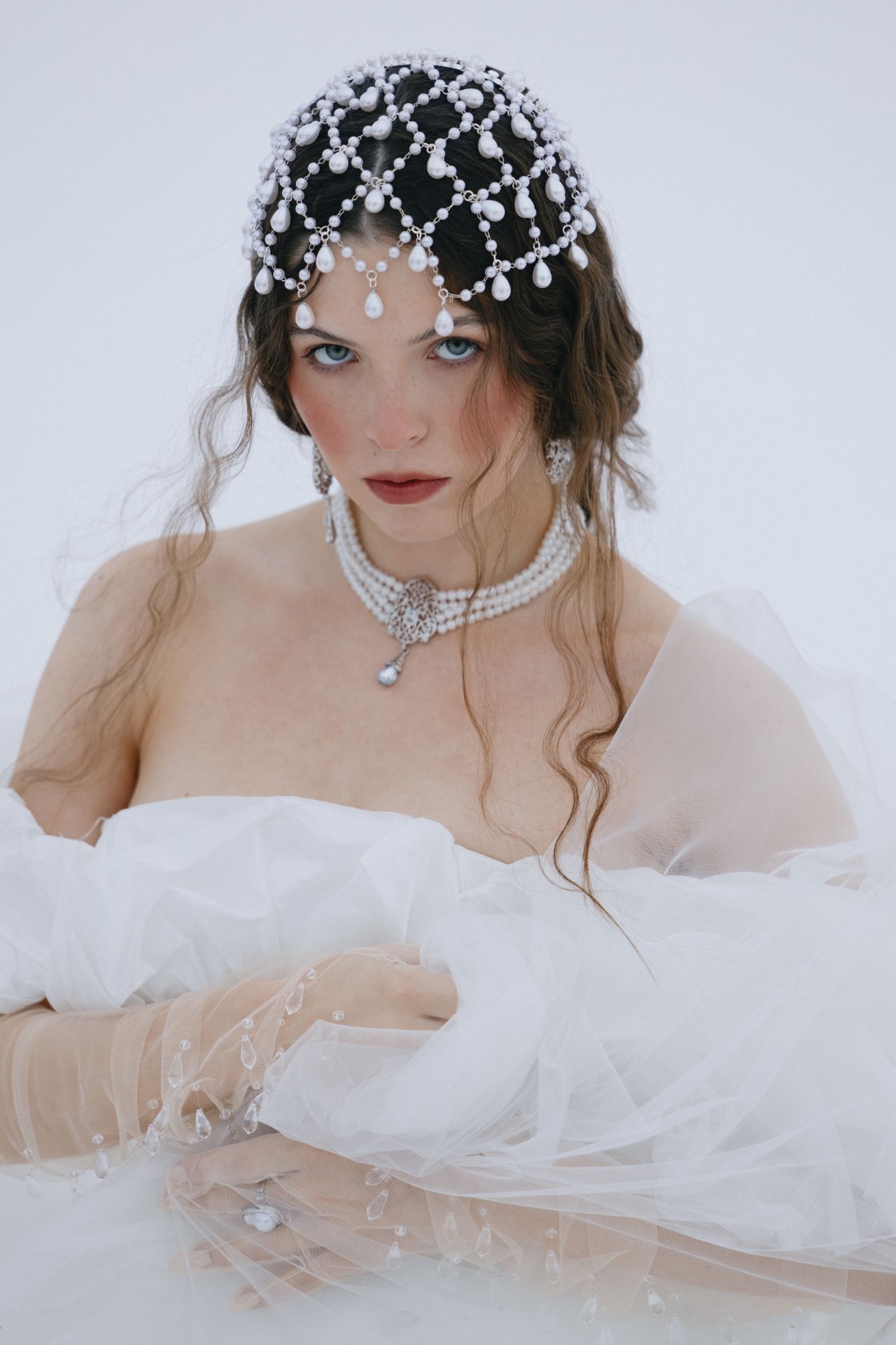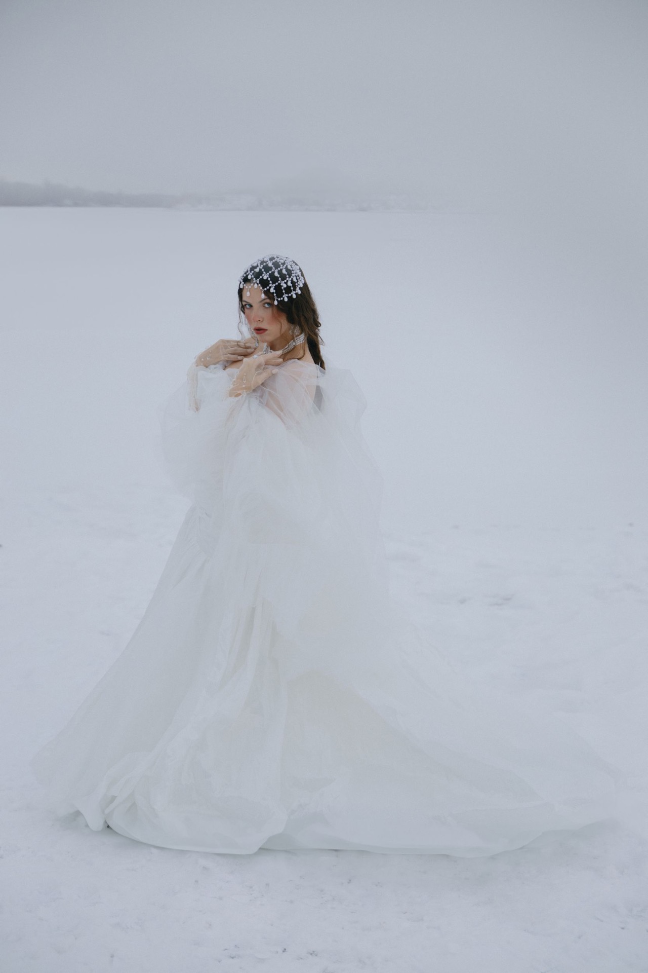 Чтобы сбалансировать наряд и оставить его свадебным, а не слишком театральным, вместо кокошника мы выбрали ободок с вуалью из жемчуга, а также тику с жемчужными вставками, которая на распущенных волосах имитировала стекающие по волосам капли воды. А для дополнительной имитации крыльев к наряду Царевны была добавлена фата с окантовкой.