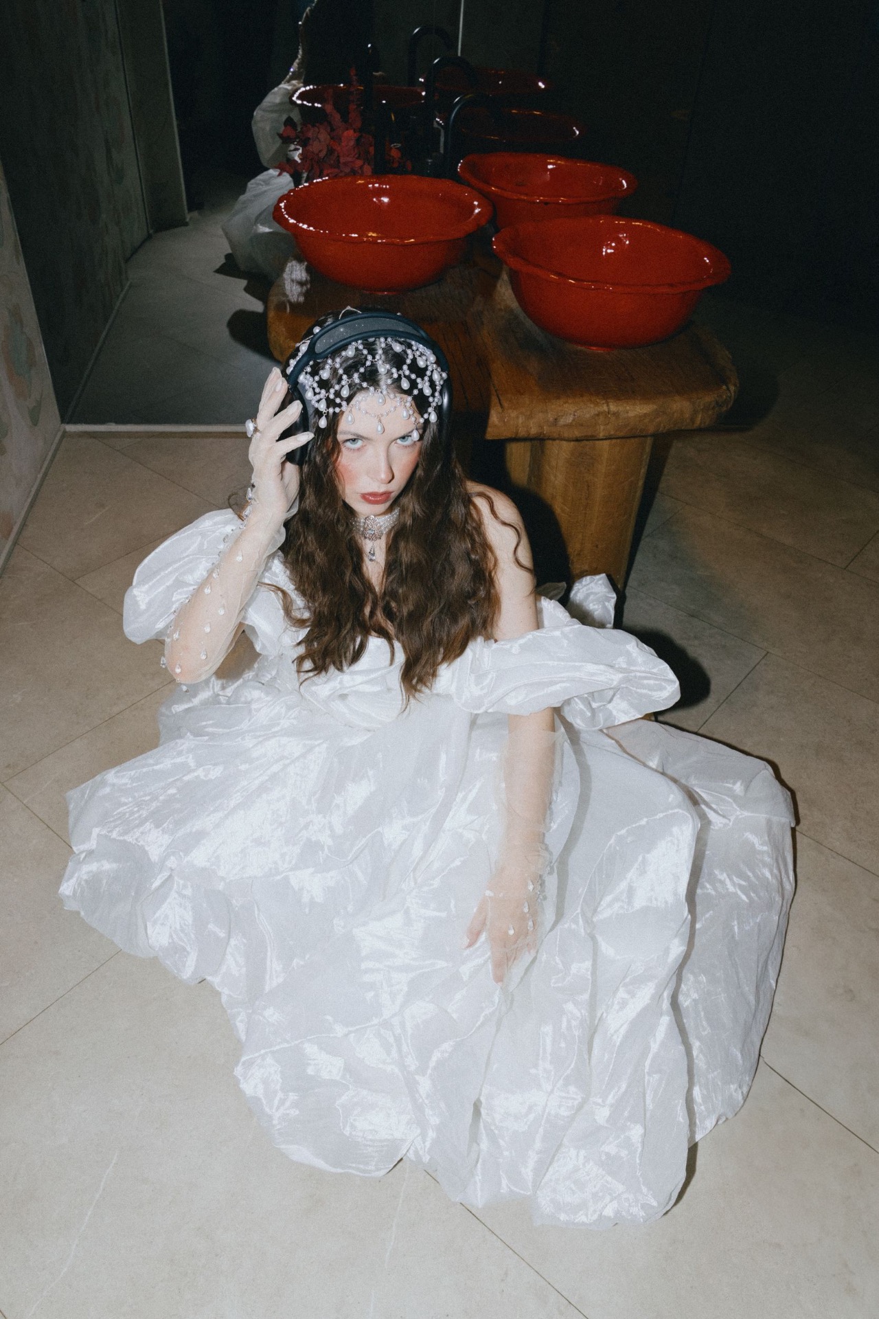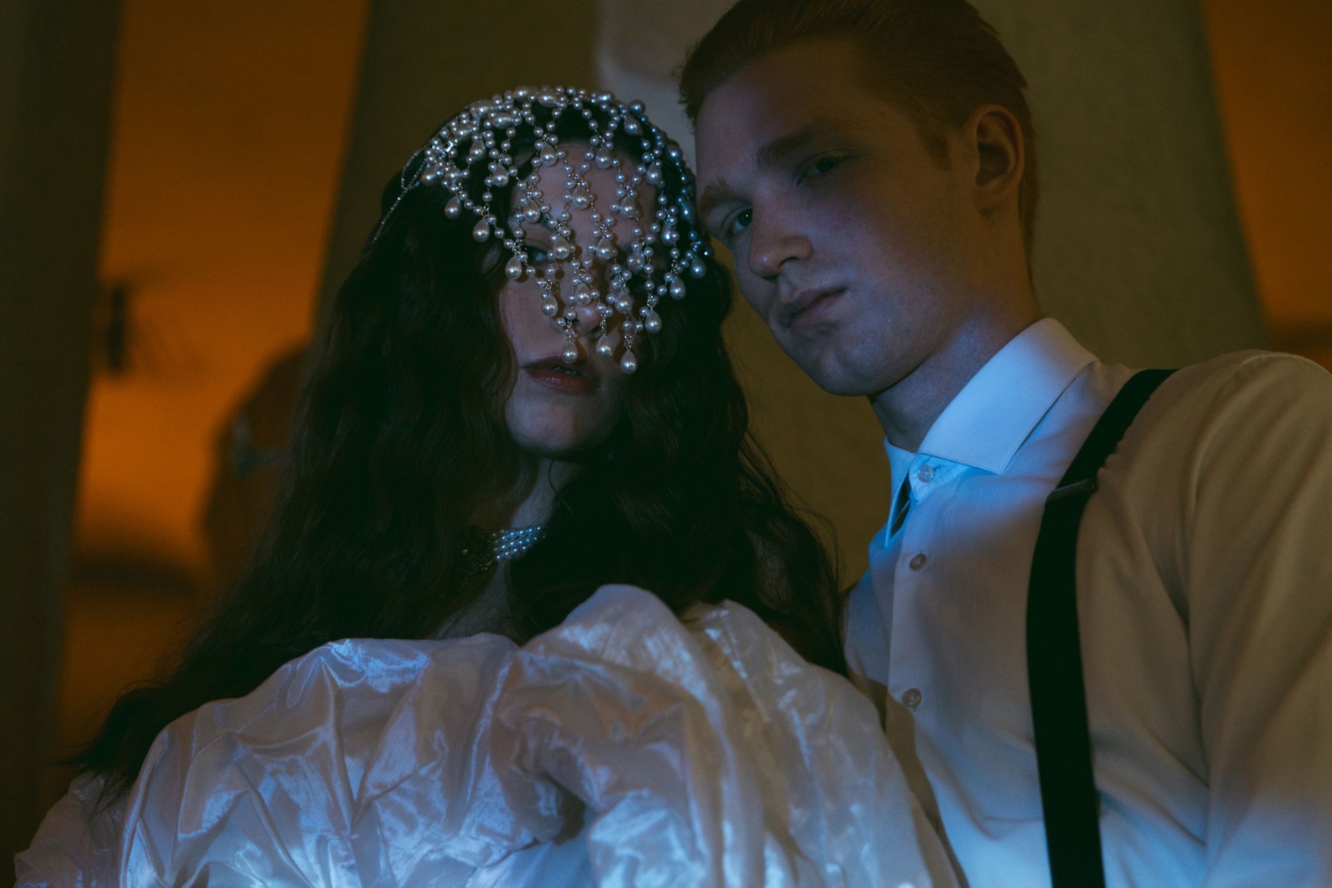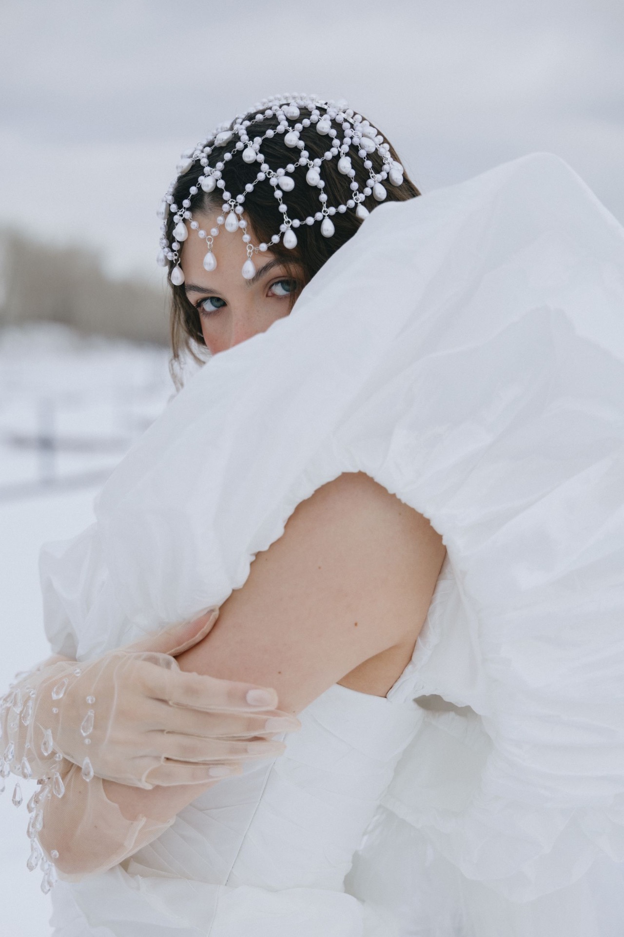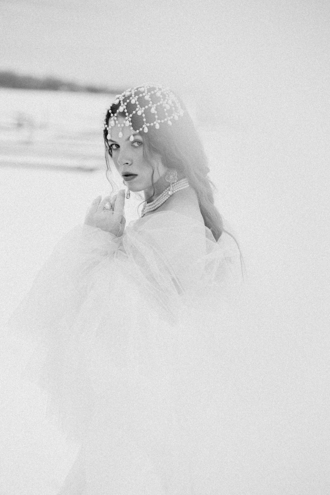 Чтобы сбалансировать наряд и оставить его свадебным, а не слишком театральным, вместо кокошника мы выбрали ободок с вуалью из жемчуга, а также тику с жемчужными вставками, которая на распущенных волосах имитировала стекающие по волосам капли воды. А для дополнительной имитации крыльев к наряду Царевны была добавлена фата с окантовкой.