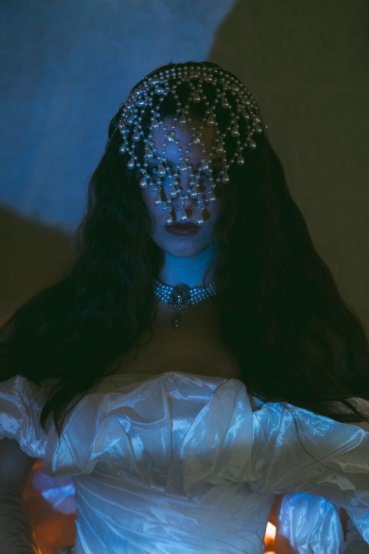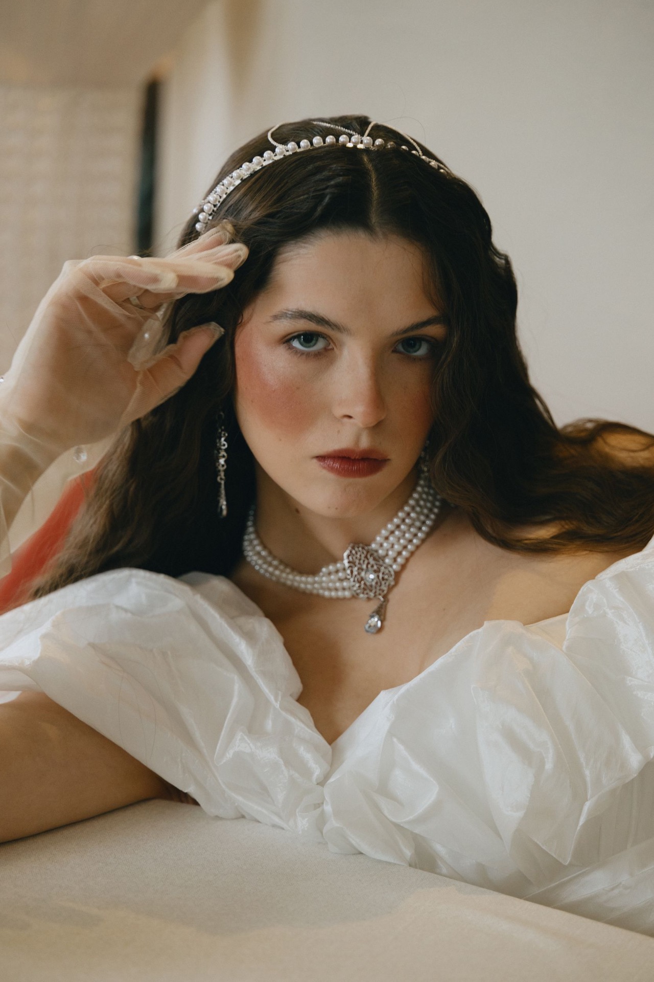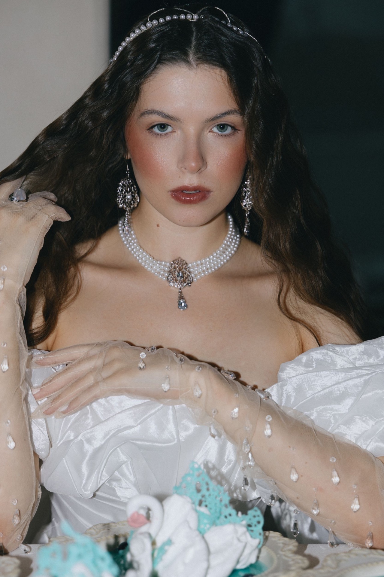 А многослойное колье из жемчуга с кулоном из серебра со вставками из голубых кристаллов в стилистике царской России и серьги аналогичной кулону формы идеально дополнили образ.