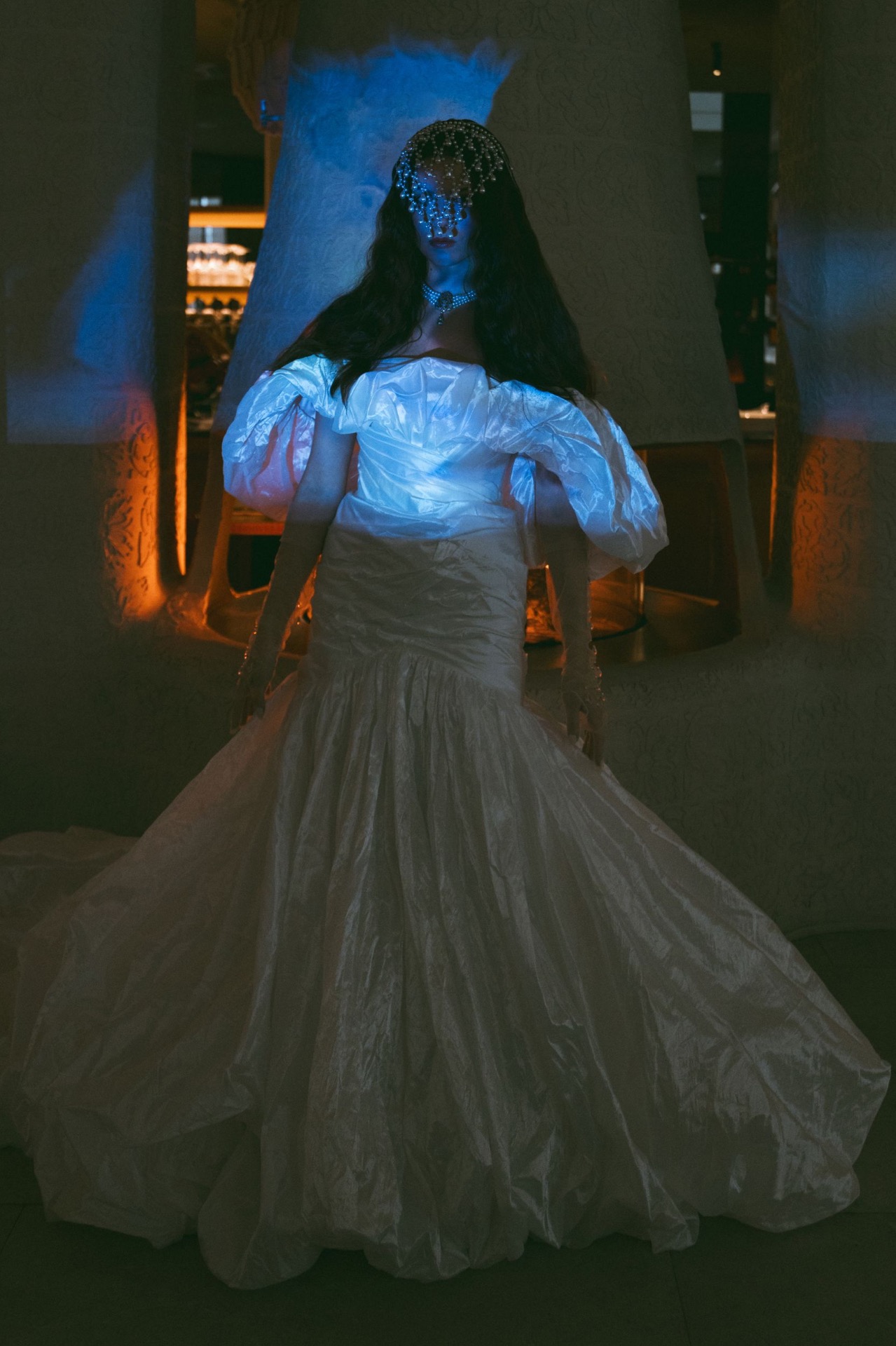Для образа невесты было выбрано платье из жатой тафты с объёмными воланами на плечах, уходящими назад и имитирующими крылья. Наряд был дополнен перчатками из телесной сетки с прозрачными кристаллами, которые имитировали капли воды, будто Царевна Лебедь только что вышла из волн. Ещё одним аксессуаром стало крупное кольцо из серебряного металла с жемчугом фантазийной формы.