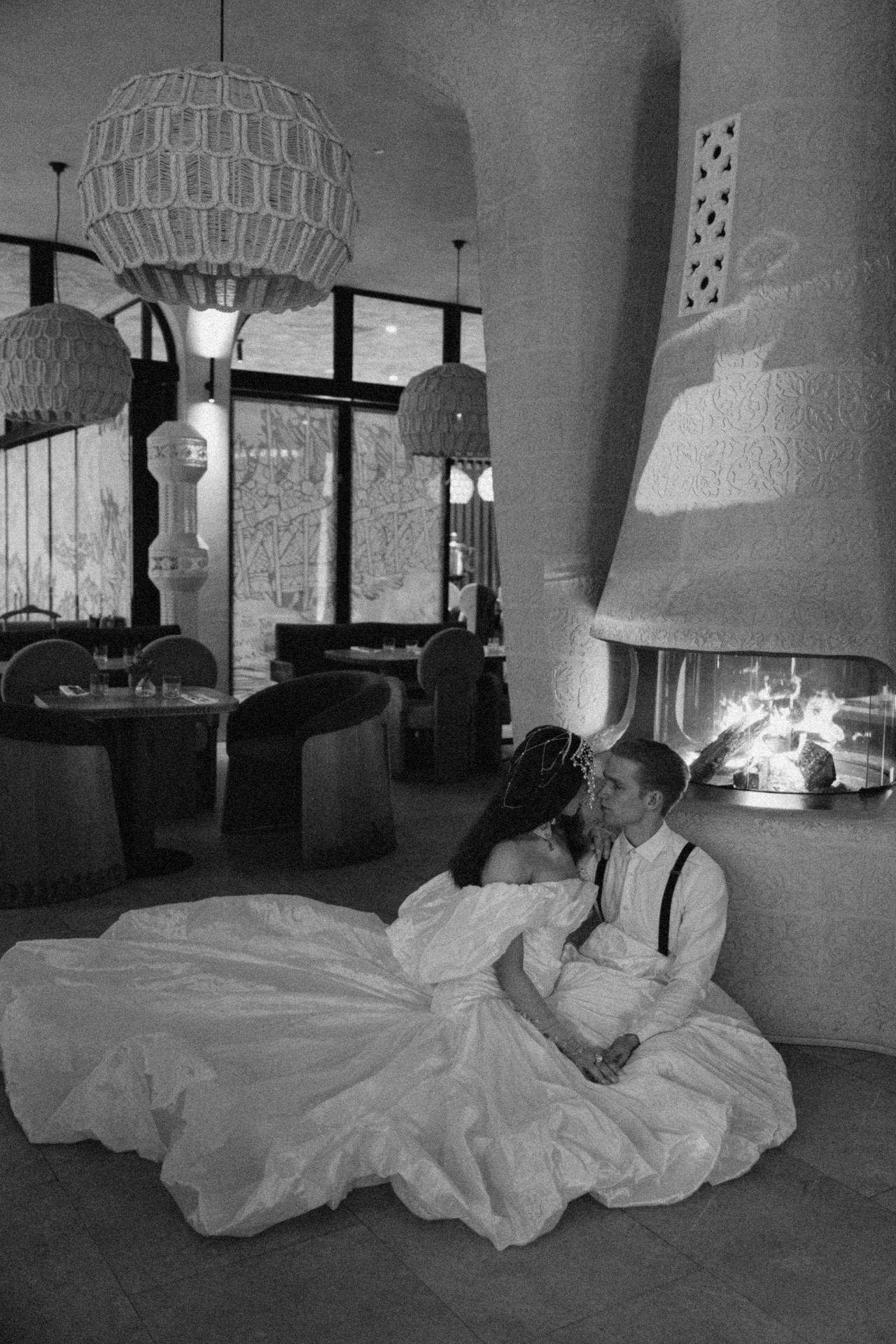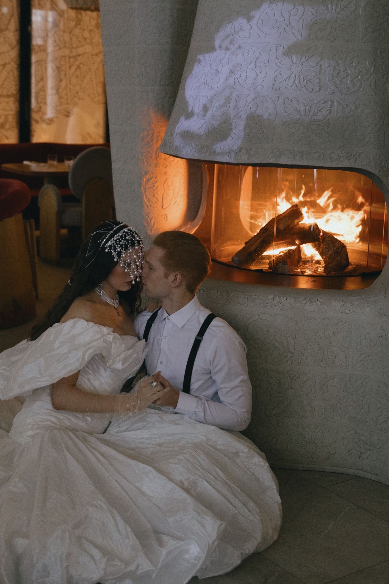 Для дополнительных визуальных акцентов фотограф использовала в процессе создания кадров проектор: изображение вариации «Умирающего лебедя» в исполнении Галины Улановой было спроецировано на резной камин ресторана.