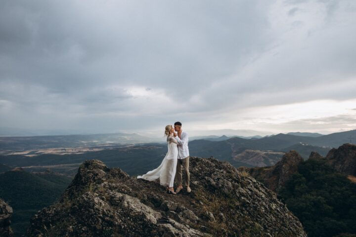 Когда мы прибыли на локацию, горы были полностью погружены в быстро движущиеся густые облака. Атмосфера была невероятно таинственной. И даже несмотря на то, что все самые красивые виды были скрыты от нас, мы отправились на крепость, чтобы начать церемонию. Эвелина и Артур читали свои клятвы друг другу, хотя ветер буквально срывал слова с их губ. Ребята дрожали, но сказали друг другу самые долгожданные слова! И эти слова разнеслись по всем горам и долинам, заряжая воздух вокруг абсолютным счастьем.