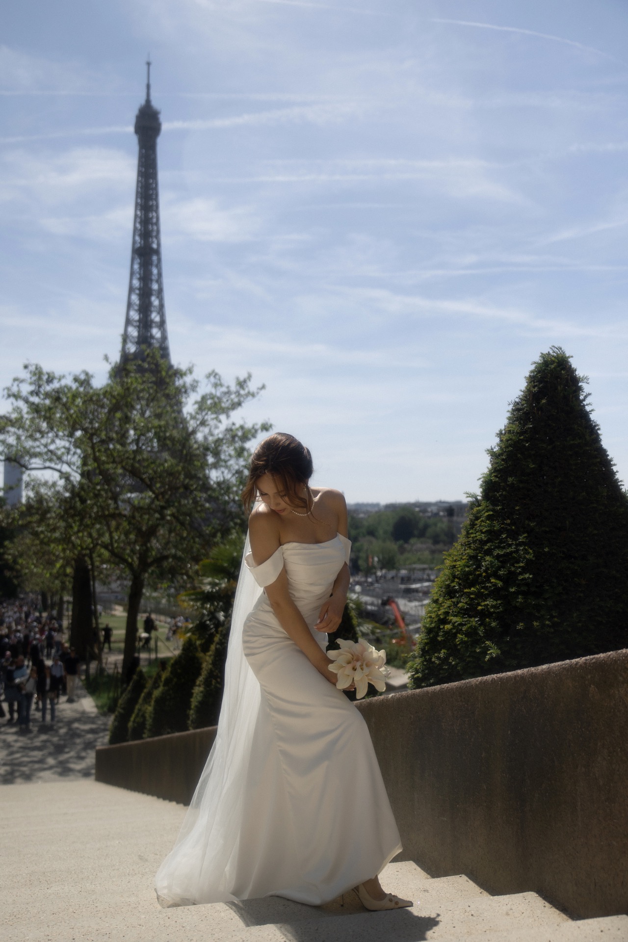 А для официальной регистрации и фотосессии у Эйфелевой башни у меня было классическое, лаконичное белое платье, которое мне тоже очень нравилось.