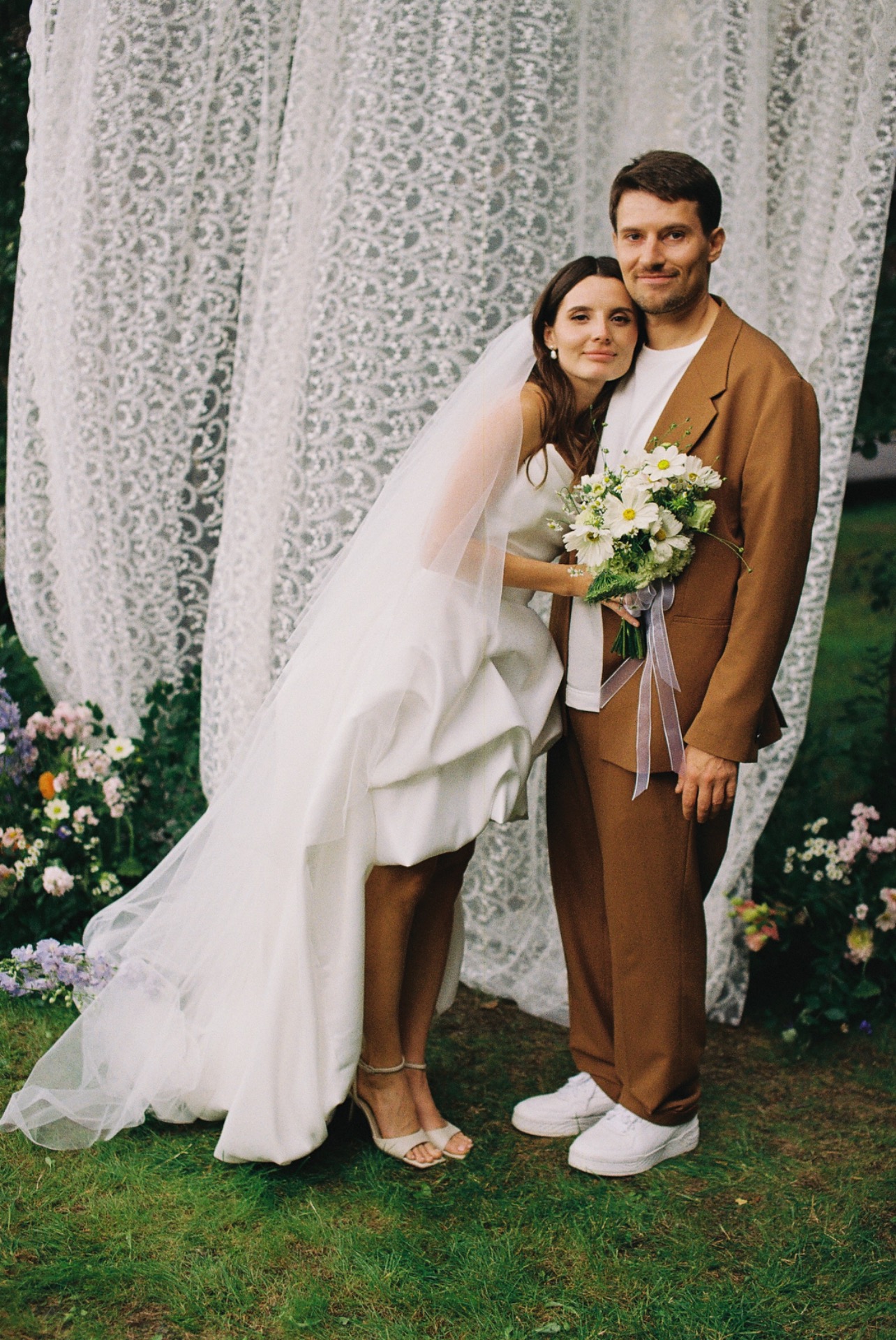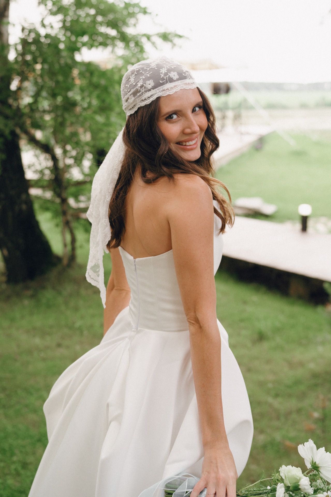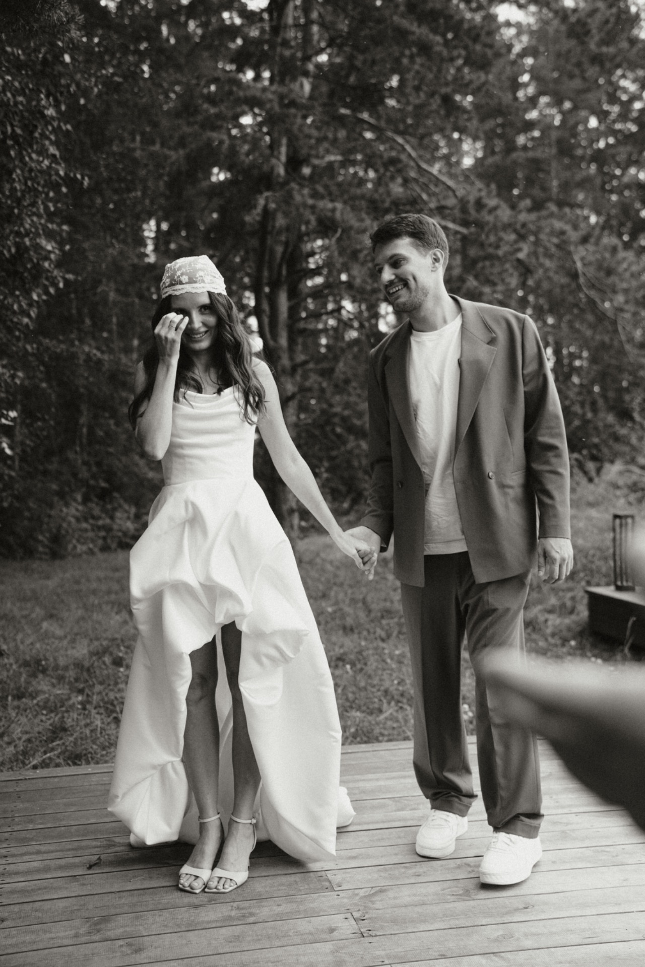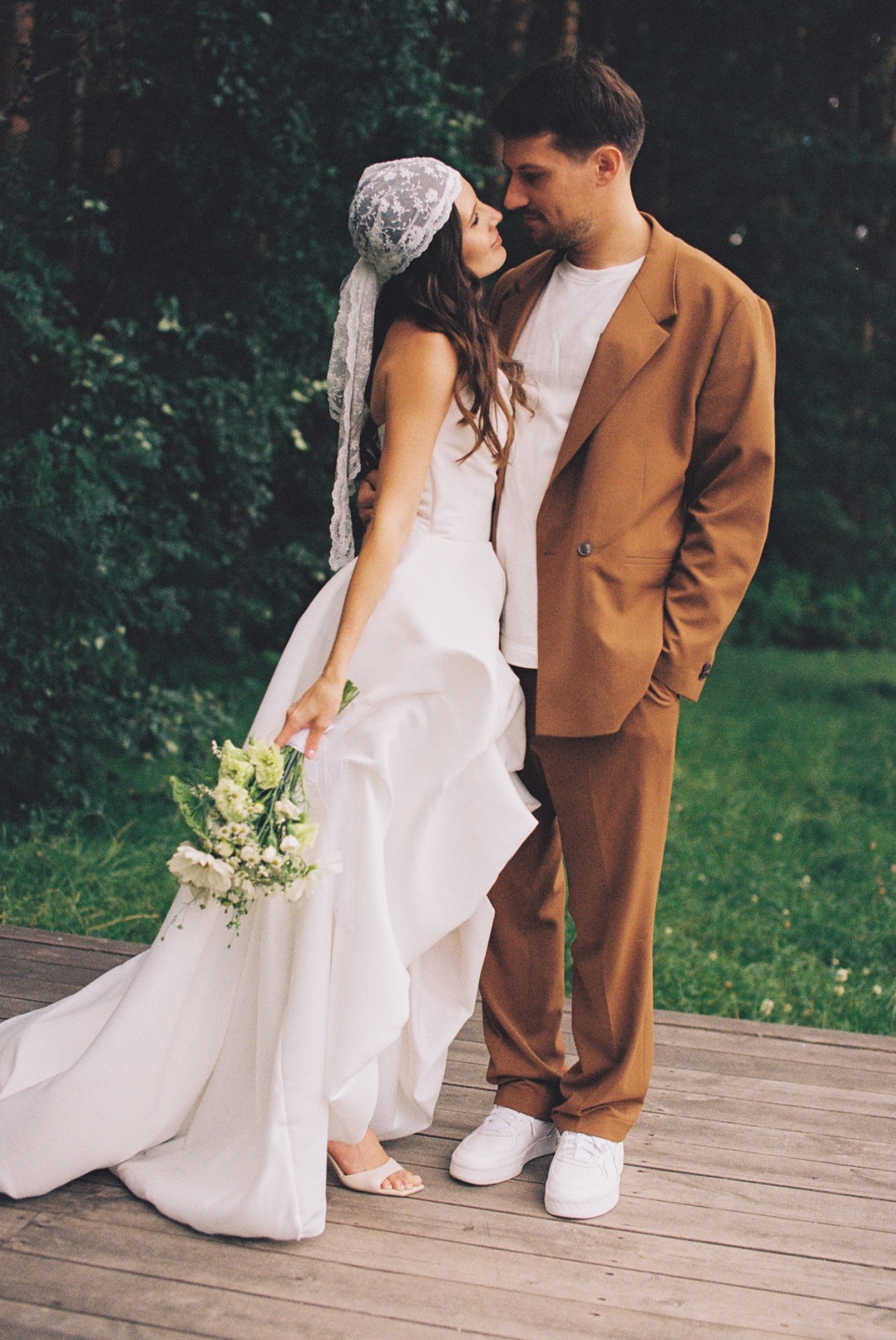 Моё платье из матового атласа было одновременно классическим и чуть нестандартным благодаря длине. Вместо традиционной фаты я выбрала кружевную бандану — трендовую деталь, которая сделала мой образ слегка хулиганским.