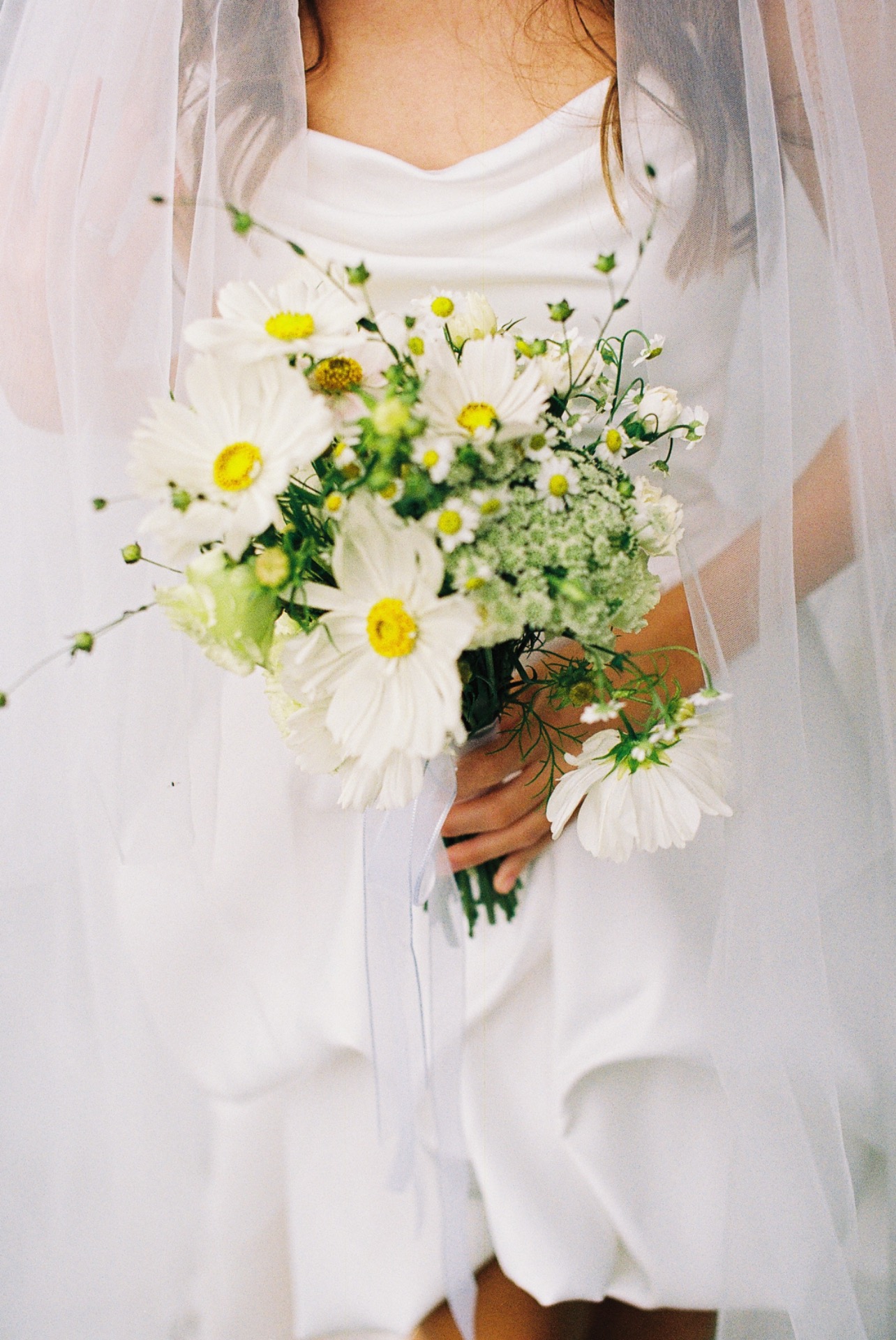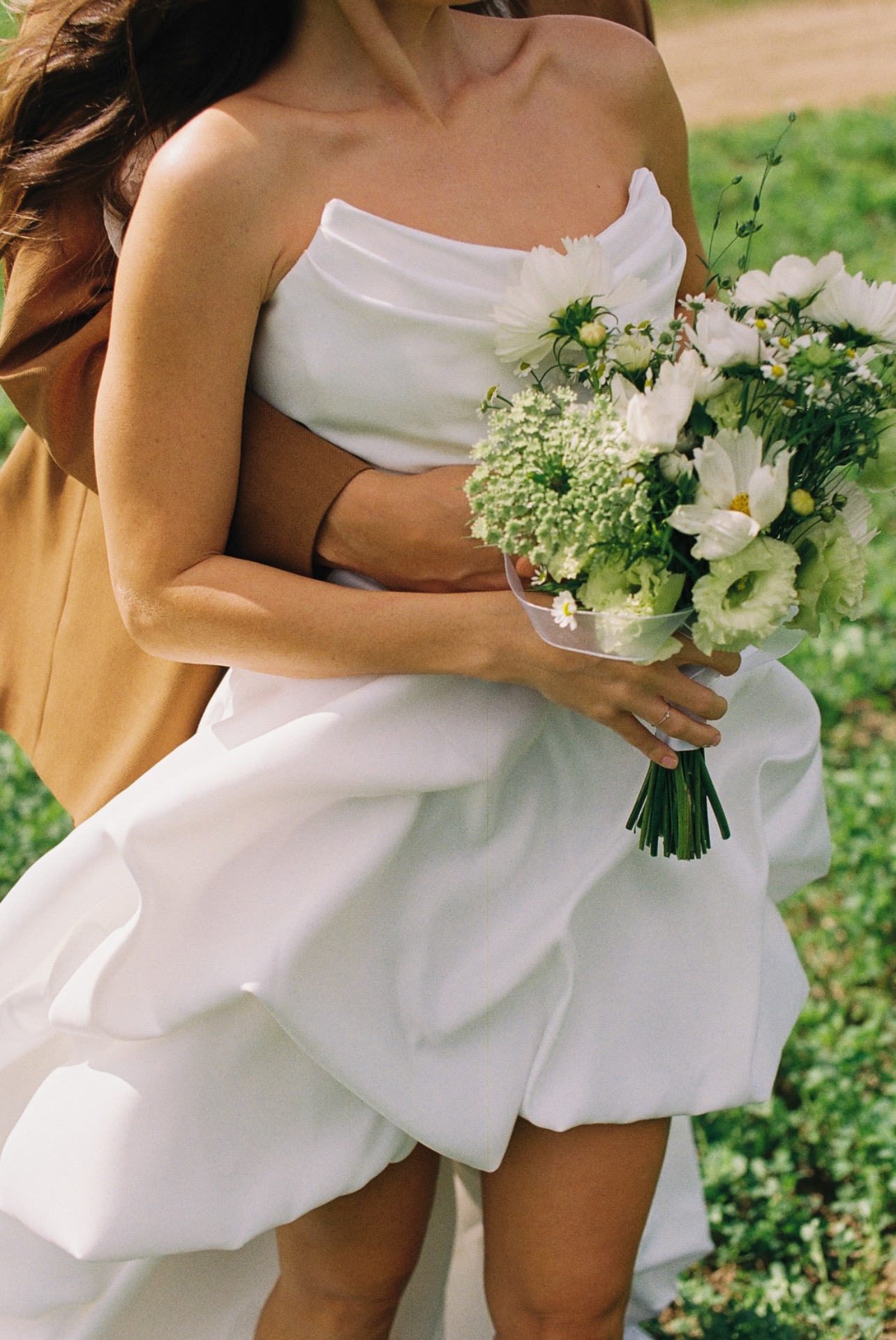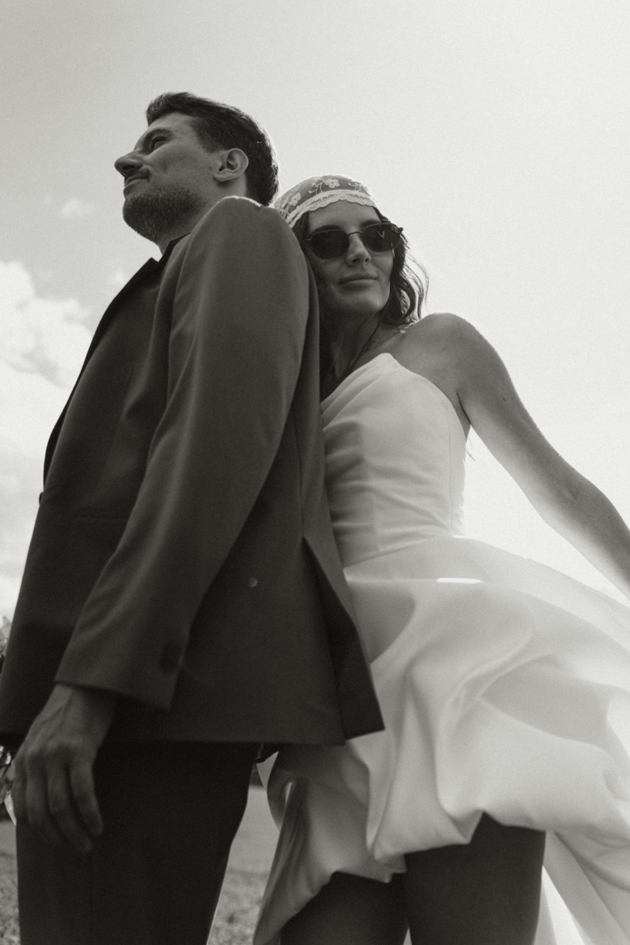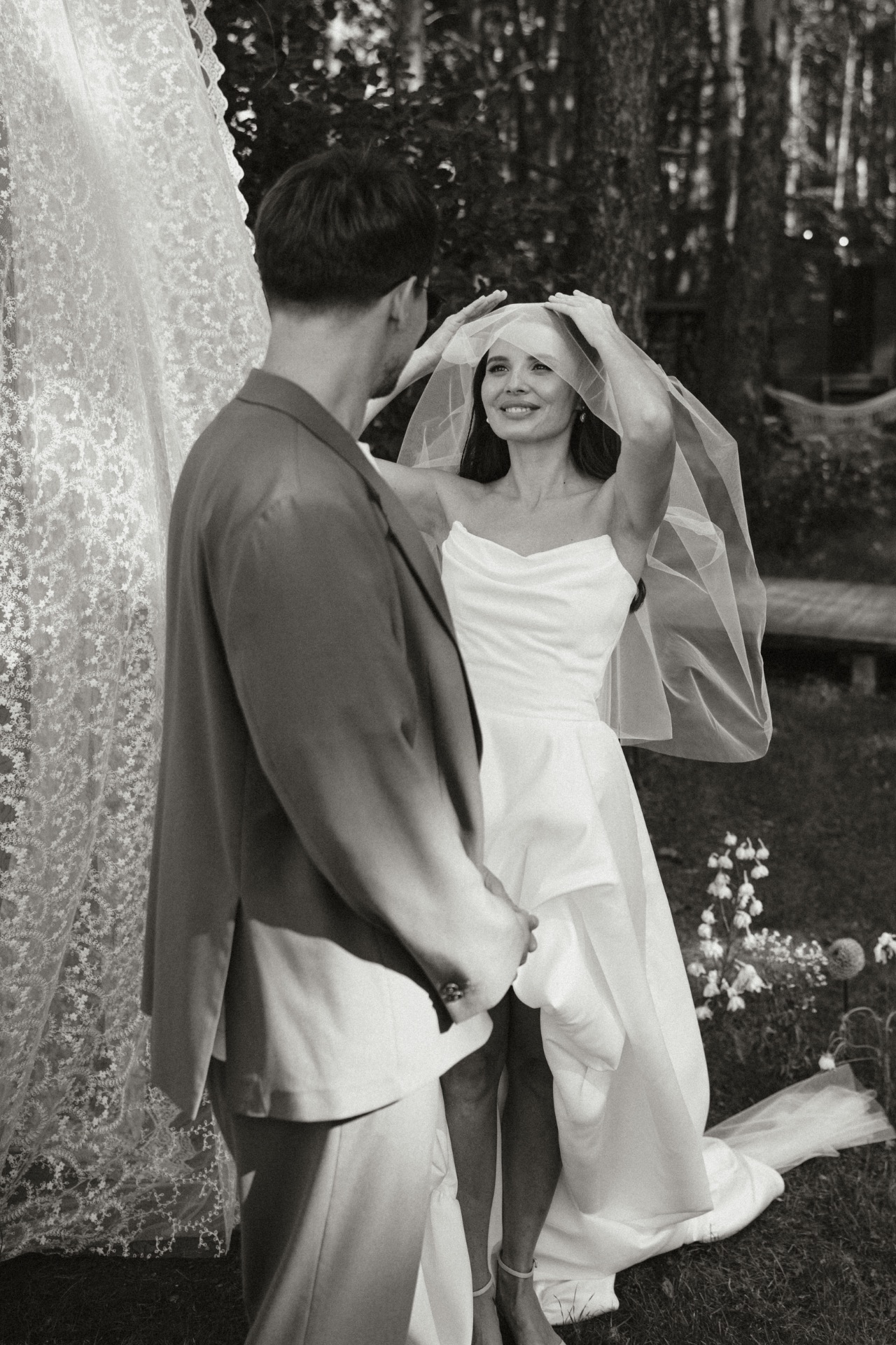 Моё платье из матового атласа было одновременно классическим и чуть нестандартным благодаря длине. Вместо традиционной фаты я выбрала кружевную бандану — трендовую деталь, которая сделала мой образ слегка хулиганским.