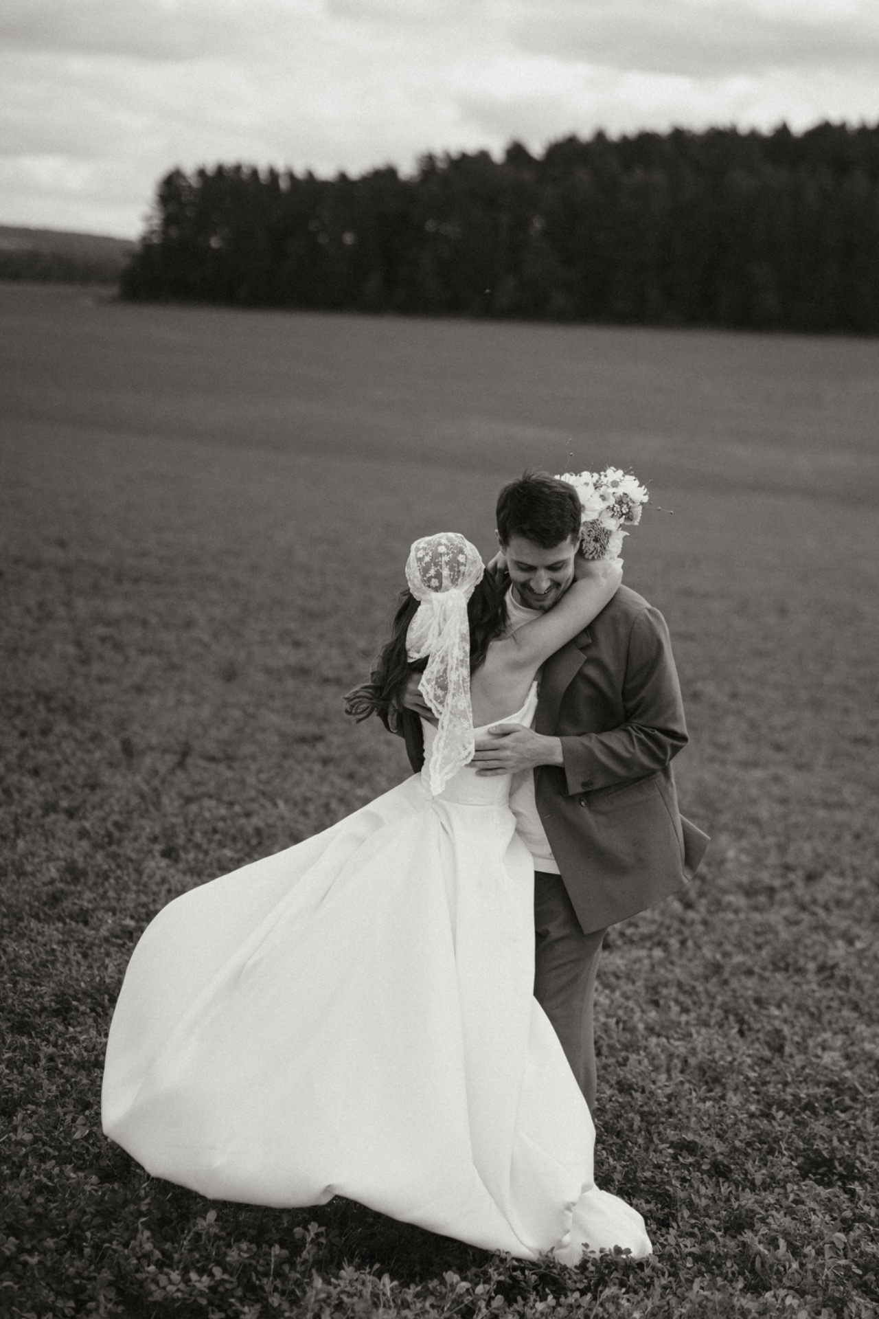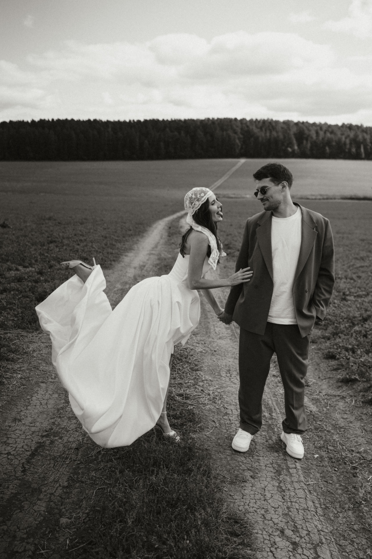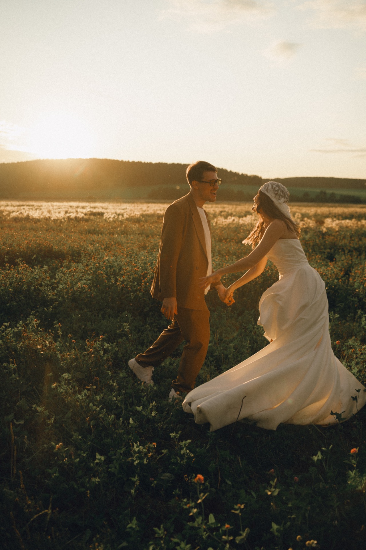 Наш праздник был достаточно ярким и насыщенным. Утро мы начали со съёмки в поле: смело, красиво и очень про нас. Вечером мы добавили серию кадров на закатном солнце в том же месте, и получилась настоящая история нашего дня в картинках.